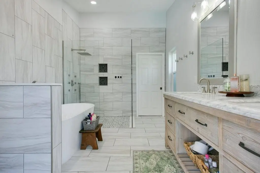 • Spa-like primary bathroom with walk-in shower and oversized tub