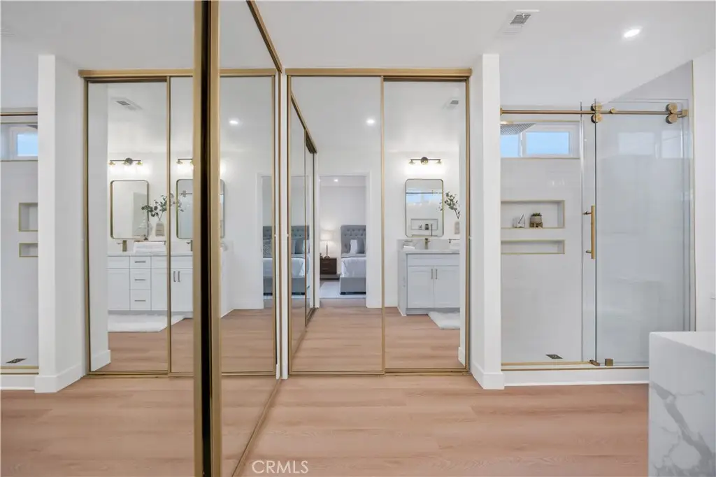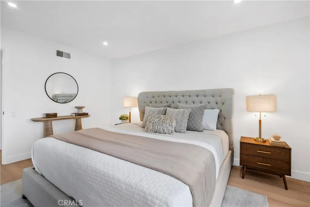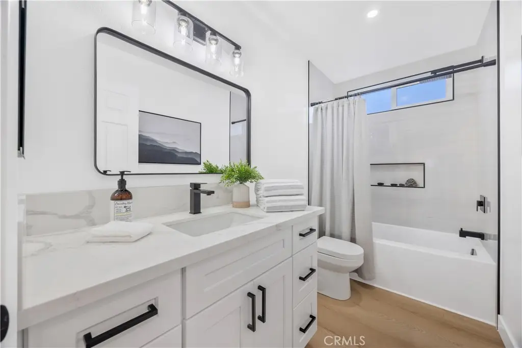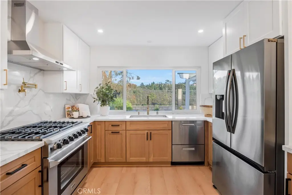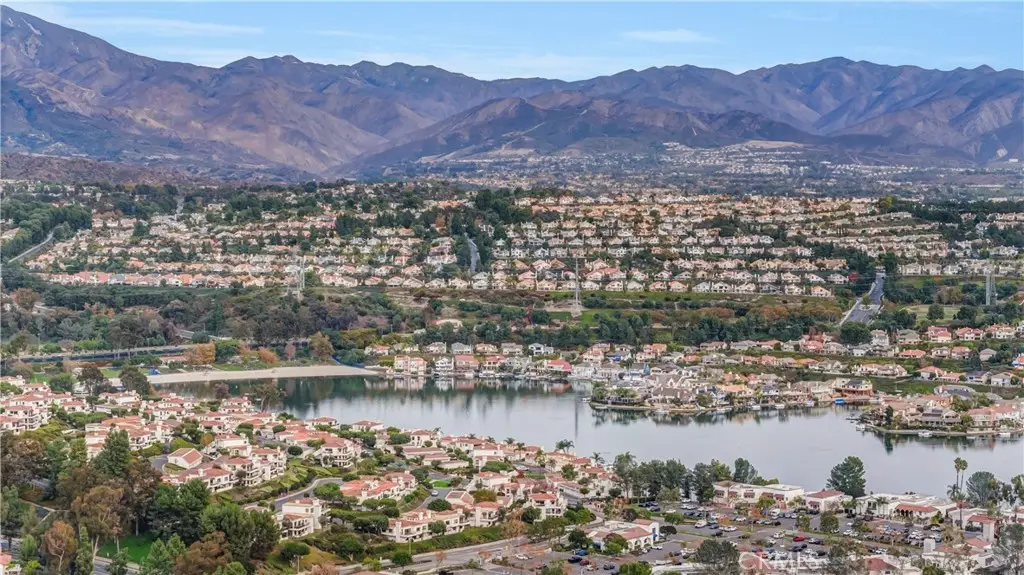 This beautifully renovated single story home sits on a quiet cul de sac in Mission Viejo and perfectly blends modern upgrades with style and functionality. Every detail has been thoughtfully designed, from energy efficient systems to designer finishes, making it a truly move in ready residence. Inside, high end waterproof hybrid laminate flooring flows seamlessly throughout, accented by modern baseboards, fresh paint, updated outlets, switches, hardware, and energy efficient LED recessed lighting. The fully remodeled gourmet kitchen showcases custom white and oak Shaker cabinetry with soft close drawers, quartz countertops with a full height backsplash and waterfall edges, ceiling height cabinets, touchless sink with pot filler, and professional grade appliances including a 36" 6 burner Thor gas range, Thor drawer microwave, Thor wine fridge, GE Profile double drawer dishwasher, Samsung refrigerator, and sleek range hood. An elegant farmhouse chandelier and updated fireplace bring warmth to the family room, while new hallway cabinetry and a high capacity washer dryer with overhead storage add convenience. The primary suite offers a spa like retreat with a walk in shower featuring oversized shampoo niches, double vanities with quartz counters, soft close cabinetry, and upgraded fixtures. All bathrooms have been fully remodeled with modern cabinets, countertops, faucets, mirrors, and low flow toilets. Each bedroom has new flooring, baseboards, paint, and lighting for a fresh, modern feel. Additional smart home features include a Nest thermostat, Ring camera doorbell, and a full PEX repipe for added peace of mind. The private backyard is fully enclosed, perfect for pets and children, and offers serene mountain views with no neighbors behind. A stylish maintenance free privacy fence with lush greenery enhances the outdoor living space. The finished two car garage has been freshly drywalled, painted, and upgraded with epoxy flooring. Residents also enjoy exclusive access to Lake Mission Viejo, featuring sandy beaches, swimming, boating, fishing, a clubhouse, and year round events. With no Mello Roos, a low HOA, and a prime location, this turnkey single story is a rare opportunity in one of Mission Viejo's most sought after neighborhoods.