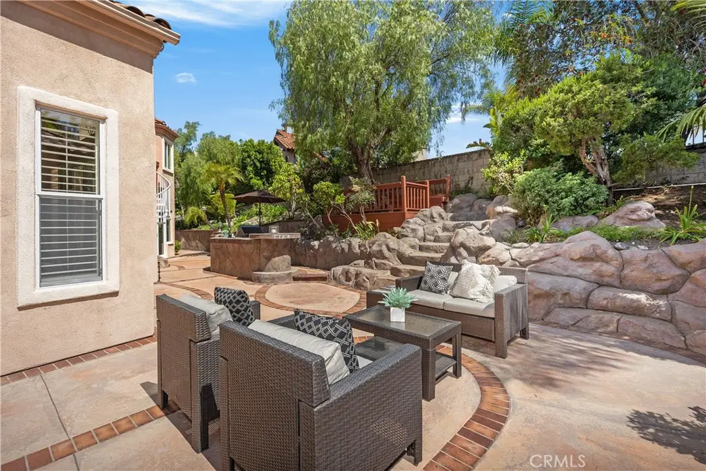 DISCOVER YOUR SANCTUARY IN THE PRESTIGIOUS CANYON CREST COMMUNITY. Embrace an unparalleled lifestyle in this exquisite five-bedroom, four-bath residence, perfectly positioned on one of the largest and most private lots within the coveted Canyon Crest community. Situated at the end of a cul-de-sac, this home offers a truly unique indoor-outdoor living experience on a sprawling 9,139 square-foot lot. As you step through the double doors, you are welcomed by a grand living & dining room, where soaring vaulted ceilings & rich hardwood floors create an immediate sense of elegance, an inviting atmosphere with natural light flooding the rooms. The heart of the home is a chef's dream. The gourmet kitchen features granite countertops, a large center island, built in Monogram refrigerator & brand new double oven. A charming breakfast nook, substantial walk-in pantry & a built-in desk area provide both storage & functional workspace. The big family room flows effortlessly into a 478-square-foot recreation room, a versatile space perfect for a game of billiards, table tennis, or a lively children's playroom. Retreat to your private sanctuary in the master suite with an attached retreat or office provides a quiet space for relaxation or work. Thoughtful modifications include an ADA-compliant downstairs bedroom & bath, bonus room has been expertly enclosed to serve as the fifth bedroom. The magic of this home extends to its resort-like backyard, an oasis designed for entertaining & tranquil escapes. A built-in BBQ and ample patio space make hosting a delight, while a charming treehouse area offers peaceful Zen corner. The opposite side of the yard captivates with a waterfall cascading among lush, mature palm trees, a custom fire pit for cozy evenings. This home is replete with desirable features, including elegant plantation shutters, three fireplaces, re-piping, a whole-house water softener, & brand-new garage doors. Beyond your private estate, the Canyon Crest lifestyle awaits. The community's multi-million-dollar recreational facility offers resort-style amenities, including two swimming pools, a spa, a baby pool, a fully equipped gym, tennis & pickleball courts. The magnificent Lake Mission Viejo is just a short distance away, offering year-round activities like boating, fishing, and swimming, along with a spectacular Fourth of July fireworks show. This is more than just a home; it's a gateway to a joyful and enriching life for the entire family.