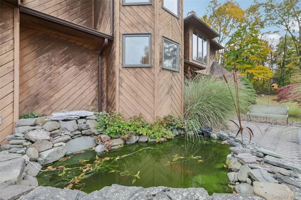 Tucked away on 8.5 acres of gently rolling land, this contemporary home is a sanctuary for those who crave space, quiet and a connection to nature. Clean lines and natural textures define the design blending seamlessly into the surrounding landscape. As you make your way up the front walkway, you are first greeted by the koi pond. Inside, the open floor plan invites light from every direction. Step through the front entry and descend into the welcoming sunken living room with its brick woodburning fireplace and designed for gathering or relaxing. A formal dining room offers a vaulted ceiling and sliders which open to the full-length patio with fire pit. The open kitchen is outfitted with stainless appliances, a generous island and breakfast/dining area which makes cooking and entertaining effortless. The stairway to the second level is framed by floor-to-ceiling architectural windows that flood the space with natural light and showcase views of the surrounding landscape.From the upstairs hallway balcony, enjoy sweeping vistas of the front entrance and dining room below, highlighting the home's open-concept design and creating a seamless flow between levels. Enter the primary suite through double French doors to a peaceful haven with spa-like bath & perfect for relaxing at the end of the day. Completing the 2nd level are three additional bedrooms & full bath. With its thoughtful layout and peaceful setting, this property offers an ideal blend of modern comfort and rural simplicity. Whether you're working remotely, hosting friends, or simply unwinding in your own slice of nature, this home provides the perfect balance of design and tranquility. A contemporary retreat that feels a world away, yet only minutes from all major roadways and conveniences. Are you ready to live in perfect harmony with nature and make this rare private estate yours!