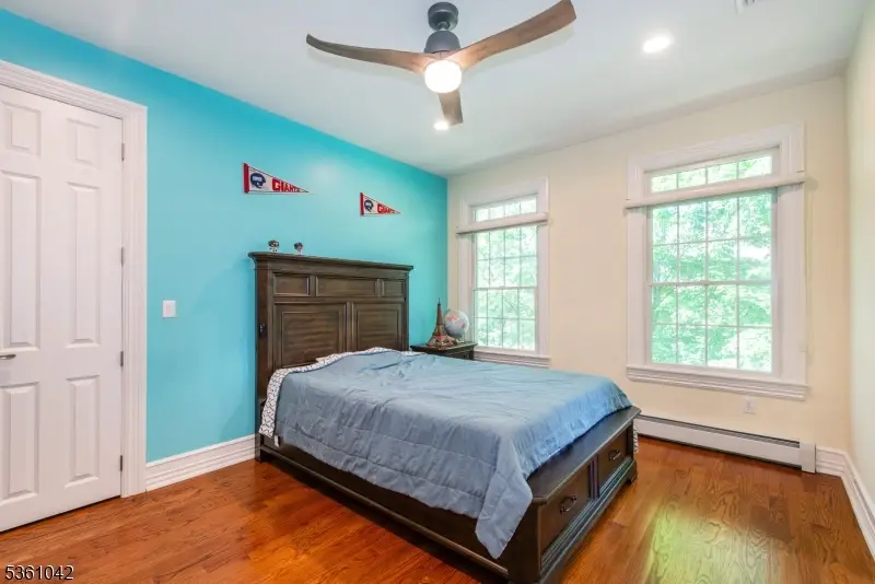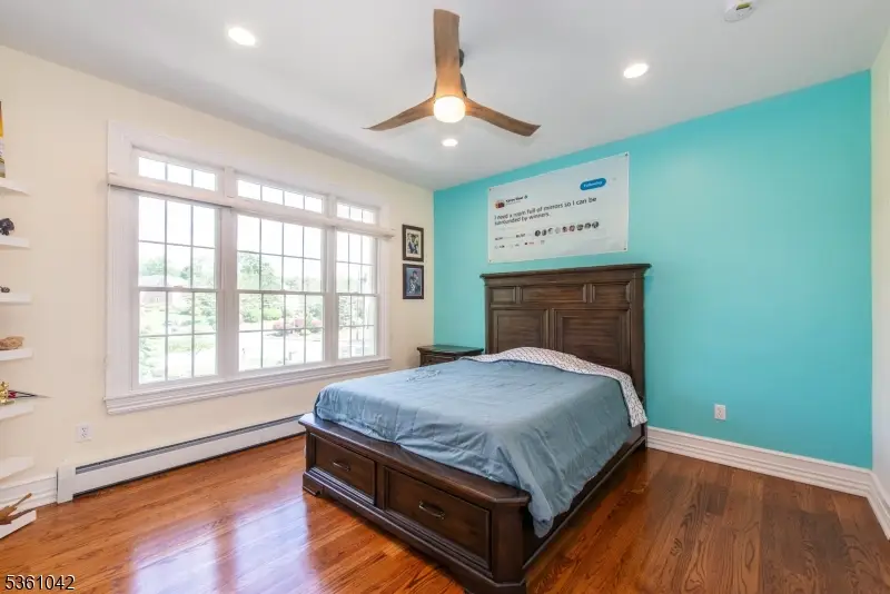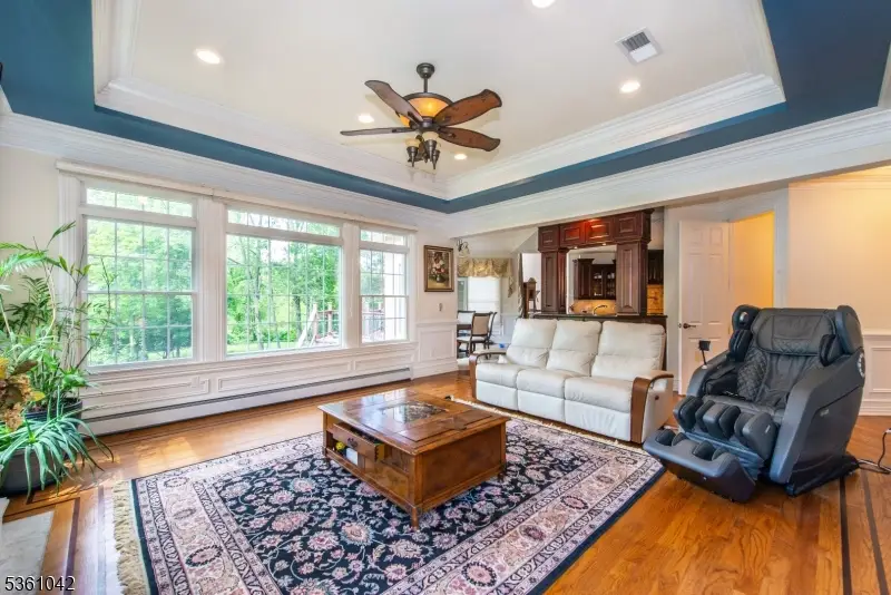 WOW factor! Discover this stunning 6-bedroom, 5.5-bath, 5.6 acre home, featuring a full brick/ stucco exterior, w/solar power, soundproof construction, circular driveway, and a 3-car garage. Built in 2010, this East-facing residence offers luxurious living with 9-foot ceilings on every floor and hardwood floors throughout, including inlaid wood accents. The two-story foyer, with chandelier adds a dramatic touch. The home includes two laundry rooms, spacious kitchen with granite countertops, a Viking 6-burner range, Sub-Zero fridge/freezer, heated tile floors, custom cabinetry, pot filler, large center island with eat-in area and formal dining room.. The family room features fireplace, custom moldings, inlaid wood floors, and coffered ceilings. A two-story living room is adorned with custom moldings, fireplace and an elegant chandelier. Additional den with double French doors and coffered ceiling and 1st fl primary suite with sitting area, walk-in closets and full en suite bathroom. Upstairs, the en suite bedroom includes an attached bath, while two additional bedrooms share a Jack-and-Jill bathroom. The bridge offers access to the 2nd fl primary suite offers high ceilings, hardwood floors, a wet bar, walk-in closet, and a luxurious custom bath with a Jacuzzi tub, double sinks, and a stand-up shower. access to a Trex deck overlooking fenced yard. The finished walkout basement has additional bath, a bedroom (currently a gym), a large rec room, and a home theater room. Four-zone AC/heat.