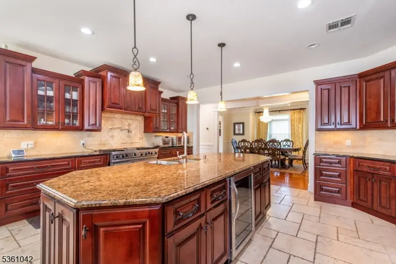 Spacious kitchen with granite countertops, Viking range, and Sub-Zero fridge