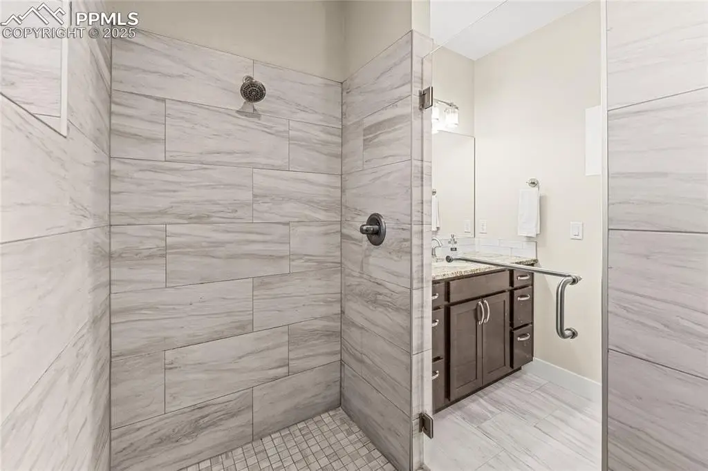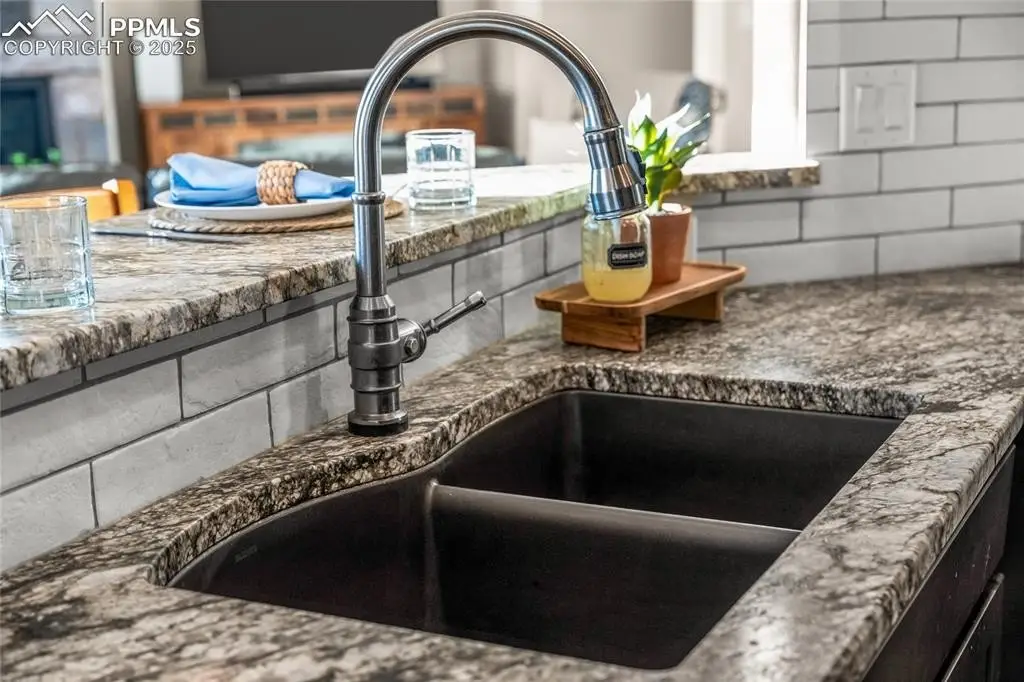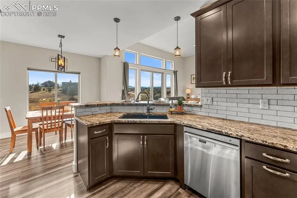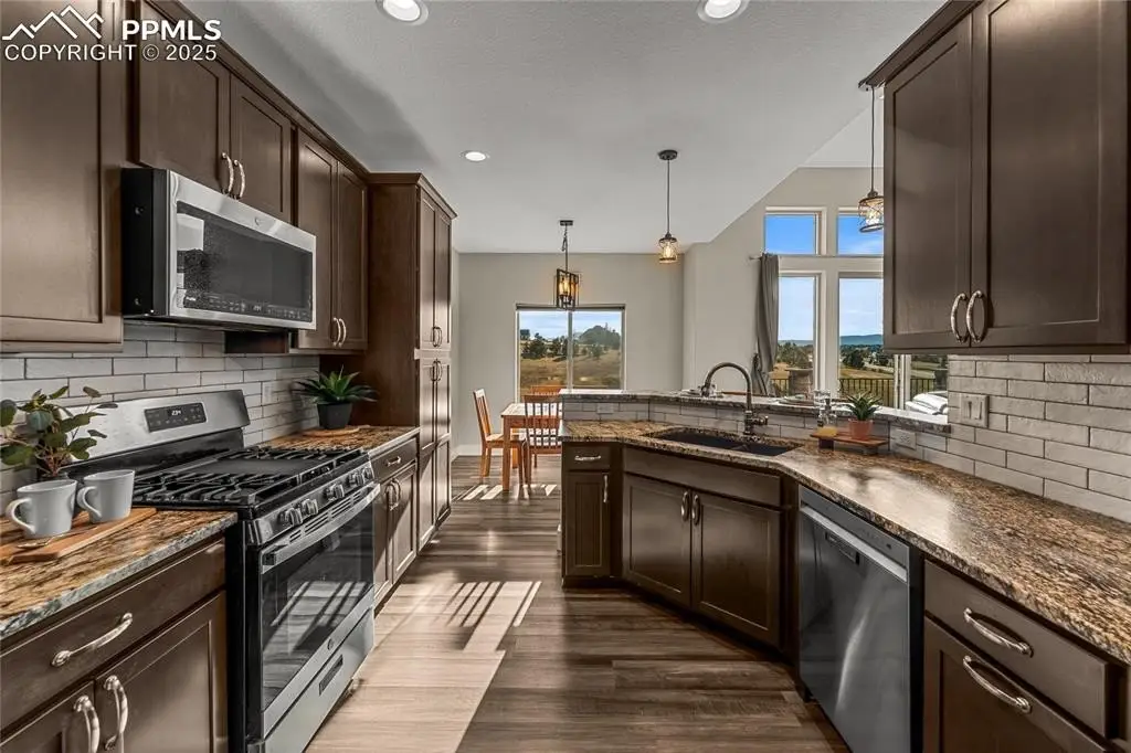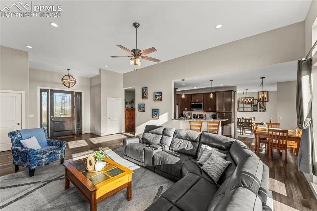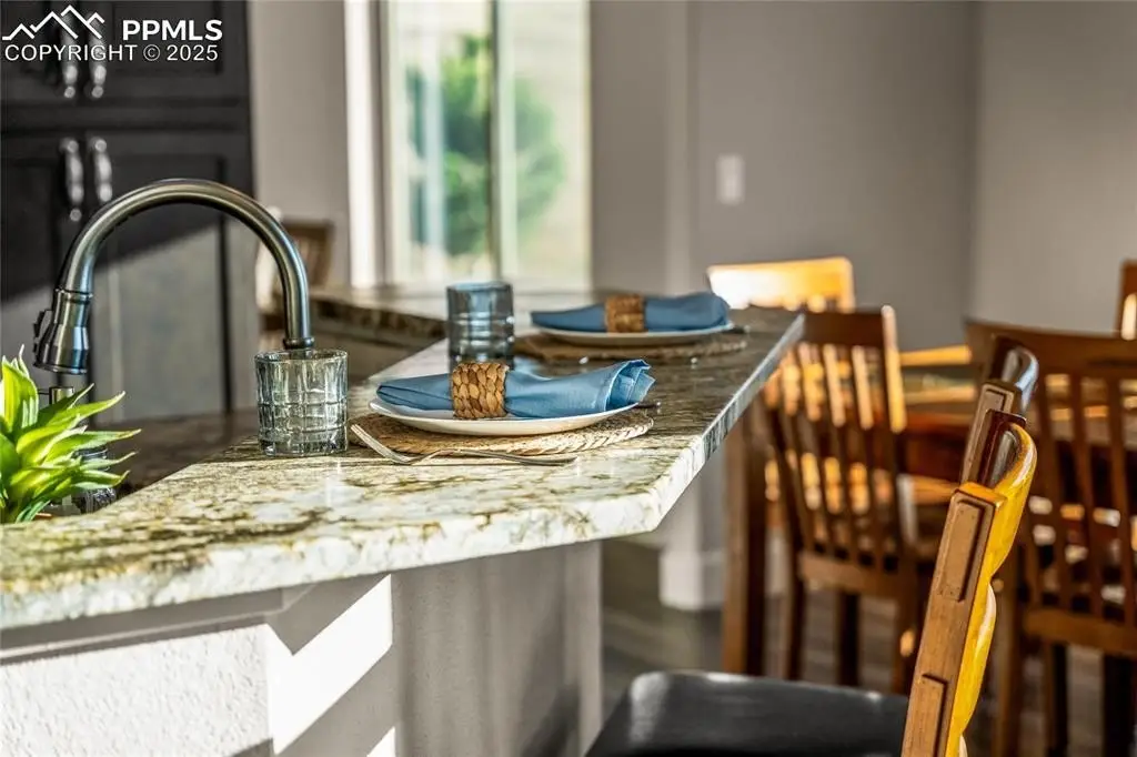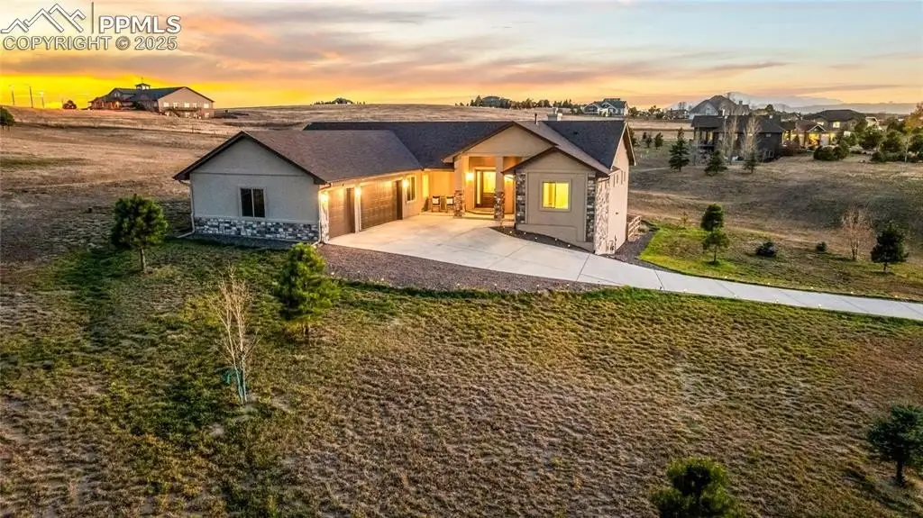 Set on 2.5 treed acres in Kings Deer Highlands, this custom-built ranch blends CO mtn architecture w/ refined modern design. The stone & stucco ext & concrete drive make a striking approach, framed by trees & open views of Pikes Peak & the front range. The location offers quiet privacy just minutes from Kings Deer Golf Course, nearby trails, & quick access to I-25 for an easy drive to both Colorado Springs & Denver. Inside, the entry opens to tall ceilings & luxury vinyl plank flring that flows seamlessly throughout the main lvl. A wall of windows captures the mountain views & fills the open great room w/ natural light. Centered around a stacked-stone fireplace w/ solid wood mantel, the space connects effortlessly to the gourmet kitchen complete w/ dining nook, expansive granite counters, gas range/oven, subway tile backsplash, SST appliances, brushed metal hardware, built-in pantry, breakfast bar, & designer pendant lighting. The adj formal dining area can serve as a bonus dining space or a flexible office/play zone depending on your needs. Step outside from the main lvl to an elevated composite deck w/ black metal railing, overlooking the surrounding open space & full front range. The oversized primary suite offers large windows framing the view, along w/ a private bath feat dual vanities & walk-in shower. 2 additional main-lvl bedrms share a Jack-and-Jill layout, each w/ its own private vanity for convenience. The laundry rm includes abundant cabinetry, sink, folding counter, & hanging rod. A wrought-iron railing leads to the unfinished walk-out basement, already plumbed w/ a bath rough-in ready for your perfect design or ideal as generous storage space. The lower level opens to a covered patio w/ concrete pad & adjacent sod area. The light-filled 3-car garage features multiple windows & ample space for vehicles or hobbies. Combining privacy, craftsmanship & views in one of Monument’s premier golf communities, this home captures the best of Colorado living.