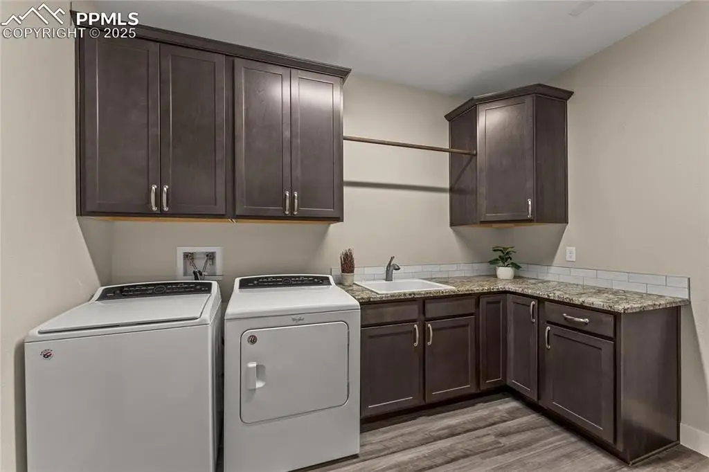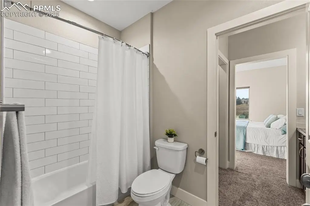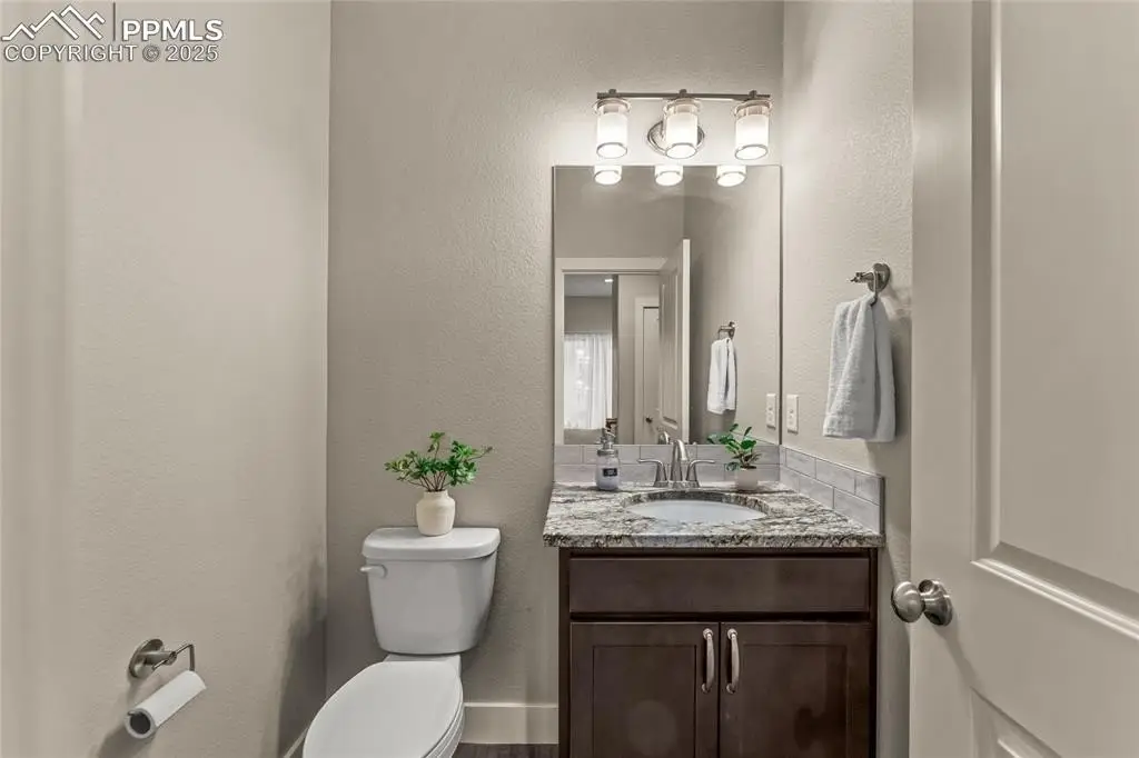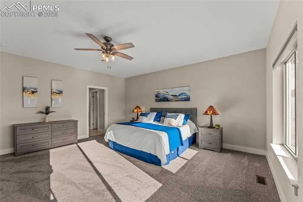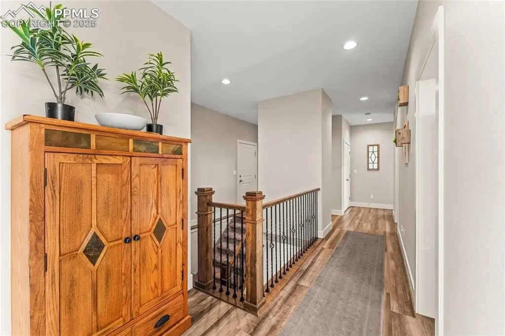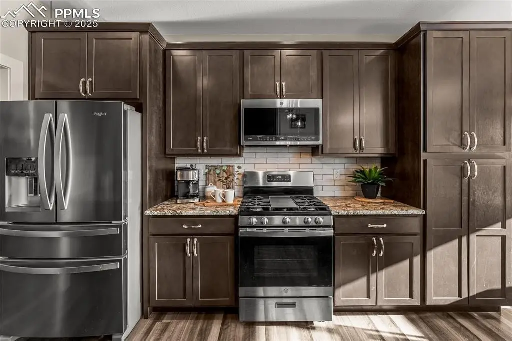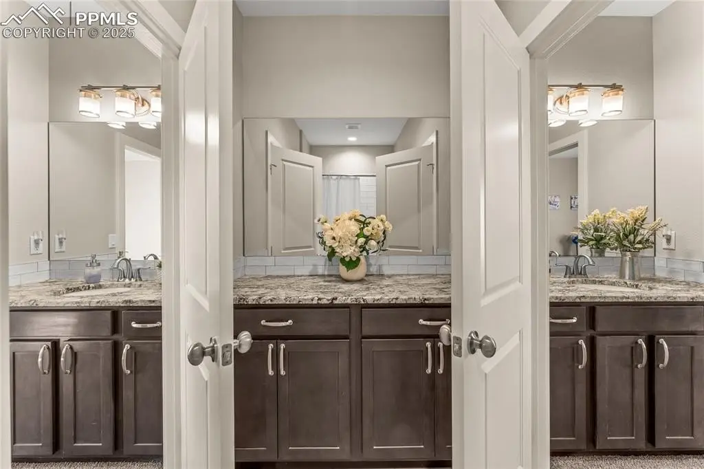 Set on 2.5 treed acres in Kings Deer Highlands, this custom-built ranch blends CO mtn architecture w/ refined modern design. The stone & stucco ext & concrete drive make a striking approach, framed by trees & open views of Pikes Peak & the front range. The location offers quiet privacy just minutes from Kings Deer Golf Course, nearby trails, & quick access to I-25 for an easy drive to both Colorado Springs & Denver. Inside, the entry opens to tall ceilings & luxury vinyl plank flring that flows seamlessly throughout the main lvl. A wall of windows captures the mountain views & fills the open great room w/ natural light. Centered around a stacked-stone fireplace w/ solid wood mantel, the space connects effortlessly to the gourmet kitchen complete w/ dining nook, expansive granite counters, gas range/oven, subway tile backsplash, SST appliances, brushed metal hardware, built-in pantry, breakfast bar, & designer pendant lighting. The adj formal dining area can serve as a bonus dining space or a flexible office/play zone depending on your needs. Step outside from the main lvl to an elevated composite deck w/ black metal railing, overlooking the surrounding open space & full front range. The oversized primary suite offers large windows framing the view, along w/ a private bath feat dual vanities & walk-in shower. 2 additional main-lvl bedrms share a Jack-and-Jill layout, each w/ its own private vanity for convenience. The laundry rm includes abundant cabinetry, sink, folding counter, & hanging rod. A wrought-iron railing leads to the unfinished walk-out basement, already plumbed w/ a bath rough-in ready for your perfect design or ideal as generous storage space. The lower level opens to a covered patio w/ concrete pad & adjacent sod area. The light-filled 3-car garage features multiple windows & ample space for vehicles or hobbies. Combining privacy, craftsmanship & views in one of Monument’s premier golf communities, this home captures the best of Colorado living.