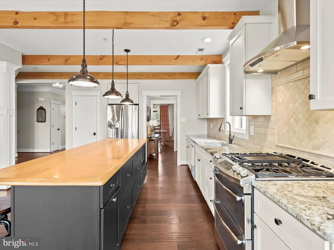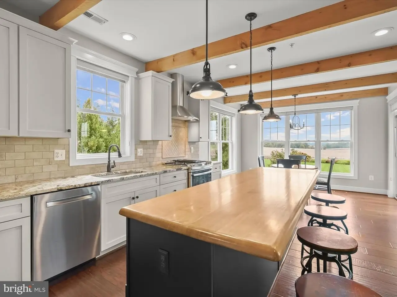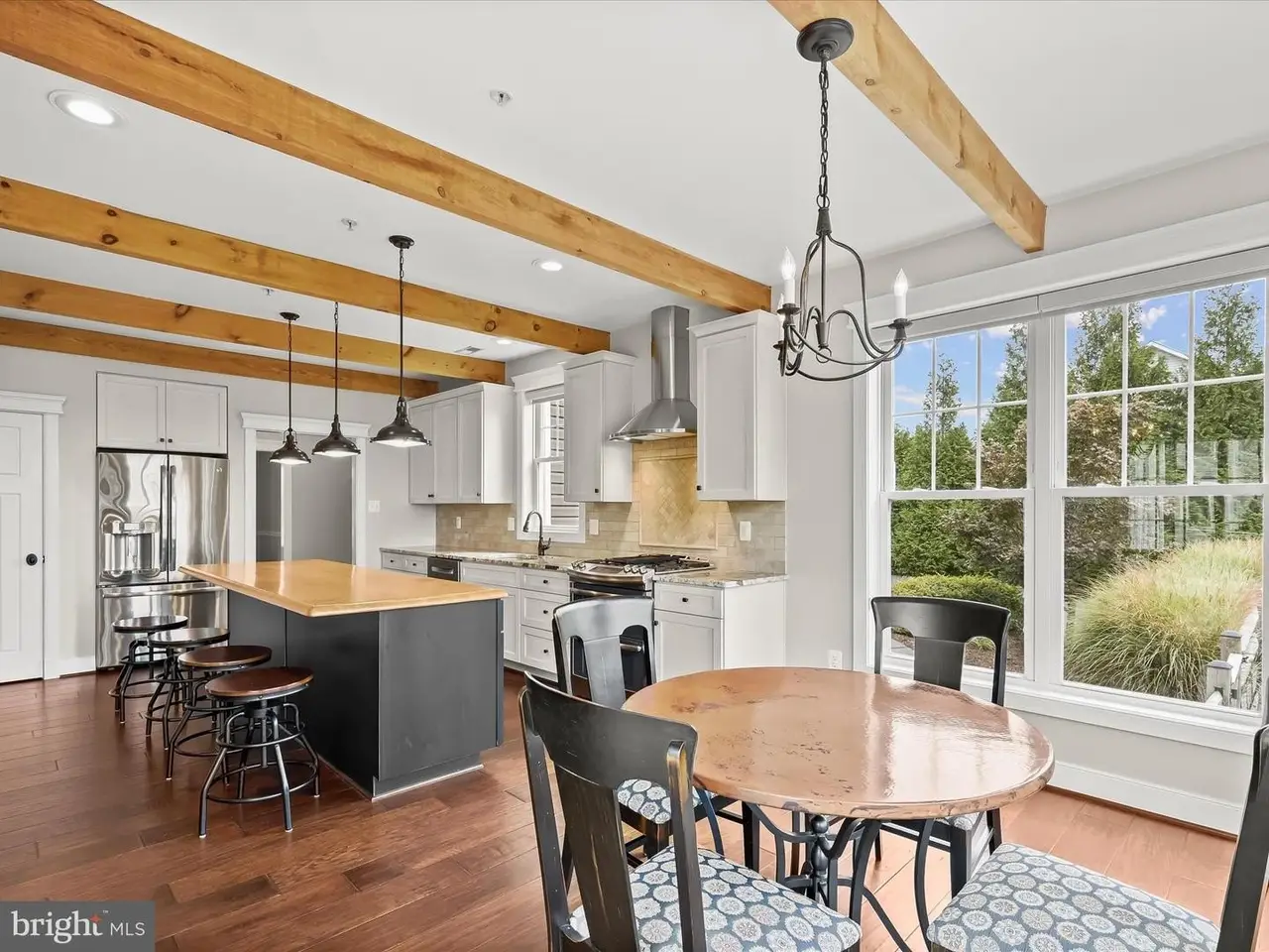 Chef's eat-in kitchen with exposed wood beams