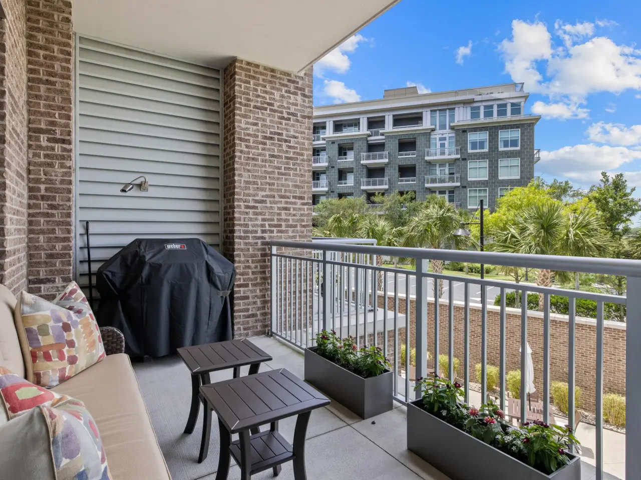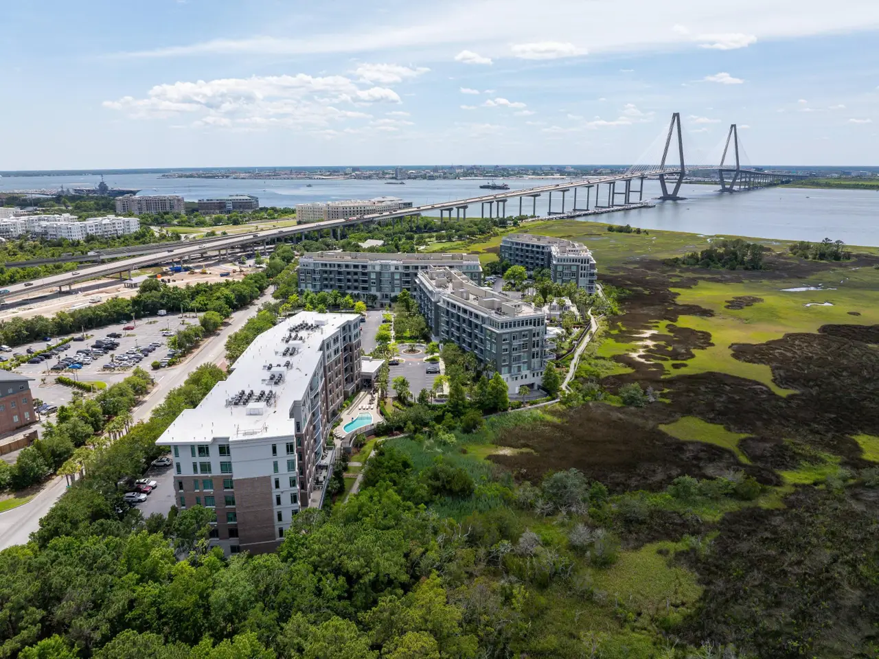Chic, desirable Tides IV, professionally designed, totally turn-key residence with marsh views from your own private terrace. This sophisticated two bed, 2.5 bath plan is in like-new condition, only used seasonally. Designer upgrades to convey, plus window treatments, all appliances, and marble counters. Enjoy the upscale lifestyle at the newly built Tides IV. Entering the lobby, the elevator offers access directly to your residence -- no common hallways. The open, bright floor plan features a separate dining area, wet bar and beautifully designed kitchen. The spacious living room offers a rare fireplace, making furniture arrangement easy and logical. The primary suite features a fitted walk-in closet, tray ceilings, dual sinks, and a separate soaking tub. The second bedroom is complete with tray ceilings and a large en suite bath. Garage parking, with additional storage. The Tides IV includes a well-equipped fitness center, owners retreat, pool and grilling area. Fine restaurants, shopping, and a Whole Foods are all nearby. The location offers easy access to historic Downtown Charleston, area hospitals, and minutes to nearby beaches.
