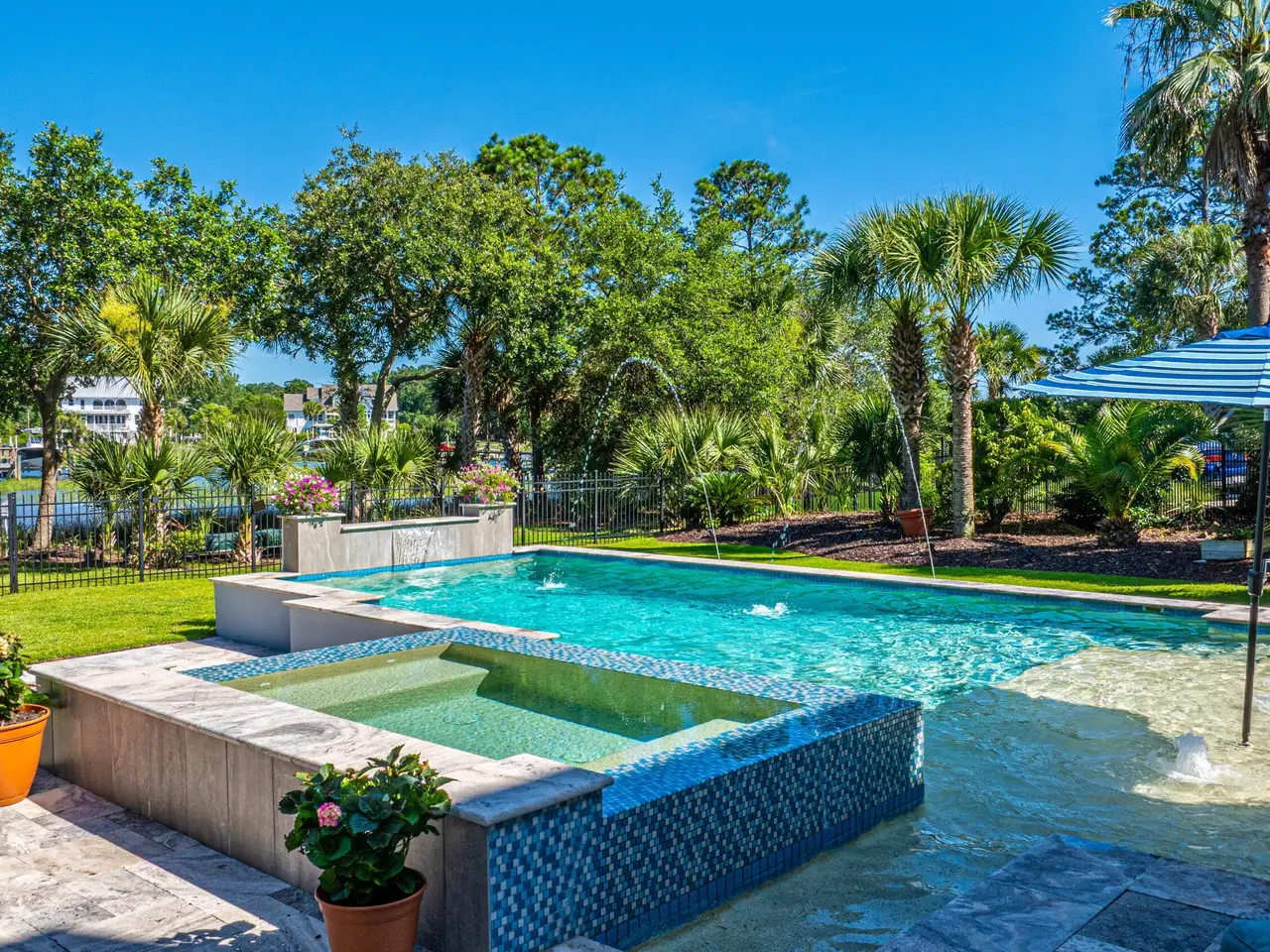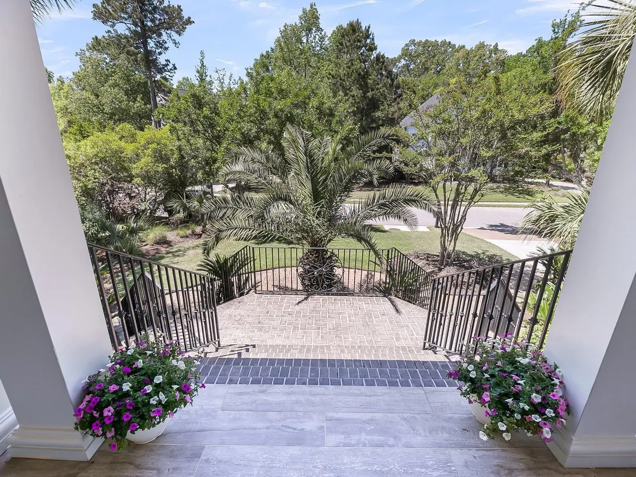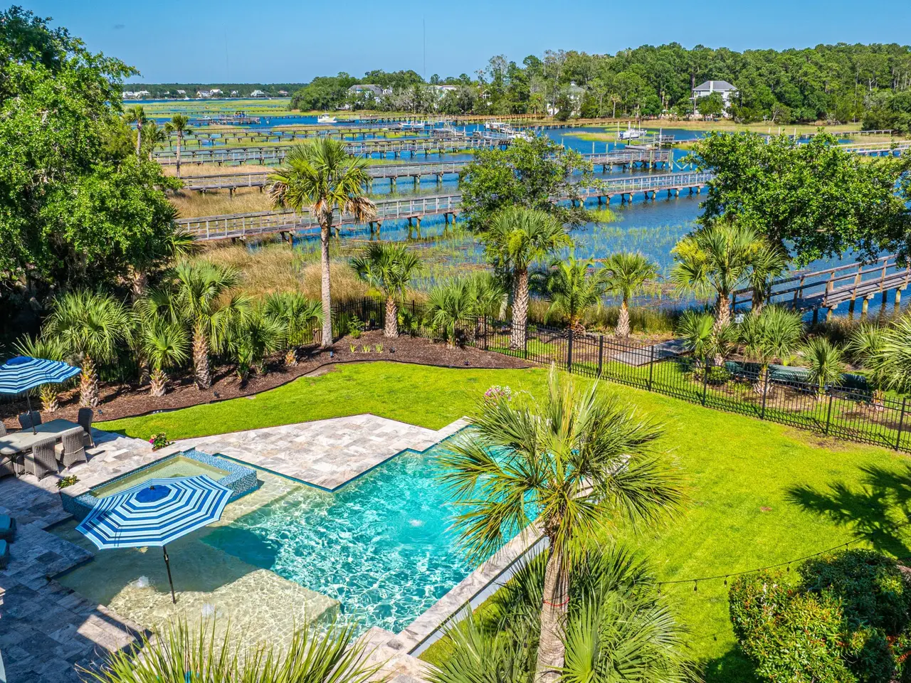 If you've been dreaming of panoramic waterfront views framed by swaying palms and a sparkling saltwater pool with spa, this custom designed Lowcountry retreat is your dream come true. From the moment you arrive, you're welcomed by a grand double staircase encircling a signature palm tree and custom-welded wrought iron railings. Gas lanterns frame a stunning solid mahogany entry door, setting the tone for the elegance and craftsmanship found throughout the home. Thoughtfully designed to capture the beauty of its setting, the open-concept main floor flows effortlessly from a dramatic double-story foyer into the great room, kitchen, breakfast area, and spacious primary suite--all opening to a large, screened porch with breathtaking views of the water and pool. A Butler's Pantry leads tothe formal dining room, and a walk-in laundry, pantry, and powder room complete the main living level. The great room features a coffered 10' ceiling, a gas fireplace with custom built-ins, and a wall of windows and French doors bringing the outdoors in. The gourmet kitchen boasts a large island, custom cabinetry, and premium Jenn-Air appliances including a 48" refrigerator, 6-burner gas cooktop, and beverage cooler. Enjoy waking every morning to a serene waterfront sunrise view from the expansive primary suite, complete with dual walk-in closets, a soaking tub, separate vanities, and a luxurious walk-in shower. Upstairs, four oversized bedrooms (two with ensuite baths, two with a shared Jack and Jill bath), a second laundry room, and a versatile bonus room with a private sun deck offer comfort and flexibility for family and guests. Outside, paradise awaits. The heated and cooled saltwater pool with integrated spa, sun shelf, fountains, and water features is a showstopper. The spacious patio invites sunbathing, entertaining, and peaceful relaxation, all while overlooking your private dock with boat lift and floater, perfect for swimming, fishing, or exploring the waterways by boat! The ground level offers a finished suite with full bath, large living area, second 48" refrigerator, additional storage closet, a walk-in storage room, enclosed workshop, and 3-car garage. Park West Amenities, paved walking paths throughout the community, 3 primary to middle schools, and a Mount Pleasant Recreation complex offer the perfect setting for families! Located in the heart of the Lowcountry, this home is a rare opportunity to own a waterfront sanctuary that seamlessly blends casual elegance, generous space, and the best of indoor-outdoor living!