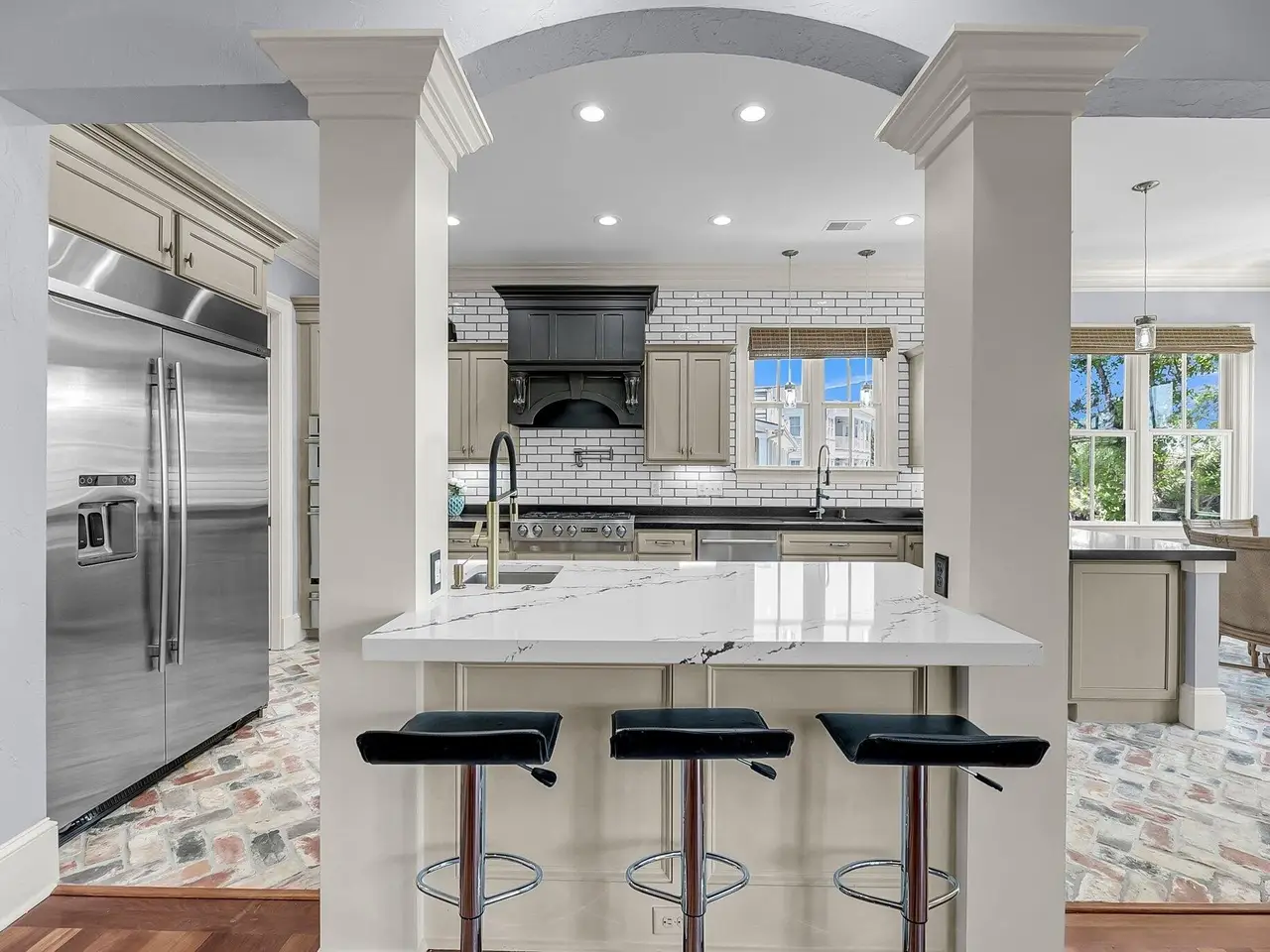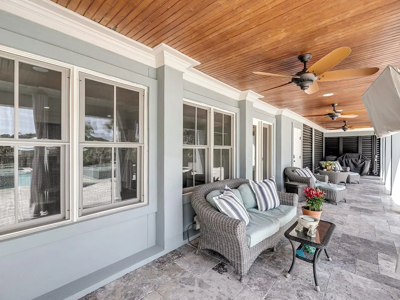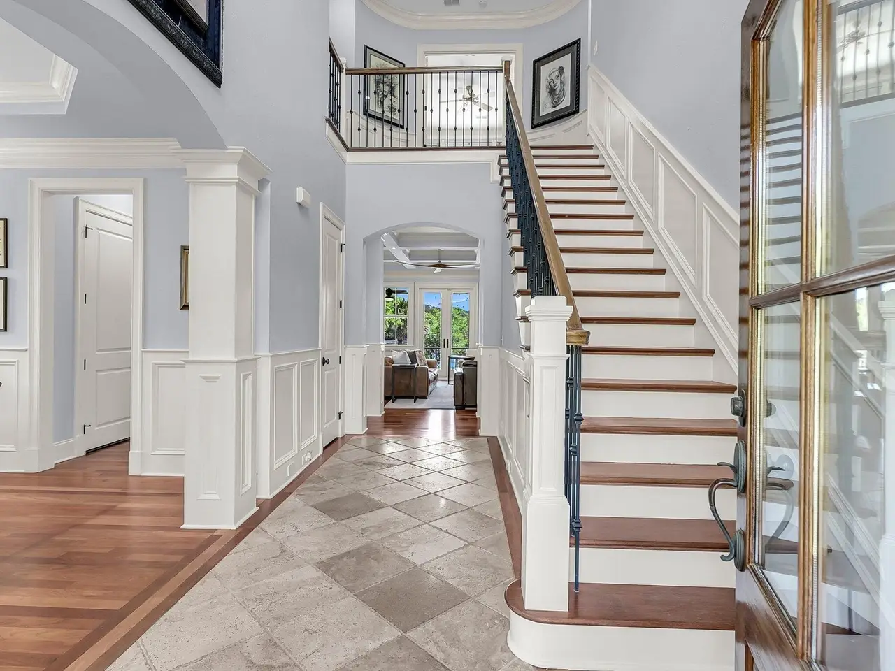 If you've been dreaming of panoramic waterfront views framed by swaying palms and a sparkling saltwater pool with spa, this custom designed Lowcountry retreat is your dream come true. From the moment you arrive, you're welcomed by a grand double staircase encircling a signature palm tree and custom-welded wrought iron railings. Gas lanterns frame a stunning solid mahogany entry door, setting the tone for the elegance and craftsmanship found throughout the home. Thoughtfully designed to capture the beauty of its setting, the open-concept main floor flows effortlessly from a dramatic double-story foyer into the great room, kitchen, breakfast area, and spacious primary suite--all opening to a large, screened porch with breathtaking views of the water and pool. A Butler's Pantry leads tothe formal dining room, and a walk-in laundry, pantry, and powder room complete the main living level. The great room features a coffered 10' ceiling, a gas fireplace with custom built-ins, and a wall of windows and French doors bringing the outdoors in. The gourmet kitchen boasts a large island, custom cabinetry, and premium Jenn-Air appliances including a 48" refrigerator, 6-burner gas cooktop, and beverage cooler. Enjoy waking every morning to a serene waterfront sunrise view from the expansive primary suite, complete with dual walk-in closets, a soaking tub, separate vanities, and a luxurious walk-in shower. Upstairs, four oversized bedrooms (two with ensuite baths, two with a shared Jack and Jill bath), a second laundry room, and a versatile bonus room with a private sun deck offer comfort and flexibility for family and guests. Outside, paradise awaits. The heated and cooled saltwater pool with integrated spa, sun shelf, fountains, and water features is a showstopper. The spacious patio invites sunbathing, entertaining, and peaceful relaxation, all while overlooking your private dock with boat lift and floater, perfect for swimming, fishing, or exploring the waterways by boat! The ground level offers a finished suite with full bath, large living area, second 48" refrigerator, additional storage closet, a walk-in storage room, enclosed workshop, and 3-car garage. Park West Amenities, paved walking paths throughout the community, 3 primary to middle schools, and a Mount Pleasant Recreation complex offer the perfect setting for families! Located in the heart of the Lowcountry, this home is a rare opportunity to own a waterfront sanctuary that seamlessly blends casual elegance, generous space, and the best of indoor-outdoor living!