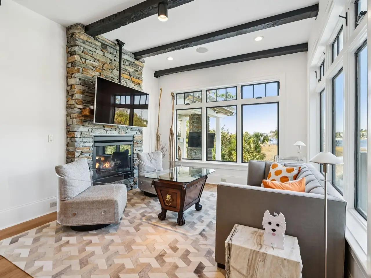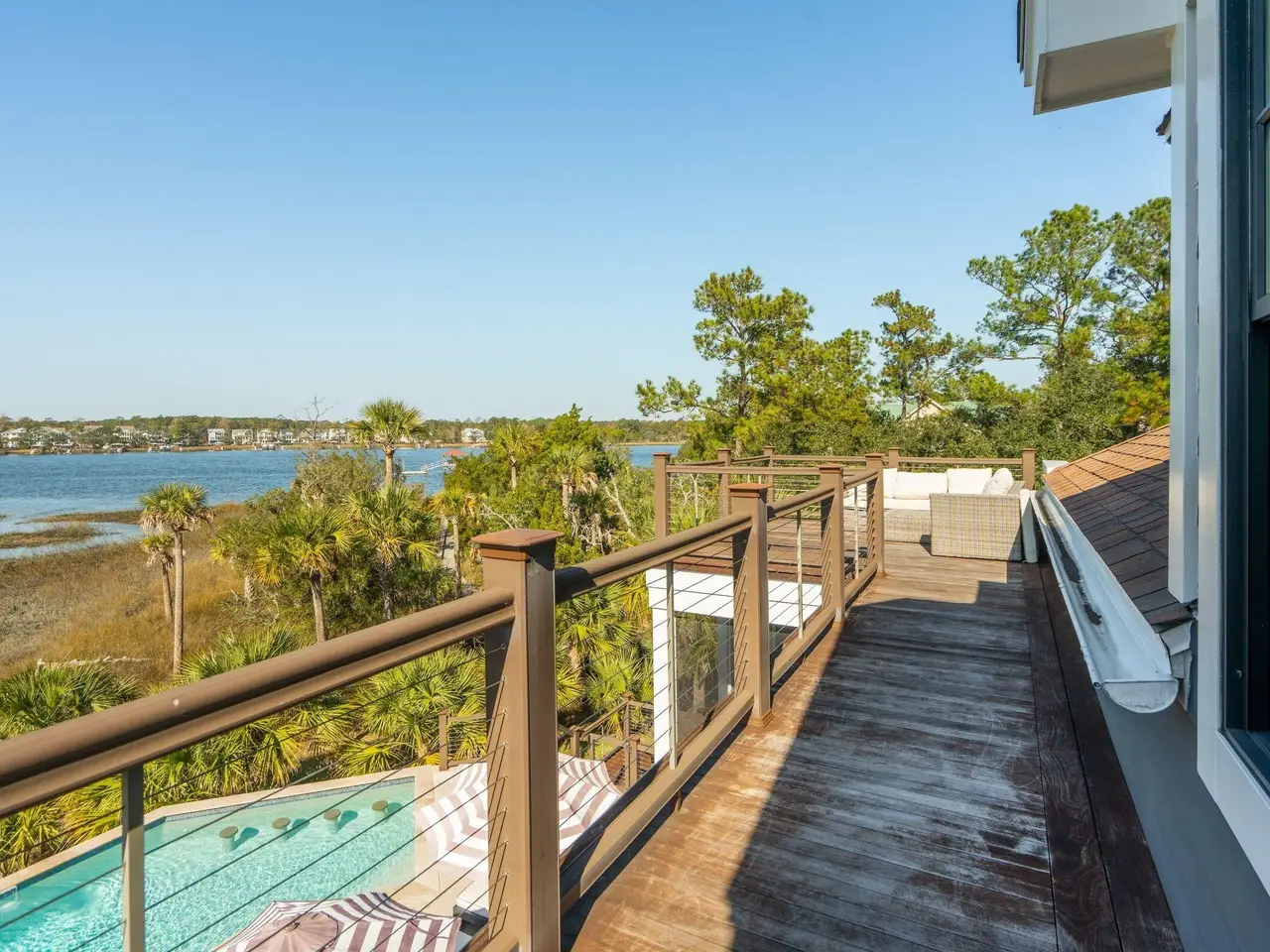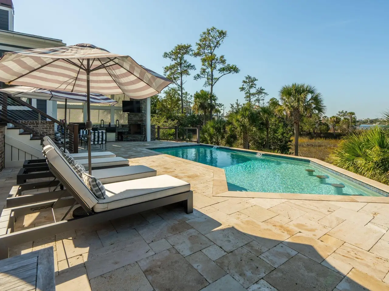 Experience the very best of Charleston waterfront living in this one-of-a-kind private estate. Nestled on a 1.55-acre lot along the Wando River within exclusive Dunes West, this breath-taking custom-built home blends modern elegance with the timeless charm of the Lowcountry. The property features a deep-water covered dock with a 10,000lb boat lift with a ''walk around'' platform, plus a large floater. Upon entering the home, you are immediately greeted by panoramic views of the Wando River. The interior features rich matte finished hickory floors and expansive windows that fil the space with natural light, creating a warm and inviting atmosphere.The gourmet kitchen is designed for both comfort and entertaining, showcasing a large center island, stainless steel appliances, a new 48-inch LG refrigerator, wine cooler, a Wolf gas range with double ovens, and an elegant wine bar - perfect for hosting gatherings or enjoying quiet evenings at home. The primary suite is located on the main level and features a gas fireplace and more breathtaking river views. The spa-inspired ensuite bathroom is complete with an oversized walk-in shower that opens to the dressing room. Recently updated, this impressive space includes a custom organizational system, designer lighting, and the convenience of in-suite laundry. Upstairs, you'll find three spacious bedrooms, each with its own private full bath and a second laundry room. From this level, a spiral staircase leads to a hidden loft-style retreat - a charming and versatile space ideal for reading, relaxation, or simply enjoying the views of the Wando River. The basement level features a media/game room with surround sound, a full bathroom, a custom mudroom, workshop, gym and climate-controlled storage. 3 car garage and an elevator to the above floors complete this level. Just off the main living room, step outside to your backyard oasis, where luxury and leisure meet. The expansive two-level terrace showcases a stunning heated saltwater pool surrounded by travertine tile, an outdoor kitchen with cooktop and gas grill for dining al fresco. A charming lit walkway leads directly to your private dock, completing this extraordinary waterfront retreat.