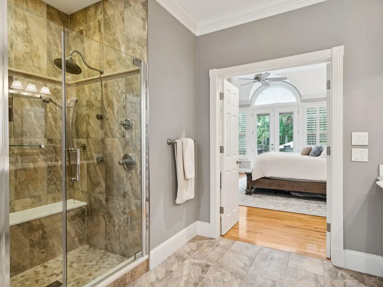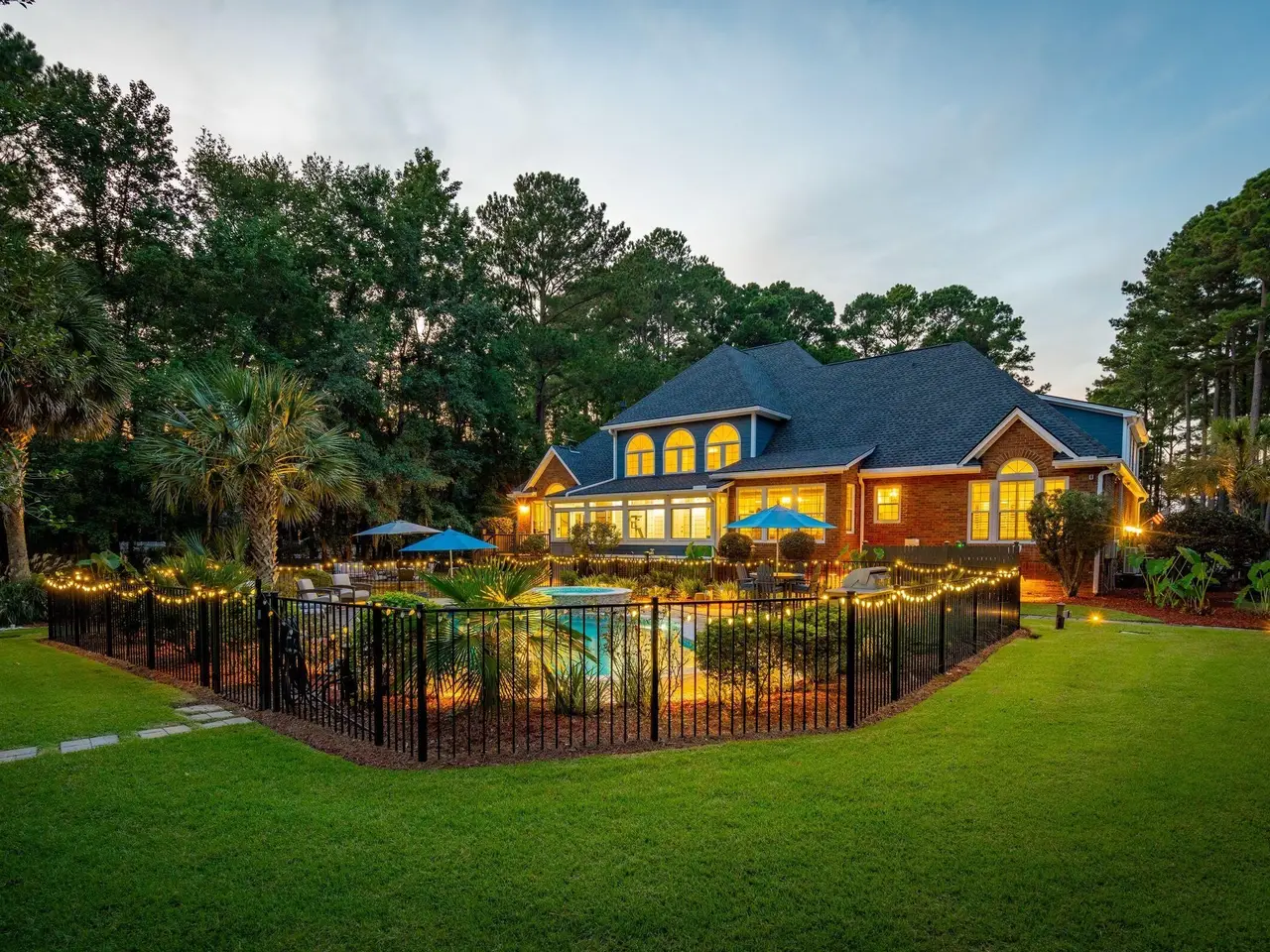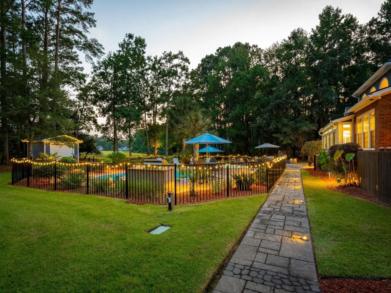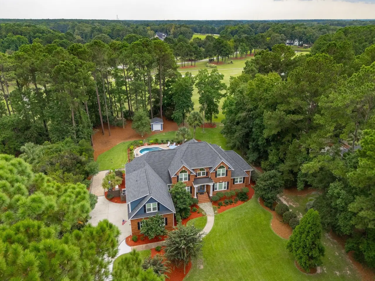 Welcome to your serene retreat in the heart of the Lowcountry. Nestled on a pristine one+-acre site along the golf course, this stunning Southern estate is a showcase of elegant design, tranquil views, and exceptional indoor-outdoor living. Step into a soaring foyer that opens to a panoramic view of the #15 Fairway through the expansive Great Room, adorned with elegant built-in bookshelves and a cozy gas fireplace. A sunroom, just beyond, invites you to relax with coffee or cocktails while soaking in the natural beauty of the landscaped grounds and coastal wildlife.This home was designed for gracious entertainment. The formal dining room easily seats a large gathering, and the adjacent formal living room provides a refined space for after-dinner conversation.The chef's kitchenboasts upgraded cabinetry, granite countertops and backsplash, new LG Studio appliances, and a generous island. An inviting Eat-in area comfortably seats six and offers peaceful views of the backyard oasis. The main level includes a walk-in Laundry Room, Powder Room, and two spacious suites. The Primary Suite features French doors opening to the rear deck, where views of the golf course, pond, and custom courtyard and pool provide a daily deserved escape. The spa-inspired bath includes dual vanities with tower storage, a walk-in shower, soaking tub, and a large walk-in closet. A second suite enjoys views of the sparkling pool and includes its own ensuite bath, perfect for guests or multi-generational living. Upstairs, you'll find two additional bedrooms and baths, along with a spacious suite featuring a Private Bar with Mini Fridge, Media/Game Room, and a separate 5th Bedroom with Full Bath, ideal for hosting, relaxing, or creating a private apartment-style space. Throughout the home, you'll find rich red oak flooring, plantation shutters, crown molding, generous linen closets, and abundant walk-in storage. The outdoor living area is truly a showstopper! It features a custom shaped Pool with Waterfall, Spa & Sun Lounge, a built-in Gas Grill and generous Techo Block Patio areas for poolside dining and entertaining, has custom ambient lighting, and a custom built 12x12 Shed with electrical and Wifi. This home offers the perfect balance of luxury, privacy, and Southern charm, an exceptional Lowcountry lifestyle awaits!