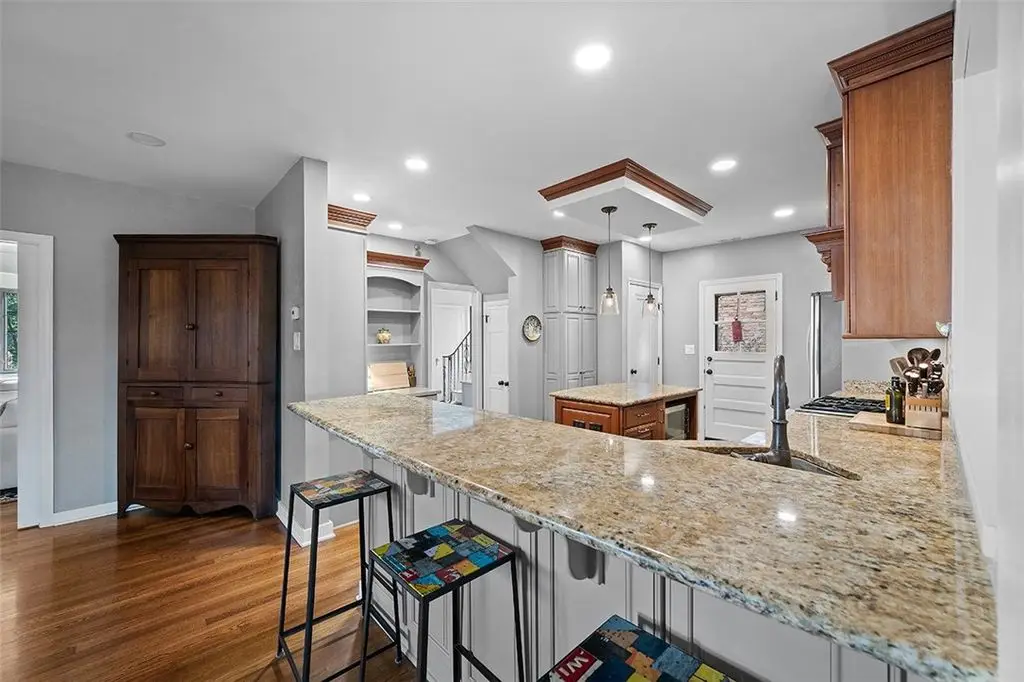 Charming brick Tudor sitting on a picturesque brick street offering 3 finished lvls of living space. Sun-filled rooms & timeless details include a 12' wdw seat tucked in a bowed LR wdw, HW that continue upstairs & wood-burning frpl. Pocket doors from LR lead to open concept DR & kit w/peninsula, isle & quaint corner desk- perfect for coffee or baking station. Sizeable family rm extends off the kit/DR highlighted by a huge triple window looking out to private, flat yard plus French door leading to 23x13 covered patio- ideal for outdoor entertaining. 3 comfortable 2nd lvl bedrms, including a primary ste w/updated en suite, 2 walk-in closets & 16x7 bonus space. Crisp white hall bath & sunny 12x6 den complete 2nd lvl w/landing leading to easily accessible 3rd floor w/bright & roomy 4th bedrm. Convenient powder rms on main & LL. Centrally located near schools, Uptown, shops & dining, this home combines character, comfort & convenience in one of the community's most desirable neighborhoods.