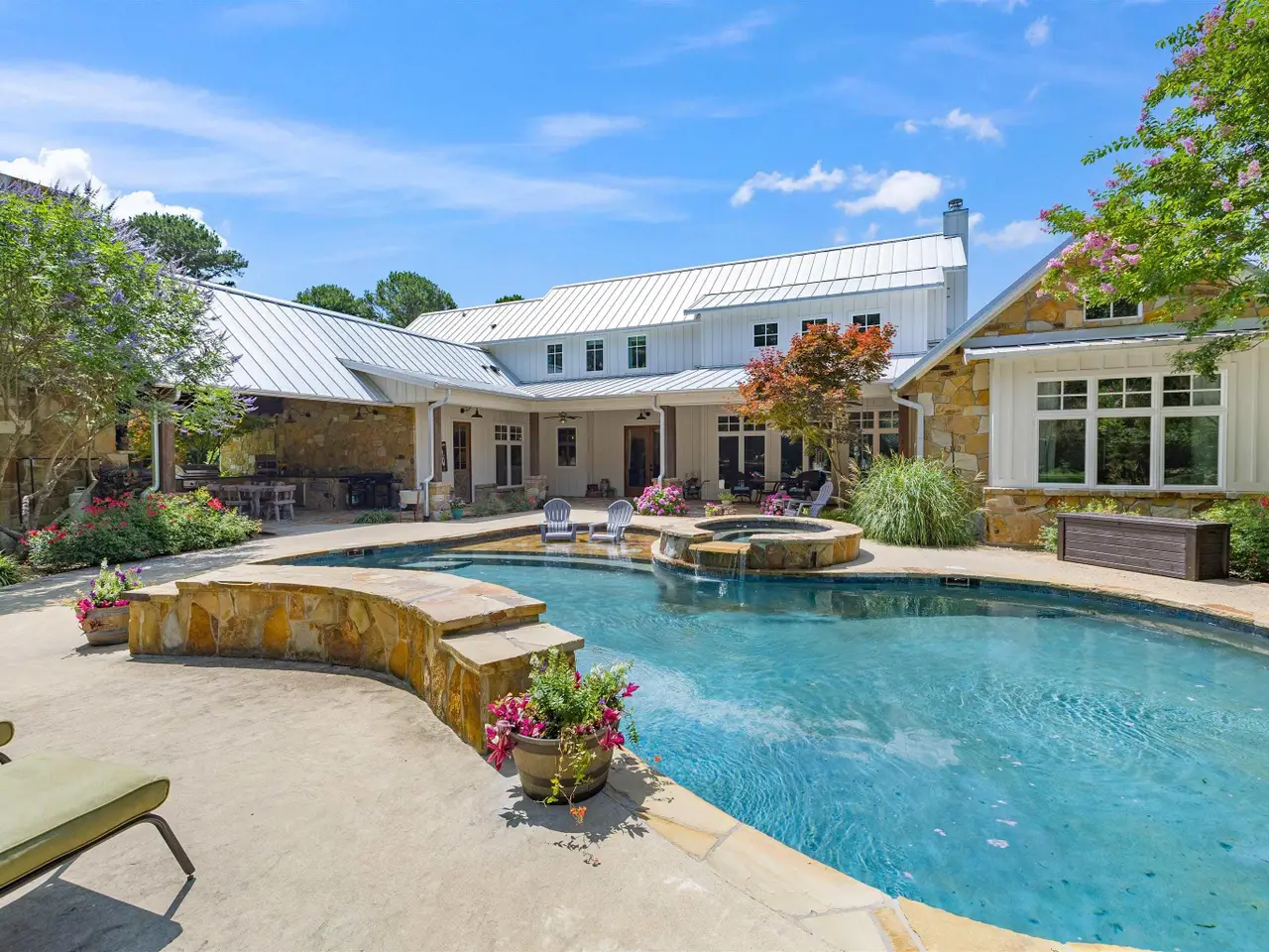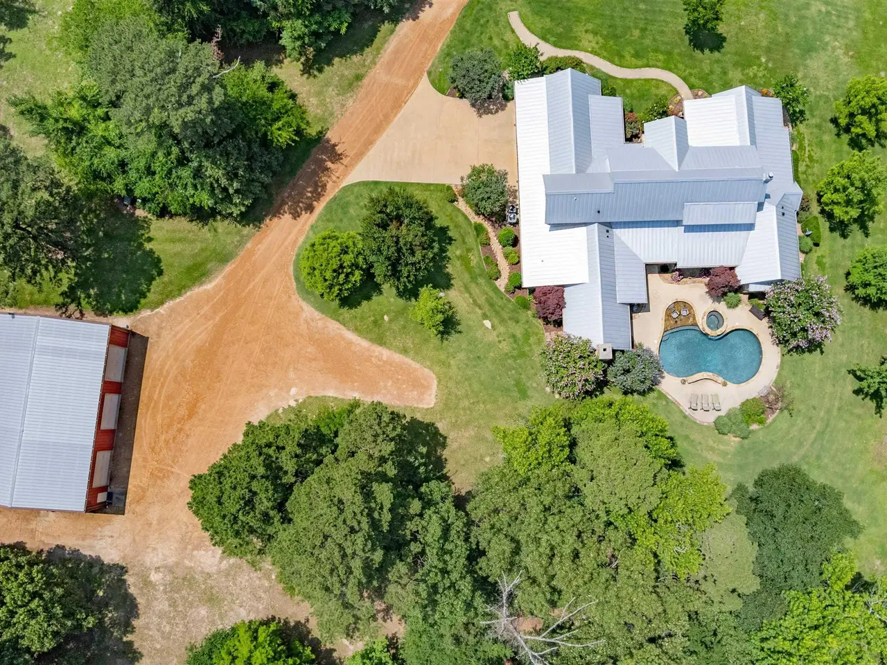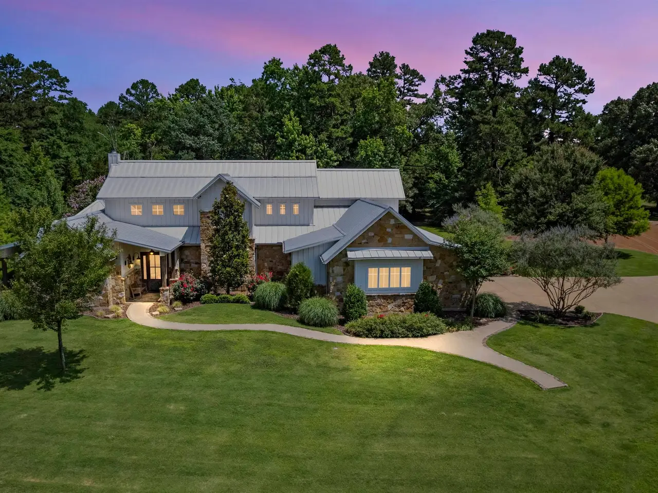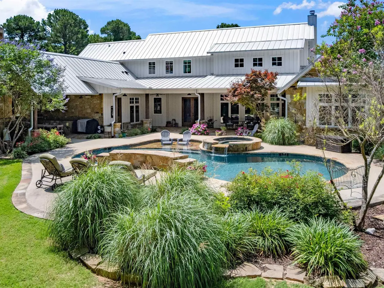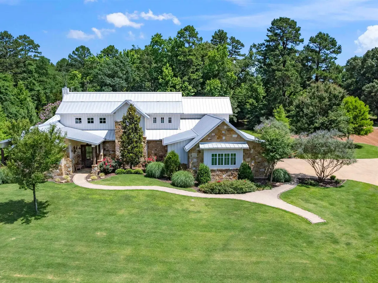 Located midway between Dallas & Texarkana and within minutes of beautiful Lake Cypress Springs and Lake Bob Sandlin, this thoughtfully designed, custom built home is set on 41 mostly wooded acres--tailor made for recreation, hunting or grazing a small herd. A winding drive brings you to the charming façade of this ultimate modern farmhouse. Step inside to a soaring great room crowned by a vaulted ceiling and anchored by a floor to ceiling stone fireplace with a wall of windows overlooking the resort-style pool. The heart of the home is a chef's kitchen outfitted with two sinks, a massive prep island, built-in professional appliances and a walk-in pantry that keeps everything organized for large-scale entertaining. Just beyond the main living area, an expansive covered patio and complete outdoor kitchen extends your living/entertaining space. Indoors, two separate living areas allow everyone to spread out. The game room, with a kitchenette and a half bath, makes movie night and game day effortless and provides easy access to and from the pool. The spacious primary suite is located on the main level and features a sitting area, vaulted ceiling and stone fireplace. The ensuite bath boasts separate vanities, a walk-in shower, soaking tub, water closet and a large walk-in closet, all accented with beautiful tile and fixtures. The lower level is complete with 2 additional guest bedrooms and 2 full bath rooms, a large utility room, mudroom and office. A second suite located on the upper level could easily be converted to a bunk room, perfect for weekend guests or multigenerational living. The three-car garage includes extra room for storage as well as a built in safe room. This property also features a 40 x 60 foot metal building with 4 overhead doors, a full bath and RV electrical and direct sewer hook ups. This property truly has something for everyone!! Call today to schedule your private showing of this amazing home.