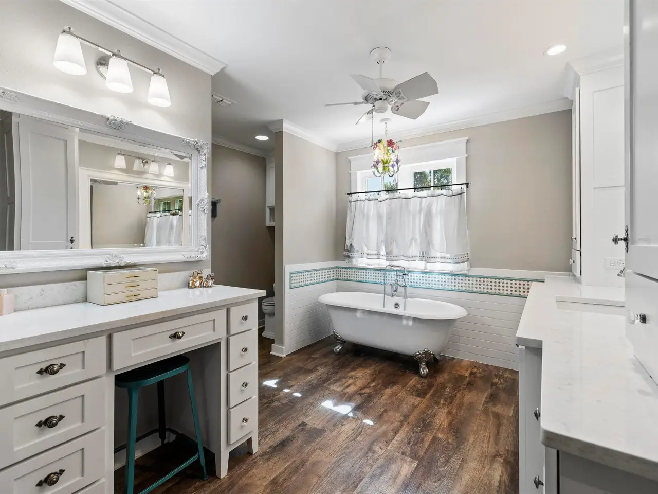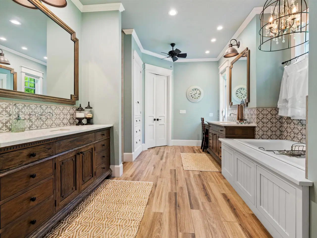 Primary suite with stone fireplace and luxurious ensuite bath