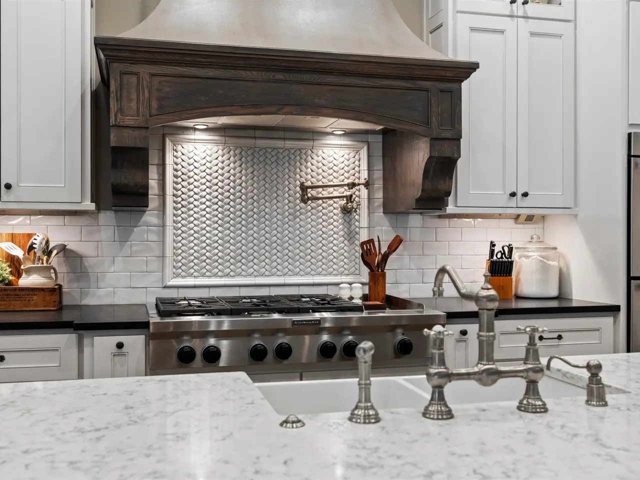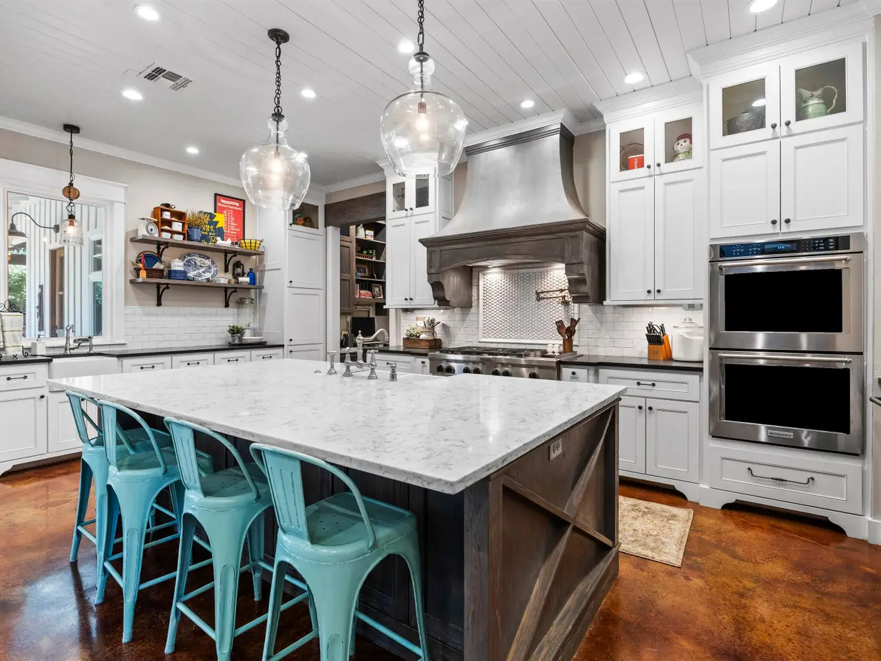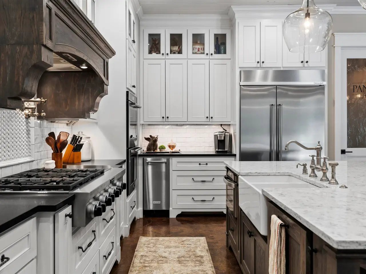 Chef's kitchen with professional appliances and walk-in pantry