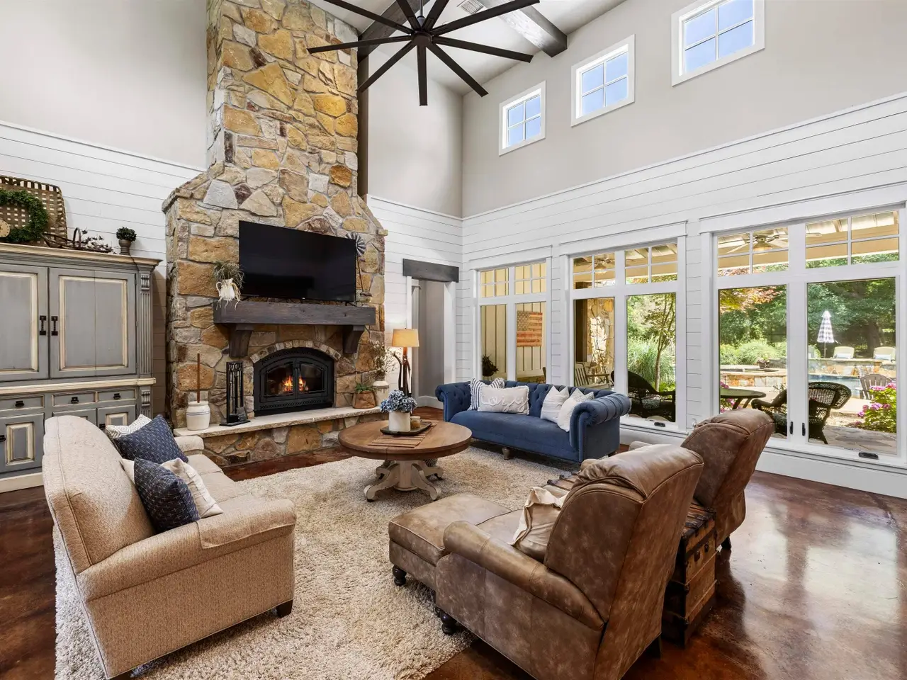 Vaulted ceilings with floor-to-ceiling stone fireplace