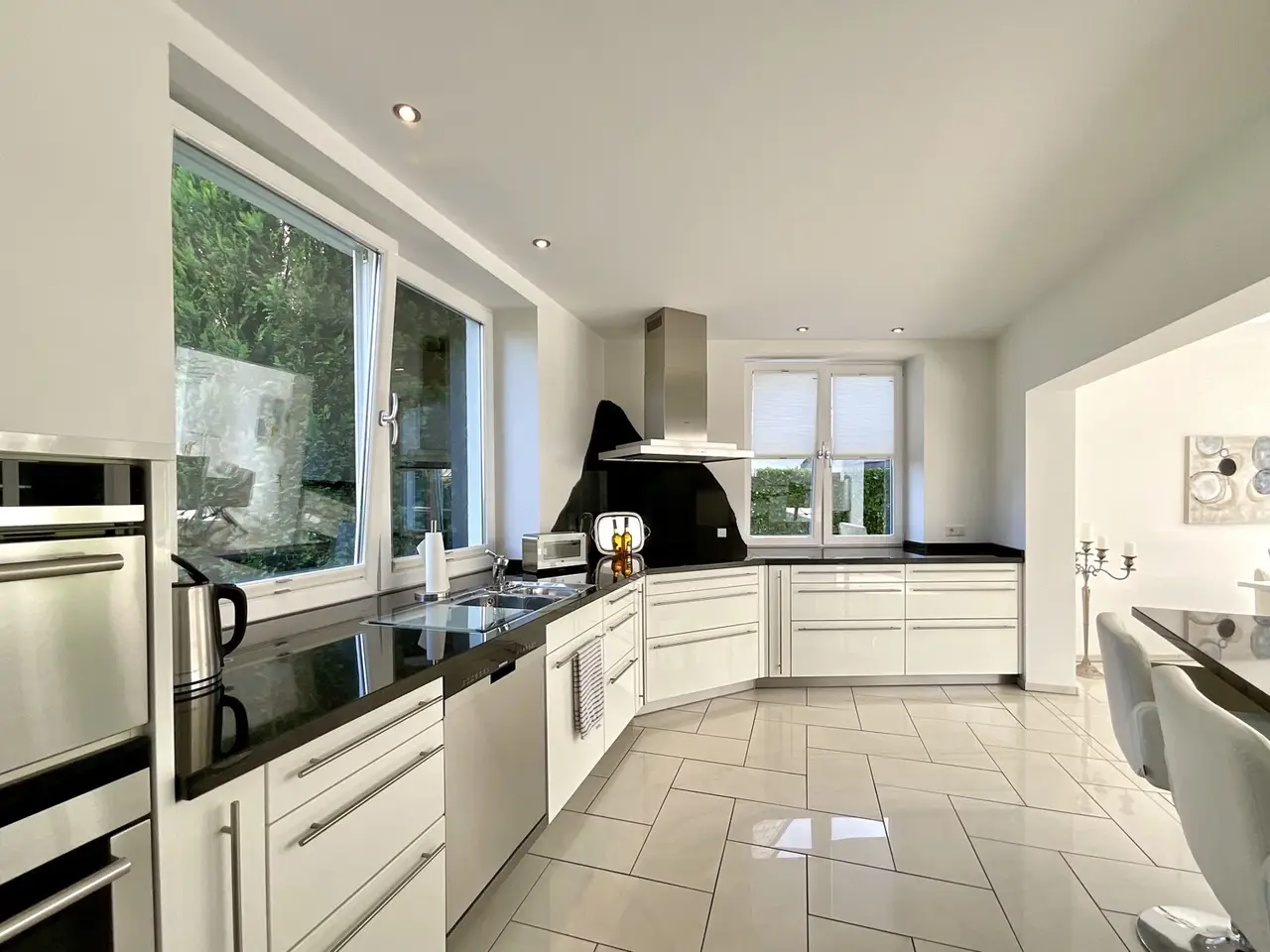 This as-new villa, built in 2005, not only impresses with a living space of approx. 283 m², spread over a total of eight rooms - including four spacious bedrooms and two study rooms - but also with its exceptional state of maintenance. The prestigious property stands on a sunny plot of approx. 1,015 m² in one of the most sought-after locations in Mülheim and is ideal for families who value comfort, space and a first-class neighborhood. Tranquillity is a top priority here... The bright, light-flooded entrance area impresses as soon as you enter the house. Many glass surfaces throughout the living/dining and work area create an open, spacious and light-flooded ambience. The high-quality fitted kitchen blends harmoniously into the living/dining area and is perfect for cooking together and socializing with friends. An open fireplace with adjoining tiled stove in the living area creates a cozy atmosphere in winter. Two study rooms on the first floor offer ideal opportunities for home offices or as guest rooms and underline the family-friendly nature of the house. A timeless open spiral staircase stylishly connects the two living floors. The generously sized master bathroom on the upper floor is also equipped with a sauna and thus offers sophisticated comfort at a high level. The entire interior of the house leaves nothing to be desired: Underfloor heating throughout the house and a central oil heating system with hot water supply ensure a pleasant indoor climate at any time of year. Another special highlight is the large, secluded south-facing terrace and the spacious roof terrace, from which you have a wonderful view of the extensive property. Garden sheds offer additional storage space for garden tools and leisure utensils. High-quality built-in wardrobes create additional storage space in the house, while the electric awning provides pleasant shade on sunny days. Thanks to the partial basement, there is also plenty of usable space in the basement. A parking space and a spacious garage round off our attractive property offer and provide additional space for your bicycles. The surrounding area is characterized by tranquillity, lots of greenery and a pleasant living environment - perfect for families with children. The villa is ready to move into and impresses with its modern, timeless architecture and high quality fixtures and fittings. Get your own impression of this top property in a prime Mülheim location. Feel free to arrange a viewing appointment to discover the special advantages of this house. On request, we will send you an online viewing link upon receipt of the exposé. We look forward to hearing from you.