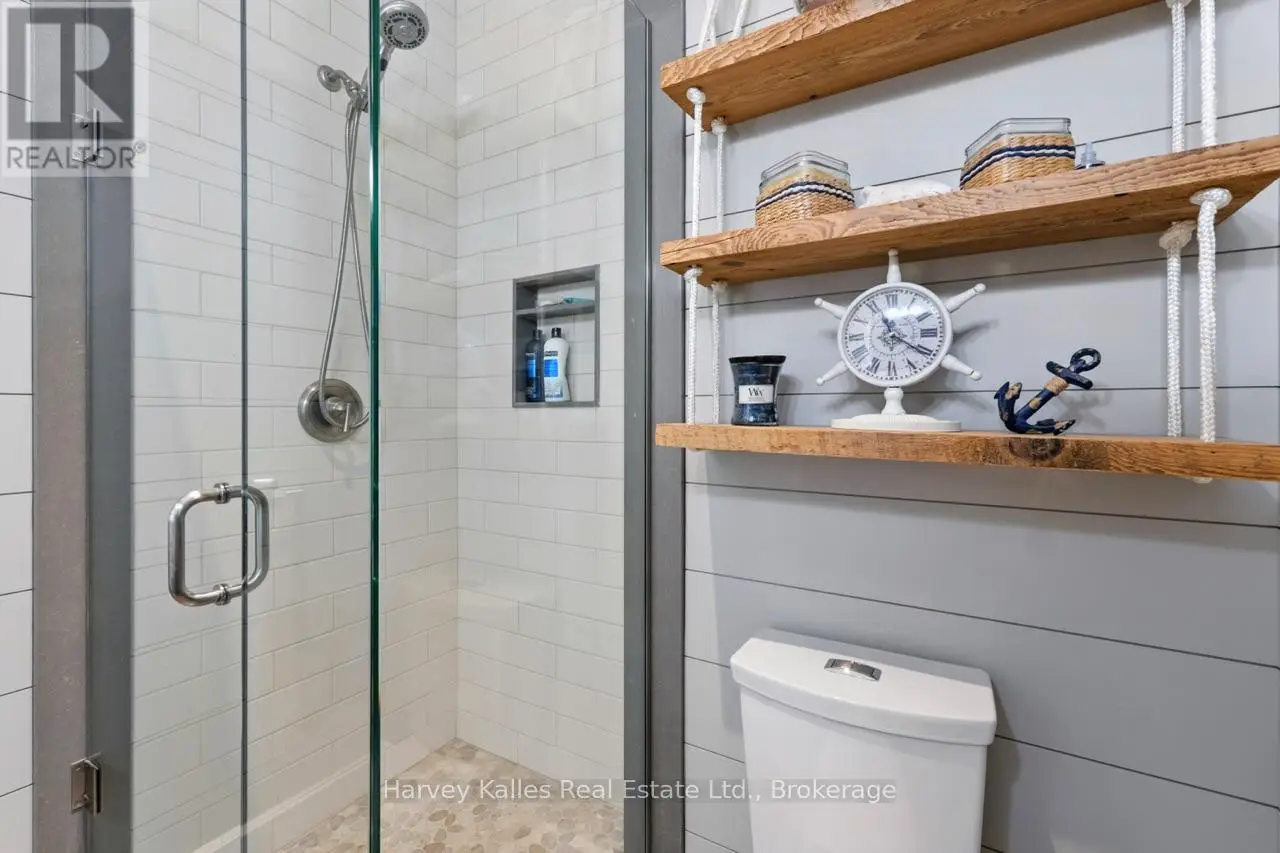 Custom built one owner South West facing Year Round Lake Muskoka beauty ideally located between Beaumaris and Port Carling on 101 Ft. (assessed) of mainland shoreline with year round municipal road access. Gentle topography, towering trees, handsome architecture. A most rare & value-packed, 1st ever offering. Built by Lakeridge Developments in 2017, the 3 bedroom plus a den, plus an office, plus a loft, gorgeous family cottage or year round home, features all the modern comforts, with approx. 2,500 square feet of finished living space, 2 classic Muskoka stone propane-burning fireplaces, random width red pine flooring throughout, and a finished lower level walkout. Cleverly designed, brilliant main floor layout captures glimpses of water views, with south-west oriented principal rooms for loads of natural light. Stunning chef's kitchen with custom cabinetry, centre island w/granite top, opening to the dramatic 1 1/2 storey great room with fireplace, wall of windows, and walkout to a lakeside deck. Dining area, laundry room, powder room, and primary bedroom with its own private deck, 4 pc. ensuite with double sinks, and walk-in closet, are also located on the main floor. Attached garage with inside entry. Large loft with separate sitting room. Finished lower level walkout boasts warm hardwood floors, raised above a heated crawl space, with centrepiece family room with wet bar, another stone fireplace, lakeside bedrooms, 3 pc. bath, plus a den and an office. Gentle level grounds with ample table land, fire pit spot, covered hot tub deck, and dock with deeper and shallower water. All the practical living features and facets have been well thought-out and infused into the design. Complete with full back-up Generac, drilled well, efficient propane furnace, central air, and all the bells. This is a turnkey, virtually new, customized to perfection, lake front hideaway in one of the most desirable locales of Lk. Muskoka. Minutes to shopping, dining, golf, and all the amenit (id:16999)