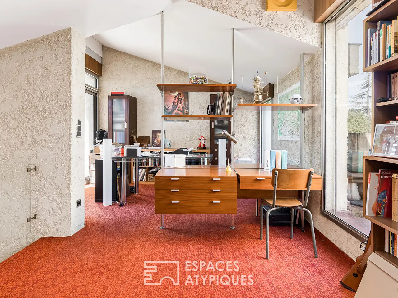 Located in Blagnac, a few kilometers from Toulouse, this house of approximately 240sqm stands out for its architecture. Designed in the 1970s by architect Michel Galavielle, it impresses with its style nestled in the heart of a naturally landscaped 950sqm garden, offering a privileged living environment. From the entrance, natural light and generous volumes capture the attention. The living space, flexible as desired, consists of a first reception area including a stainless steel kitchen, a dining room, and a living room in their natural extension. A laundry room / scullery completes this space. All the codes of avant-garde architecture of the 1970s are combined: as evidenced by the spectacular stainless steel 'conversation pit' around the fireplace, or the suspended concrete staircase that leads to a secondary living room, today used as a music space / office, overlooking the living room. The large openings onto the garden give the whole a bright and soothing atmosphere, a true meditative refuge. The sleeping area is spread over two levels. On the ground floor, two bedrooms each have their own shower room or bathroom. Upstairs, accessible by a second staircase, two other bedrooms also benefit from their own bathroom. A patio provides access to the office mentioned above. A full basement with a wine cellar completes this exceptional property in a sought-after area. Fenced land / Land suitable for a swimming pool Well Revised roof Covered parking for 3 vehicles Information on the risks to which this property is exposed is available on the Georisques website http://www.georisques.gouv.fr REF. 10853 Additional information * 10 rooms * 4 bedrooms * 4 bathrooms * 1 floor in the building * Outdoor space : 950 SQM * Parking : 3 parking spaces * Property tax : 4 675 € Energy Performance Certificate Primary energy consumption d : 158 kWh/m2.year High performance housing