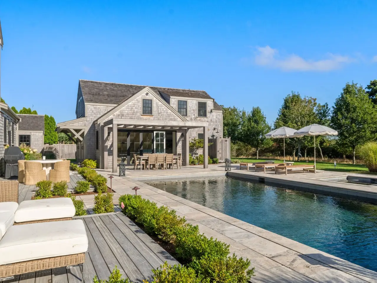 Experience modern Nantucket living at its finest in this newly renovated five bedroom, 5.5 bath home located in the desirable Austin Farm neighborhood near Hummock Pond. Thoughtfully redesigned in 2024, this home combines coastal charm with contemporary luxury and offers the perfect balance of privacy and convenience. The first floor features a bright, open layout with a custom kitchen, dining area, and spacious living room. High-end finishes, designer lighting, and hardwood flooring create an elegant yet comfortable atmosphere throughout. All flows seamlessly to the outdoor entertaining spaces. The home offers two primary suites, one on the first floor and one upstairs, each with beautifully appointed ensuite baths. Three additional guest bedrooms on the second floor provide ample space for family and visitors. A cozy den compliments the upstairs spaces, a perfect spot to unwind. Step outside to a beautifully landscaped yard with a heated pool with hot tub, pool house, and multiple lounge and dining areas. Mature plantings offer privacy while maintaining a relaxed island feel. Located just minutes from town, the beaches, Bartlett's Farm, and Miacomet Golf, this home provides convenient access to some of Nantucket's most beloved destinations.