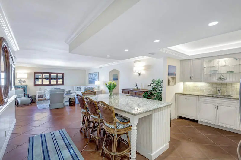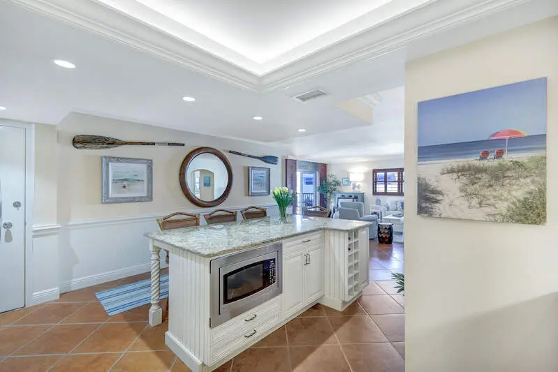 This lovely Gulf-front residence on Naples' beloved Miracle Mile is the kind of place where the sound of waves instantly makes you breathe a little deeper. Blending "Old Florida" charm with thoughtful updates, it's a true beachside retreat, just a short stroll to the soon-to-arrive Four Seasons. Space is utilized brilliantly with an open floor plan, large granite kitchen island, seating area replacing past walls, and matching built-in cabinets with a comfortable home office desk in an adjacent corner. Renovation of the primary bathroom was just completed, offering new walk-in shower and quartz countertops. The Diplomat is a friendly low-density building with an on-site manager, located directly beside the Edgewater Hotel. Residents love to walk over to the Edgewater for a cocktail and a bite to eat, or use it for overflow space when family and friends are visiting. From this amazing location, bike or take a golf cart to Old Naples, down Gulf Shore Blvd, for the encompassing Naples' experience.