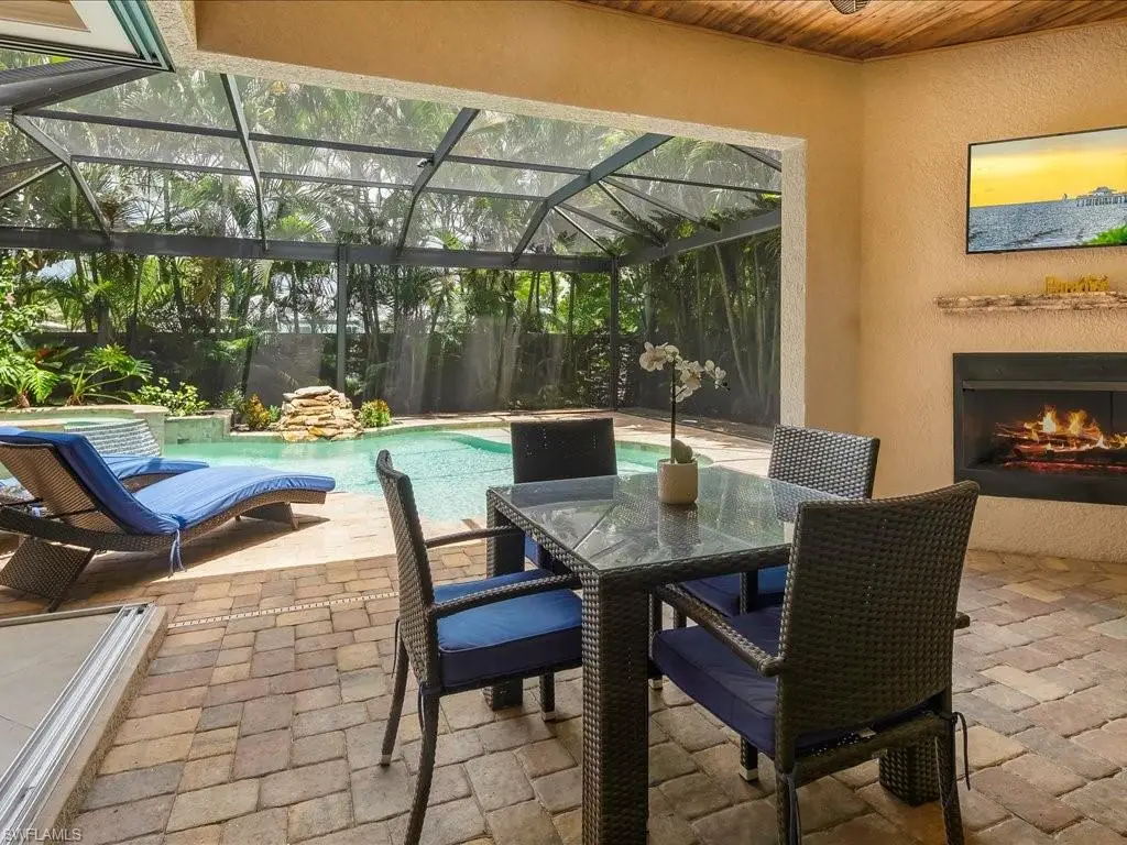 Ideally located in the highly sought after 500 block of Naples Park, this beautifully maintained home is perfect as a full-time residence or a high performing vacation rental. The layout features a spacious first floor primary suite and a flexible office or den, with two guest bedrooms upstairs offering space and privacy for family or visitors. Soaring ceilings, tile flooring throughout and an open concept design create a spacious, inviting interior. Large sliding doors connect the main living areas directly to a private backyard retreat, making indoor-outdoor living effortless. Enjoy a resort-style pool and spa with rock waterfall, sun shelf, and a cozy outdoor fireplace, perfect for entertaining or relaxing in the Florida sun. Just a short bike ride to Vanderbilt Beach and minutes from Mercato and Waterside Shops, this home offers the perfect combination of comfort, convenience, and coastal living.