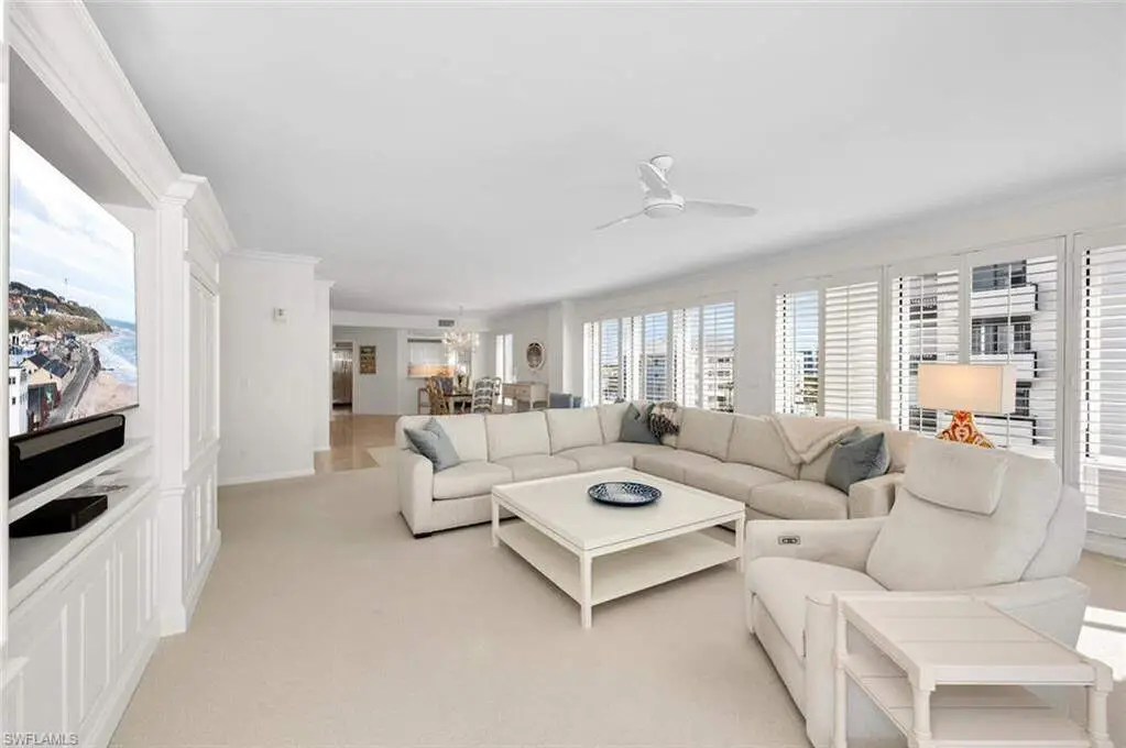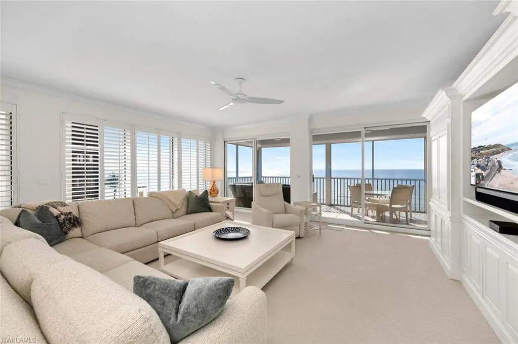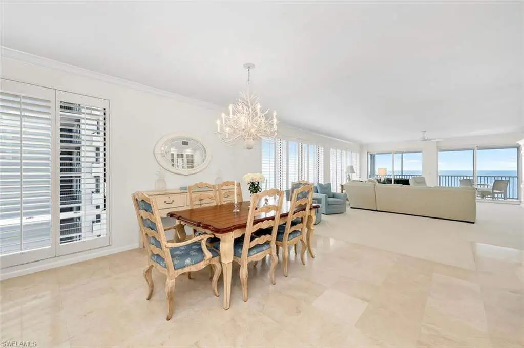 One of Naples' most exclusive residences featuring unobstructed Gulf views & exquisite sunsets & star-filled evenings. Luxurious 3 bedroom & 3.5 bathroom with 9 ft ceiling & amazing fresh white decor is complimented by the azure blue waters & includes a BOAT DOCK. The uncrowded beach is a joy to sit under an umbrella to read or just relax and listen to the waves. As you enter the foyer through double door entry you will be greeted by the colors of the sea. Nearly 3,000 sq ft of pure luxury sitting directly on the white sugar sand. Preferred end unit has southern exposure which allows natural light to cascade through the expansive bank of floor to ceiling windows from the living room and dining room. Includes electric storm shutters and 2 covered screened lanais to enjoy sunrise to sunset. The spacious floor plan includes a luxurious primary suite with soaking tub & dual closets. Guest bedrooms offer sparkling Bay views, ensuite bathrooms, & seamless access to a bayside lanai ensuring phenomenal guest experience. Le Dauphin offers unparalleled amenities designed to elevate every aspect of the Naples lifestyle. Extraordinary amenities include sparkling pool, tennis, pickleball and a summer kitchen complete with a BBQ. The on-site manager ensures meticulously kept building. Understated elegance greets you as you step into the newly renovated secured lobby, elevator, plus secured garage parking included. Experience the amenity rich lifestyle including the adjacent La playa with all the privileges of the private dining room & bar. Spend the day at the spa or fitness center. Enjoy food & beverage service on the beach from your lounge chair with beach butler service directly in front of Le dauphin, watch sports at the tiki bar, game of tennis & pickleball. Come today & enjoy the endless stretches of the pristine coastline.