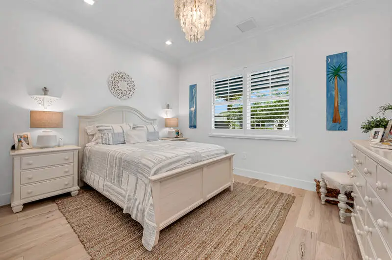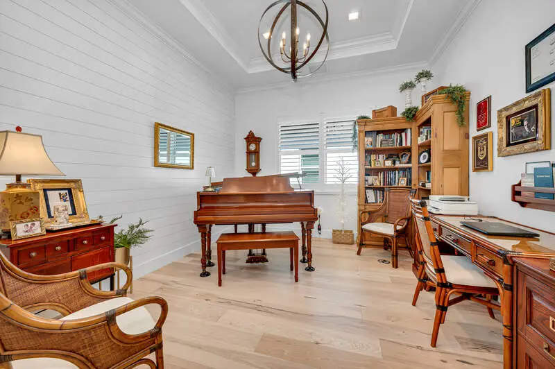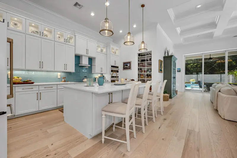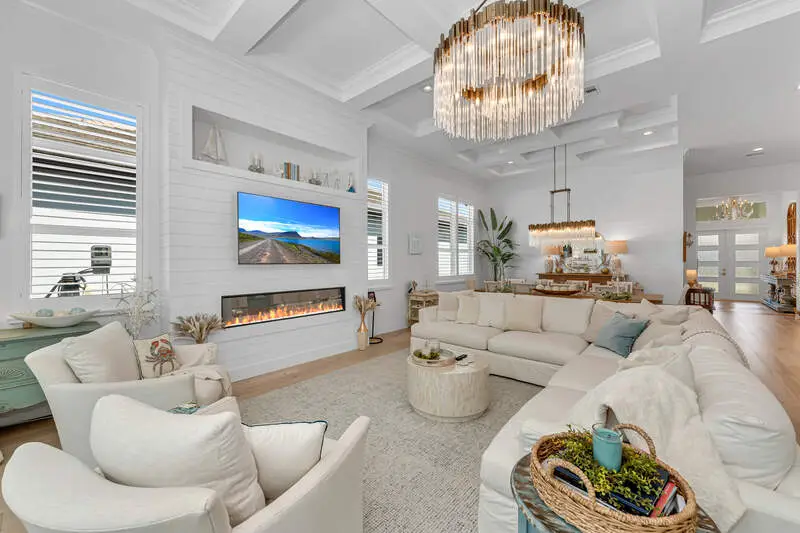 A true masterpiece of coastal contemporary design is found in this Cedar Key Model in the Sapphire Cove gated community. Every inch of this 3 bed plus a den and 3.5 bath residence has been designed with intention, ensuring that the architecture and craftsmanship work in perfect harmony to create an inviting and visually striking home. With soaring 12-foot ceilings and expansive 10-foot sliders, the natural light floods every corner, creating a warm and inviting ambiance. Gorgeous wood flooring flows seamlessly throughout and is accented by elegant coffered ceilings and shiplap wall accents. Wood flooring in Foyer has one of a kind custom design added for unique touch. The upgraded gourmet kitchen is a culinary delight, featuring high-end finishes at every turn, including upgraded white cabinets that beautifully contrast with the sea glass subway tile, while designer glass display shelving offers the perfect showcase for your favorite dishware and decor. Kitchen island is oversized adding a touch of luxury. Current owners added ice-maker in laundry adjacent to kitchen for convenience. All appliances as well as washer and dryer have been upgraded to smart appliances. Hardware and lighting is brushed gold throughout the house. The great room is designed for entertaining, centered around a cozy fireplace and highlighted by a wall of sliders that lead directly to your private oasis. Step outside onto the screened lanai, where you can unwind in the resort-style pool and spa. Retreat to the primary suite and ensuite bath that rivals any spa, featuring a freestanding soaking tub and a massive walk-in shower. The interplay of color and texture, accented by the elegance of the brushed gold hardware and lighting, creates a harmonious environment that is both visually stunning and calming. All doors in home are solid core. Current owners added custom plantation shutters through entire home. Upgraded marble tiles have been added to lanaii/pool area. Even the garage has been upgraded with a five foot extension for storage and brand new Epoxy floors. Amenities include a pool, club room, kitchen, and a fitness center. Don't miss your opportunity to own this exceptional home that combines visual appeal with remarkable craftsmanship.