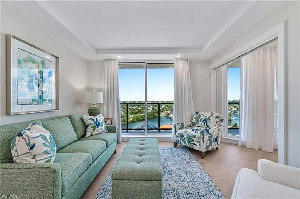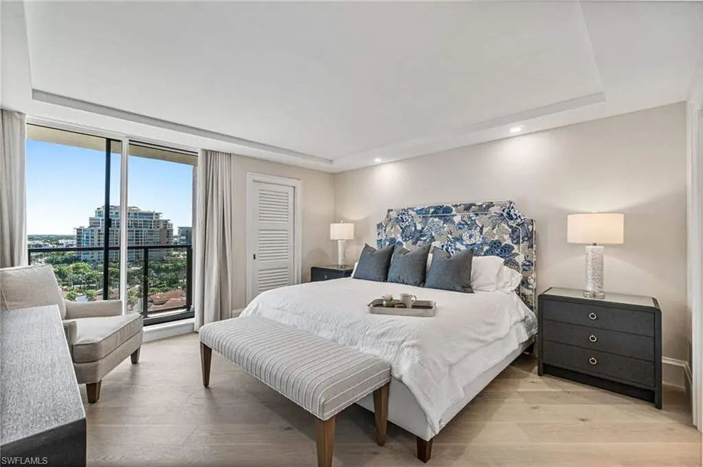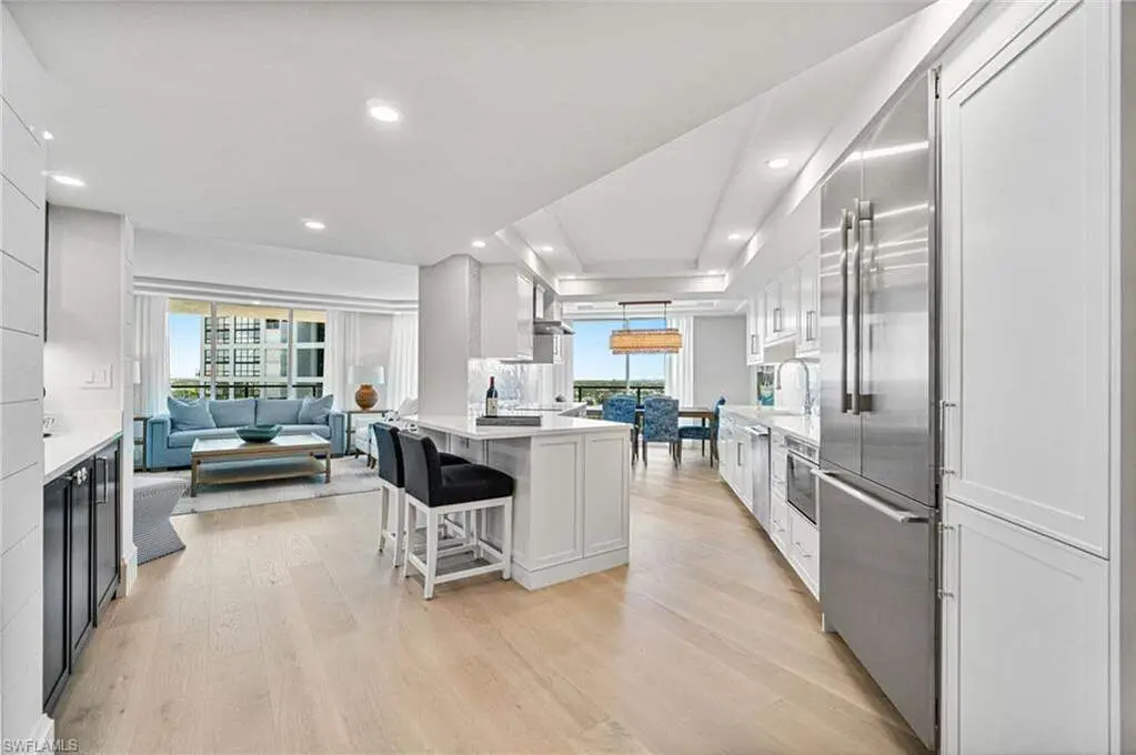Experience the ultimate in modern coastal living in fully redesigned 3 bedroom, 3 full bath residence at The Meridian Club, one of Park Shore's most prestigious beachfront addresses. Perched on the 15th floor, this turnkey designer condo offers sweeping views of both Venetian Bay and the Gulf of Mexico - a true Naples retreat for discerning buyers relocating from "up North". The chef-inspired kitchen is a showpiece, featuring a Thermador appliance package with induction cooktop, built-in drawer microwave, and all stainless steel appliances. Elegant white cabinetry, quartz countertops, a white and gray herringbone backsplash, and high-end fixtures create a clean, coastal aesthetic. A breakfast bar for two adds casual dining space, while the complimenting wet bar with navy cabinetry, glass display, and patterned tile backsplash makes entertaining effortless. Designed by Diane Torrisi Designs and Kevin Steffanni Design Group, the home features wide-plank wood flooring, stepped ceilings, frosted glass and solid doors, and an open, light-filled layout leading to an expansive wraparound balcony with updated glass railings and a glass-enclosed seating area perfect for sunset views. The primary suite is a sanctuary with three custom closets, mirrored doors, and a spa-style bath with multiple shower heads. Two en-suite guest bedrooms offer refined comfort and privacy. High end designer furnishings, electric shades, custom draperies, and mounted TVs complete this elevated retreat. The Meridian Club sits on 3.5 acres of beachfront with only four units per floor. Enjoy a 24-hour doorman, resort-style pool and spa overlooking the Gulf, tennis and pickleball, outdoor grill area, and direct access to Naples' white-sand beach. Located minutes from Venetian Village's fine dining and boutique shopping, this home embodies effortless beachfront sophistication. Turnkey. Renovated. Ready for your Naples lifestyle.