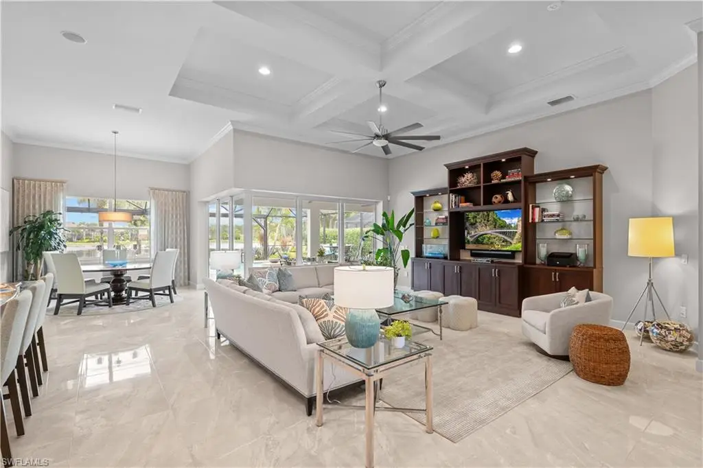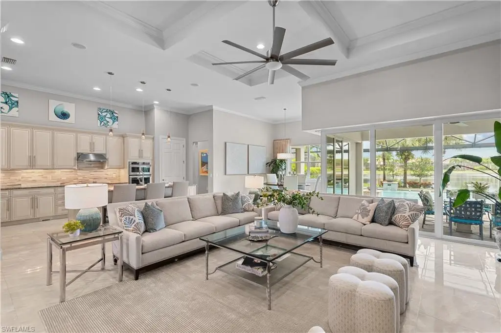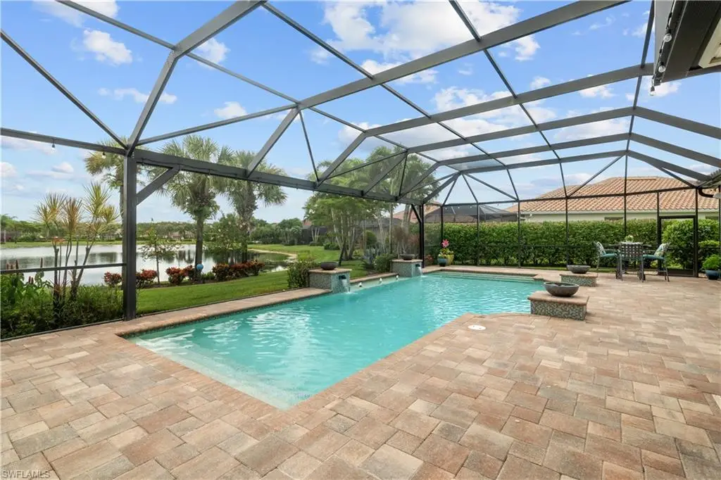 Welcome to this stunning, light-filled and ever so popular "Windsor" floorplan home, featuring 4 bedrooms plus den, 3 full baths, and a spacious 3-car garage. Nestled on an oversized, pie shaped lot with an extra long driveway, this home offers a wide-open Great Room layout that’s perfect for entertaining and everyday living. As you step inside, you’ll be greeted by a bright and airy atmosphere, highlighted by zero-corner pocketing sliding glass doors to the lanai that seamlessly connect the indoor and outdoor living spaces. The sliding doors lead to the expansive lanai, where you'll find an outdoor kitchen and an oversized electric and solar heated salt water pool with picture window screen cage overlooking the lake – your personal oasis. The chef’s kitchen is a dream, complete with raised panel cabinetry, KitchenAid appliances including wall oven, convection microwave, and beverage cooler. The large eat-in kitchen area offers the perfect spot to gather and enjoy meals with family and friends. Retreat to the luxurious primary suite, which boasts a tray ceiling, a spacious bath featuring a soaking tub & walk in shower, and two spacious walk-in closets with built-in cabinetry. For those wine enthusiasts, the custom climate controlled walk in wine room will be the envy of your family and friends. Storm ready with HURRICANE IMPACT WINDOWS/DOORS! Enjoy boating, golf, tennis, pickleball, bocce, a tiki bar, restaurant, poolside food and drink service, a fitness center, and social activities. The recently renovated $18M Lake Lodge & Beach Club offers over 500 acres of navigable lakes, boat slips available for lease, and a private 18-hole golf course (full golf memberships available/optional). In addition, The Quarry Golf Club offers a variety of membership opportunities. Designed in 2007 by the world-renowned architectural team of Dr. Michael Hurdzan and Dana Fry, this Par 72 championship course delivers a truly exceptional golf experience framed by breathtaking views. Water comes into play on every hole, creating both beauty and challenge, while the thoughtful design ensures an engaging round for golfers of all skill levels. With five sets of tees and a distinctive layout from hole to hole, this course offers endless variety—inviting you to enjoy the challenge again and again.Don’t miss the chance to experience a lifestyle like no other in The Quarry – schedule your private showing today!