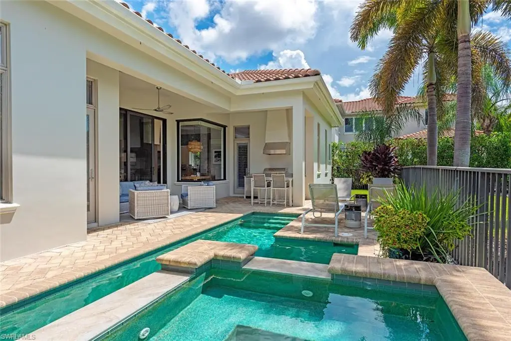 Welcome to Resort Style Living, Welcome to Grey Oaks! Beautifully furnished, this luxury home offers an ideal retreat in a peaceful setting. Designed with timeless finishes and practical elegance, this home features three spacious bedrooms and three-and-a-half baths, a large den and office. All are highlighted by high ceilings, detailed moldings, and premium flooring and all allow an abundance of natural light. The gourmet kitchen is equipped with Viking appliances and custom Heartland cabinetry, opening seamlessly to the large great room and an outdoor lanai. Perfect for entertaining, the outdoor living area includes a seating area with outdoor TV, a heated pool, spa, and summer kitchen, all overlooking a tranquil tropical waterfall feature. Andersen impact-resistant windows and doors provide security and peace of mind, while the attached two-car garage and separate golf cart garage add convenience. This Gulfshore-built residence delivers the perfect combination of style, comfort, and easy livingùan excellent choice for buyers seeking a refined lifestyle. Minutes from downtown, and the beach this home is not to be missed. Grey Oaks Country Club is Naples' one and only private club with 54 holes of championship golf. In addition, the club offers an unparalleled array of exclusive amenities, including a newly renovated wellness center, a lagoon-style pool, tennis, pickleball, bocce, multiple dining venues, and a luxurious spa. The amenities are truly endless.