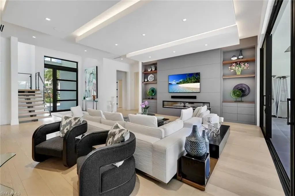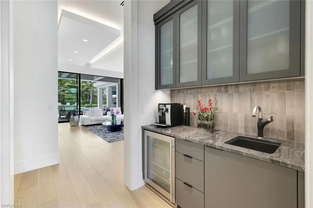 A showcase of modern elegance, this custom two-story residence was thoughtfully crafted with architectural excellence by Boyott Design. Nestled in prestigious Pine Ridge, the home embodies exceptional craftsmanship with premium finishes for a lifestyle of sophisticated comfort. All cabinetry and wood accents customized by Ruffino Cabinetry. Spectacular chef’s kitchen, accompanied by a chic full-service Butler’s pantry. Both offering upscale appliances by Miele, Thermador, Bosch and BlueStar. Well-appointed bar area with 184 bottle dual wine coolers. Additional office wet bar, plus guest station on the second floor. All bedrooms are ensuite with walk in closets. The elegant first floor primary bedroom is private with access to a spacious study, porte-cochere entry with welcome station, and his & her opulent closets. Expansive primary bathroom offers dual sides of amenities providing privacy, plus a digital Kohler Rain Shower/Body Spray System for personalization. First floor guest suite is equipped with a steam shower. A dramatic glass staircase leads to more open living/recreation space with theatre quality sound system. Large sliders open to a covered cedar ceiling balcony with beautiful scenic views of the grounds and pool. The second floor VIP Suite offers balcony access, vanity, walk-in closet and luxurious shower. The picturesque, main covered lanai areas include outdoor kitchen, bar, Alfresco grille and pizza oven, dining and two spacious outdoor living areas, linear fireplace which all may be enclosed under automated screens. Outdoor living areas give way to a sprawling heated saltwater pool with soothing scuppers of water flowing from a large linear firepit, sun shelf and spa. Property is elegantly landscaped with the bonus of mango, lime & lemon trees. The home is managed by a Control4 Home Automation System for lighting, security, music, window shades and audio/visual. Additional features include hurricane impact-resistant doors & windows by ES Windows. You'll enjoy superior protection and sound attenuation. Soaring 12-foot sliding doors seamlessly connect indoor and outdoor spaces, while wide plank wood flooring flows beautifully throughout main living areas. Specially designed drop celings to cover air vents. Enjoy the convenience of an elevator, a whole-home reverse osmosis water system, and a robust whole-home generator for uninterrupted power. Even the garage is a haven with full air-conditioning and custom storage solutions. For enhanced peace of mind, this property offers a comprehensive security solution including outdoor surveillance cameras, a fully fenced perimeter, and secure Viking entry gates. This beautiful Pine Ridge Estates property is close to beaches, fine dining, upscale shopping, and the renowned Artis—Naples. This one-of-a-kind estate offers luxury living at its finest.