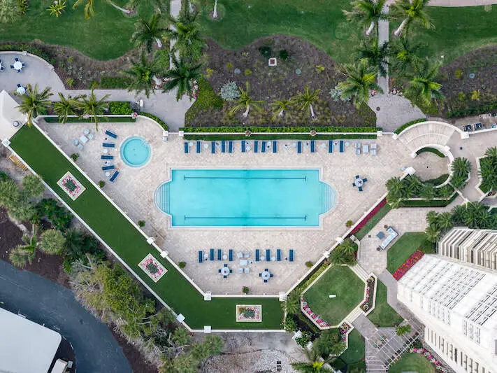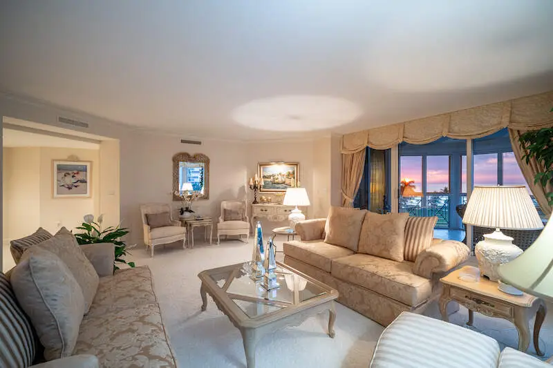 This thoughtfully designed open floor plan seamlessly integrates a spacious great room and den area, both providing unparalleled versatility for comfortable living. Attention to detail is evident throughout, showcased by custom drapery panels, plantation shutters, intricate millwork, and expansive sunrise and sunset terraces. The open concept great room and dining space are bathed in natural light, enhanced by floor-to-ceiling windows. The kitchen, a sunlit haven with ample countertops, features white cabinets and a breakfast room. The residence encompasses two generously sized guest suites, each boasting en-suite baths and walk-in closets. The owner's suite offers a retreat-like ambiance, opening to a screened lanai and framing captivating views of the Gulf of Mexico through expansive walls of windows. Positioned as an end unit, this condo affords 180-degree panoramic vistas of the gulf, park, and bay, creating a truly breathtaking living experience. Within minutes, enjoy the cultural offerings of Venetian Village, Waterside, Artis & Old Naples. Embrace the natural beauty of Park Shore with its parks & green spaces, creating a lifestyle that encompasses coastal living.