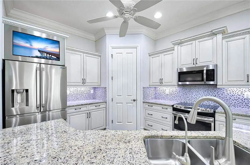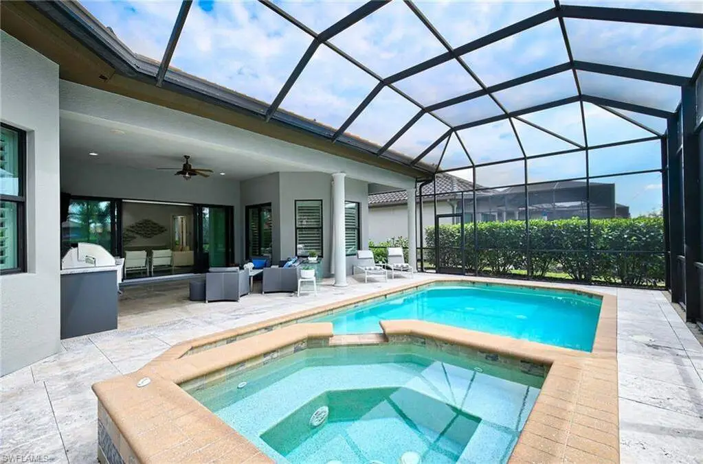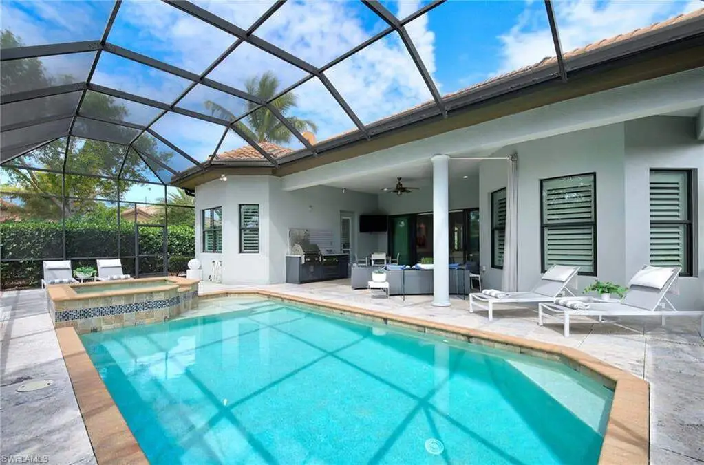 NOW OFFERED TURNKEY--This exceptional offering on an OVERSIZED corner Lot and newer home (2015 build) in Lantana at Olde Cypress has been upgraded and updated for the most discerning buyer looking to enjoy all that The Club of Olde Cypress offers while enjoying the attributes of a home that has been transformed in the most exquisitely refined choices such as: New front entrance and lanai surface, plantation shutters, upgraded flooring, gas fed outdoor kitchen, custom closets and custom encore garage flooring and storage system, newer light fixtures, recessed lighting throughout, glass front door, BURIED 250 gallon propane tank-RARE for Lantana, gas and solar heated pool. Additionally there is a newer fridge and washer and dryer. All the comfort of an upgraded during build and the current ownership home with hurricane sliders and windows (not all Lantana homes have hurricane sliders and windows). This true four bedroom home with two and one half baths has a fabulous open floor plan and a roomy three car garage on a corner lot with SOUTHERN exposure water views. Freshly painted exterior. It's time to start your exceptional living in Naples and at this renown PB Dye golf community with pickleball, tennis and very active club house. Expansion plans have been revealed for an even more social club with NO ASSESSMENTS ever at Old Cypress, no CDD. Social membership required with no initiation fee. $15 million expansion for clubhouse this year. Inquire about current golf membership availability. CURRENTLY FULL GOLF MEMBERSHIPS ON WAITLIST, BUT this home can have the buyer join now. Close to many dining choices and beaches while only 20 minutes to RSW. Note LARGE lot with much wider frontage than nearly every other lot in Lantana for extra privacy and quiet.