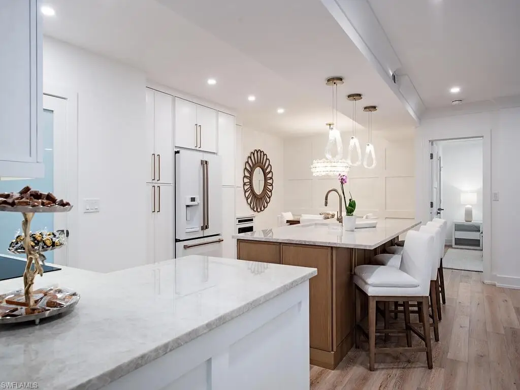 A WONDERFUL OPPORTUNITY AWAITS COMPLETELY RENOVATED! Beautiful residence in the highly sought after area of Park Shore - This residence is warmly welcoming with spectacular finishes and awe inspiring views of the Venetian Bay! This residence boasts beautiful wood flooring, Taj Mahal Quartzite, oversized island, GE Cafe Appliances, soft close cabinetry/vanities throughout, marble showers in all 3 bathrooms, an elevated trim package, new impact doors, wine chiller/dry bar, Lutron automated shades, enclosed impact glass Florida room. You are the most centrally located west of US-41 between the Ritz Carlton/Mercato Shops and the Iconic downtown 5th Ave. S. and 3rd St. S.!!! Venetian Village is mere minutes away as well as Artis Naples, Waterside Shops, and the highly anticipated Four seasons! You have the ability to join the private Park Shore Beach access for a nominal annual fee. The ease and simplicity paralleled with the views and location are wonderful! Whether enjoying a day at the beach, relaxing at the pool overlooking the bay, shopping, fine/casual dining, golfing, the location is sure to please the most discerning buyer!