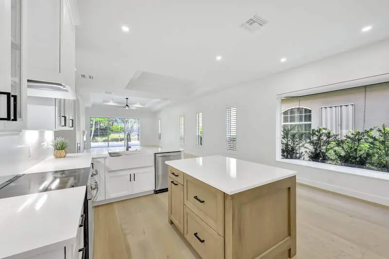 Capture the elegance of waterfront living in Troon Lakes. Western views frame peaceful scenes of the lake, fountain, and lush landscape. This single-story pool home with hot tub and proximity to the community club offers convenient access to local retail and restaurants, the beach and the benefits of a highly amenitized community. The home provides beautiful, easy-flow living with abundant natural light and numerous upgrades, including an office/den with built-ins, crown molding, and coffered ceilings in the great room. Dining and entertaining are effortless with a spacious kitchen island, formal dining area, and inviting lanai. The master suite overlooking the lake offers privacy and direct access to the pool for year-round, relaxing Florida evenings, while guests enjoy their own private space. Recently remodeled with white oak Maui wood floors, new appliances, cabinets, and fixtures. The amenity-rich community includes tennis, pickleball, bocce, fitness and social centers, and The Nest outdoor bar & grill.