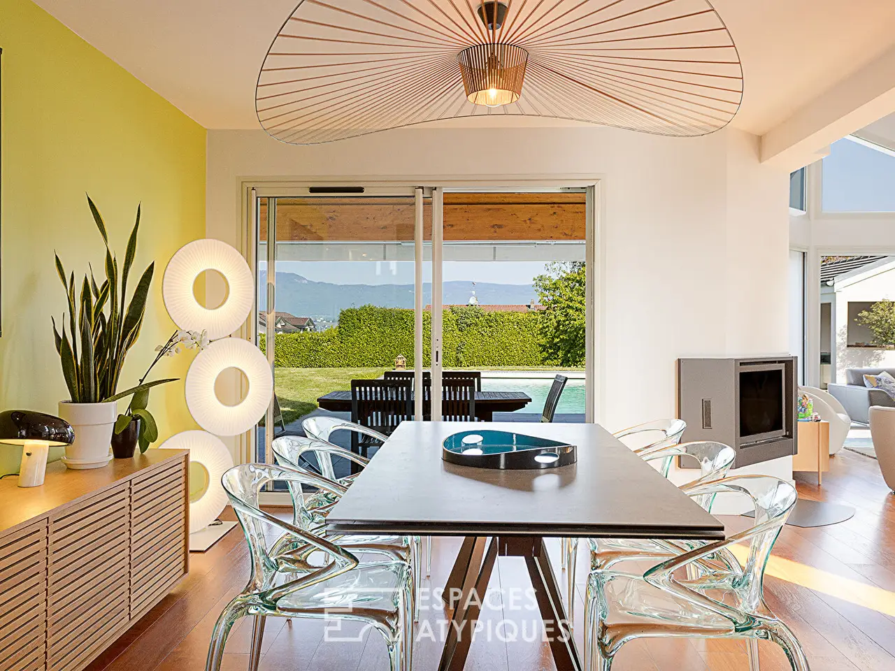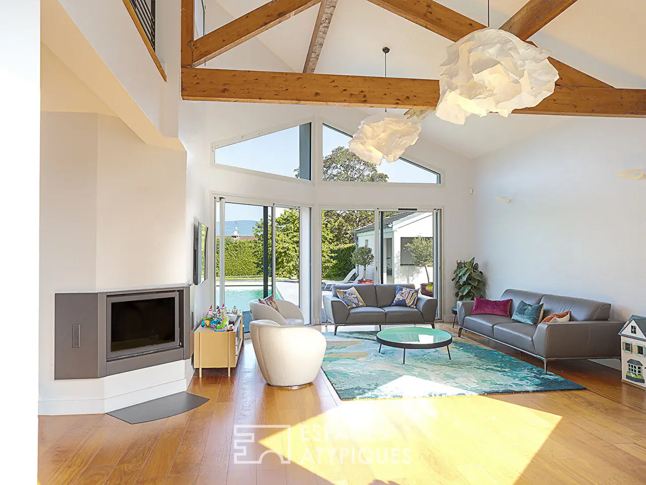 Situated just a stone's throw from Lake Geneva and the picturesque village of Nernier, this contemporary villa offers a privileged living environment just 15 minutes from the Swiss border. Set in 2,468 sqm of landscaped grounds with swimming pool and pool house, it offers 255 sqm of living space, plus 45 sqm of outbuildings, giving a total of 300 sqm of usable space.Upon entering, the house opens onto a vast, light-filled living room of over 76 sqm. Designed for modern family living, it exudes a warm atmosphere thanks to the mahogany parquet flooring throughout.Divided into two distinct areas, the living room features a fireplace, a cathedral ceiling and a dining area extending onto a covered terrace, ideal for summer meals.Directly connected via a studio glass roof, the separate kitchen features immaculate Italian furniture, a Zimbabwe black granite worktop and large windows opening onto the terrace and garden.The ground-level master suite has direct access to the garden and features a double dressing room and a generous bathroom with bath, walk-in shower and double washbasin.A 22 sqm room, perfect for an office or guest bedroom, is added to this level, along with a laundry room with separate access and a guest toilet.Upstairs, a mezzanine office or library area overlooks the living room and leads to three bedrooms, two of which share a balcony with lake views. A second bathroom and dressing room complete this level.Finally, a double garage with mezzanine, a wine cellar, a workshop and co-ownership access to a private beach complete the features of this property, ideal for a family looking for tranquillity, space and comfort.ENERGY CLASS: C / CLIMATE CLASS: EEstimated average annual energy costs indexed to 15 August 2015 : 4,000 Euros.Information on the risks to which this property is exposed is available on the Georisques website for the areas concerned: www.georisques.gouv.fr.REF. 1970EAAdditional information* 8 rooms* 5 bedrooms* 2 bathrooms* 1 floor in the building* Outdoor space : 2468 SQM* Parking : 5 parking spaces* 50 co-ownership lots* Property tax : 3 618 €* Proceeding : NonEnergy Performance CertificateEPC : 139 kWhEP/m2.year* A 450GHG : 41 kgeqCO2/m2.year* A 80Agency feesThe fees include VAT and are payable by the vendorMediatorMediation Franchise-Consommateurswww.mediation-franchise.com29 Boulevard de Courcelles 75008 ParisInformation on the risks to which this property is exposed is available on the Geohazards website : www.georisques.gouv.fr