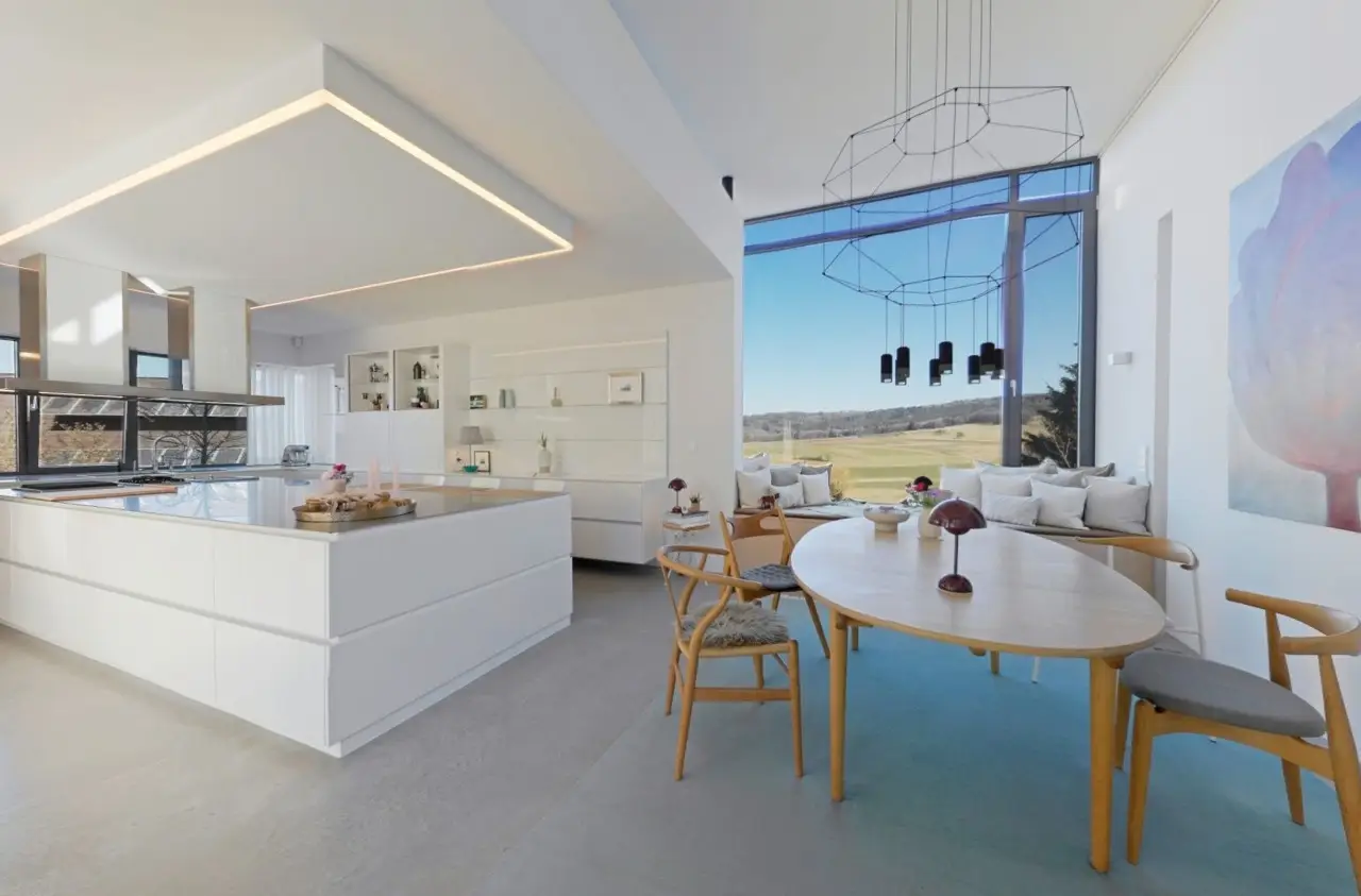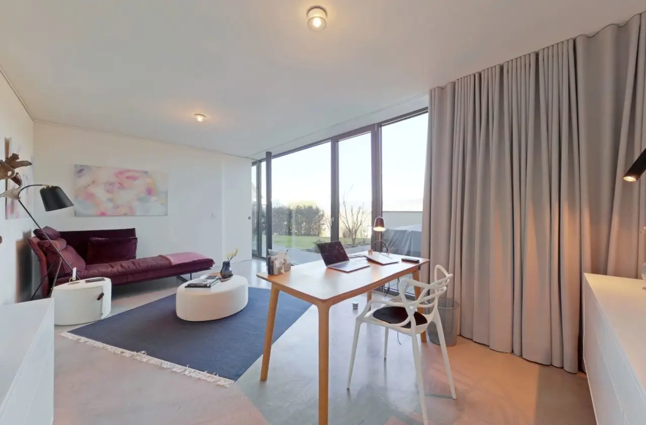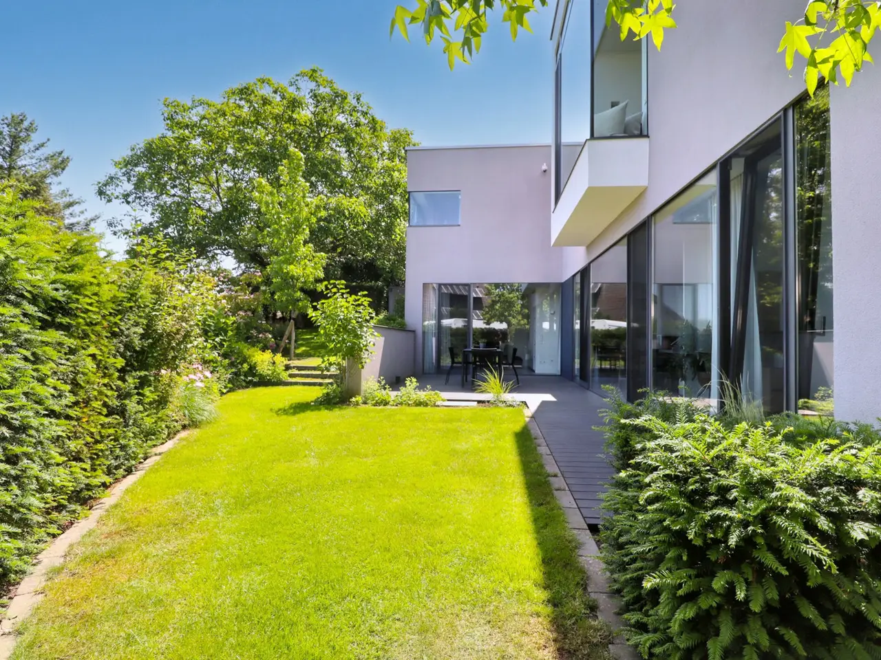 Property with a "conscience" A spacious and luxuriously furnished villa is for sale, which was built in 2006/2007 and has been extensively optimized time and again. It is technically and qualitatively up to date and ready to move into. As soon as you enter the house, you immediately get a feeling of lightness, openness and privacy. This is created by the atrium design combined with extensive window areas, which ensure a natural flood of light and room heights that are extraordinarily generous by local standards (dining area up to 3580 mm, remaining ground floor 2640 mm). Embedded in the "U" of the Atrium house on the ground floor is the beautiful pool surrounded by a large terrace area, which can also be variably extended by a walk-on cover. This is complemented by an integrated barbecue station and an adjacent pond. On the garden level, there is a further terrace area along the living room and bedrooms as well as a beautiful large green area with trees, which offers space for children to play and run around. Last but not least, the attractive kitchen with dining area should be mentioned as the focal point of the house, which invites you to enjoy cooking for yourself as well as "cooking up" with guests. It blends in exceptionally harmoniously with the overall living concept and is superbly equipped. This area is spacious and open to the dining area. A closed fireplace, glazed on two sides, rounds off the overall picture and creates a feel-good atmosphere. The directly adjoining living room can be directly integrated or separated by a floor-to-ceiling sliding door (inside the wall). The entire house is generously equipped with high-quality built-in wardrobes on both the ground floor and the garden level. The plot area is 700 m2. The clever integration of the house into the gentle slope, the garden-side window façade open to nature and the optimal garden design create a unique connection with the directly adjacent natural surroundings. The garden was designed in collaboration with a garden architect. The garden is equipped with a modern, fully automatic irrigation and sprinkler system for all beds and lawns as well as a lighting system controlled by motion detectors. Interested? We would be happy to provide you with a detailed exposé with further information on request. We would be happy to arrange a viewing and present this outstanding property to you in person. Get in touch with us!
