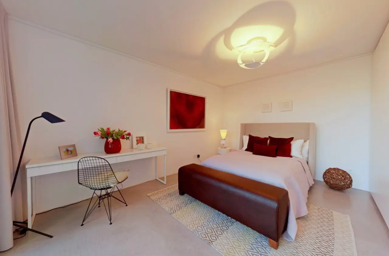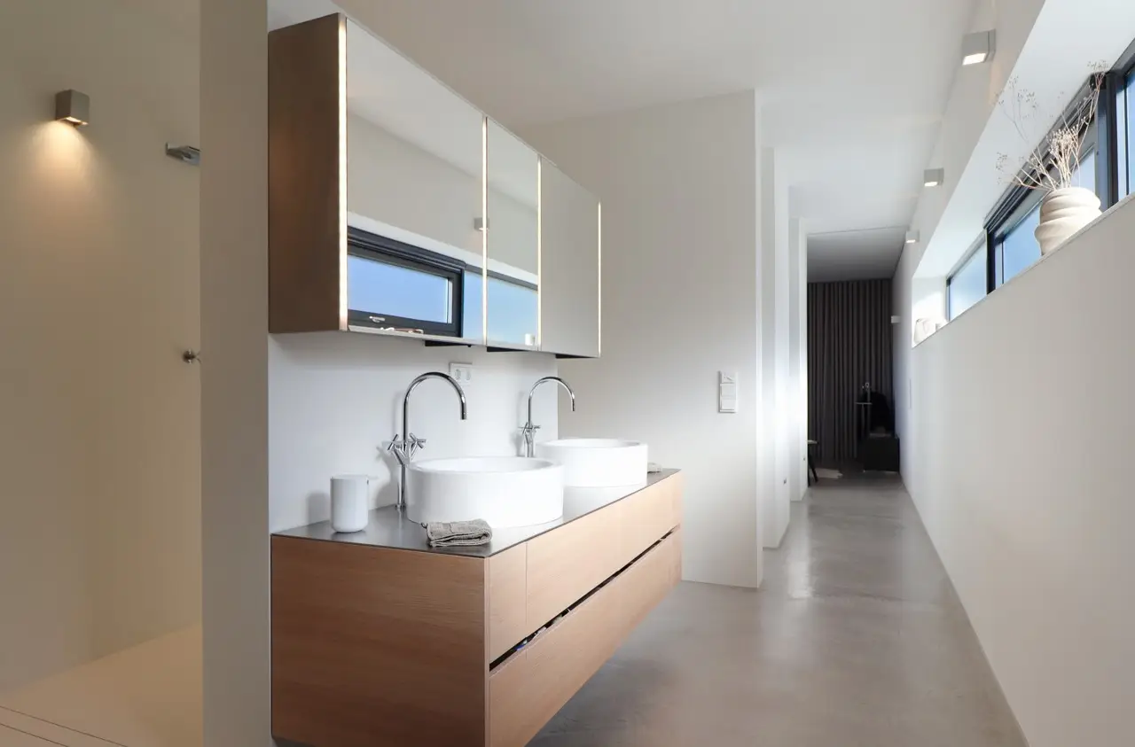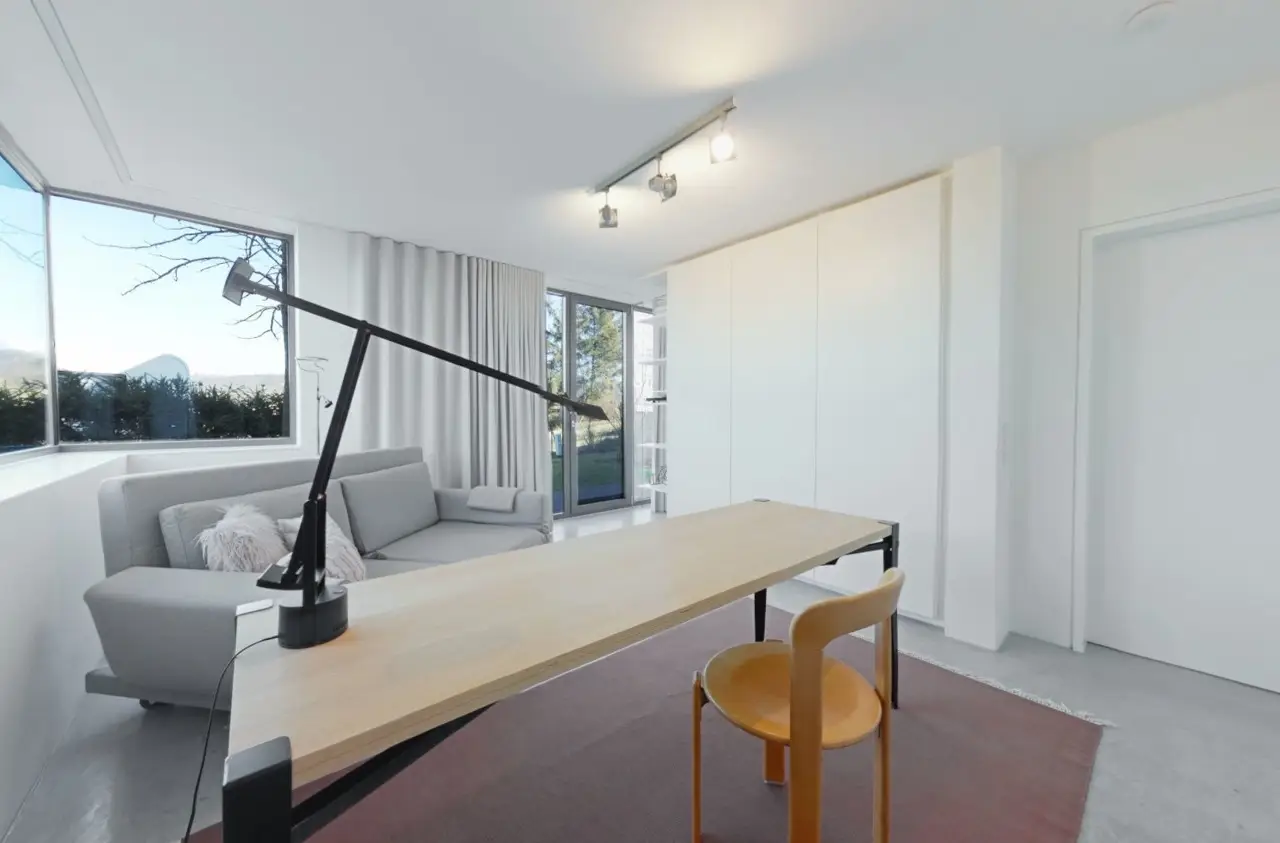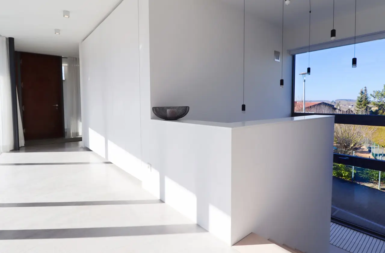 Property with a "conscience" A spacious and luxuriously furnished villa is for sale, which was built in 2006/2007 and has been extensively optimized time and again. It is technically and qualitatively up to date and ready to move into. As soon as you enter the house, you immediately get a feeling of lightness, openness and privacy. This is created by the atrium design combined with extensive window areas, which ensure a natural flood of light and room heights that are extraordinarily generous by local standards (dining area up to 3580 mm, remaining ground floor 2640 mm). Embedded in the "U" of the Atrium house on the ground floor is the beautiful pool surrounded by a large terrace area, which can also be variably extended by a walk-on cover. This is complemented by an integrated barbecue station and an adjacent pond. On the garden level, there is a further terrace area along the living room and bedrooms as well as a beautiful large green area with trees, which offers space for children to play and run around. Last but not least, the attractive kitchen with dining area should be mentioned as the focal point of the house, which invites you to enjoy cooking for yourself as well as "cooking up" with guests. It blends in exceptionally harmoniously with the overall living concept and is superbly equipped. This area is spacious and open to the dining area. A closed fireplace, glazed on two sides, rounds off the overall picture and creates a feel-good atmosphere. The directly adjoining living room can be directly integrated or separated by a floor-to-ceiling sliding door (inside the wall). The entire house is generously equipped with high-quality built-in wardrobes on both the ground floor and the garden level. The plot area is 700 m2. The clever integration of the house into the gentle slope, the garden-side window façade open to nature and the optimal garden design create a unique connection with the directly adjacent natural surroundings. The garden was designed in collaboration with a garden architect. The garden is equipped with a modern, fully automatic irrigation and sprinkler system for all beds and lawns as well as a lighting system controlled by motion detectors. Interested? We would be happy to provide you with a detailed exposé with further information on request. We would be happy to arrange a viewing and present this outstanding property to you in person. Get in touch with us!