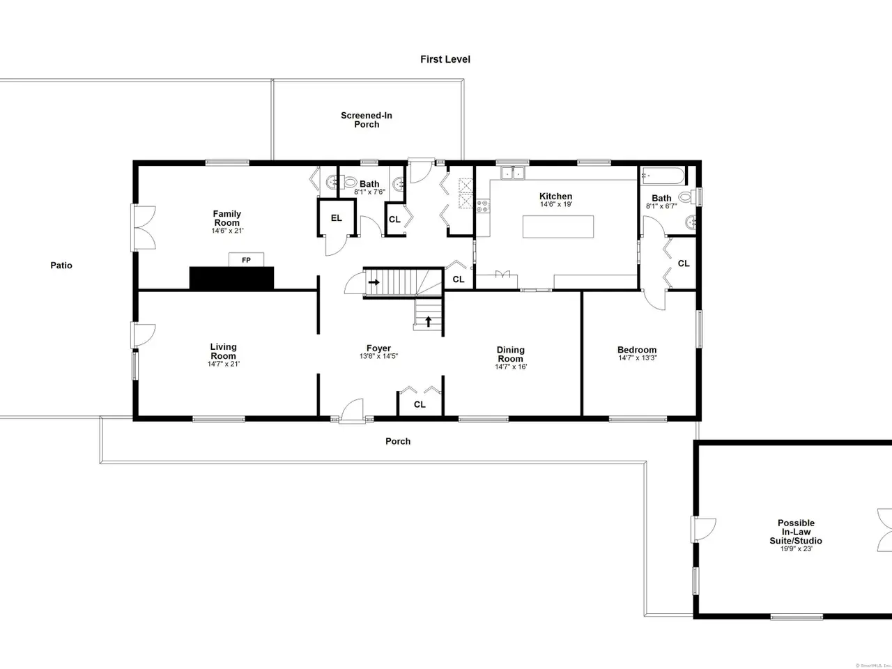 Opportunity Awaits! Bring your vision to this COLONIAL in desirable New Canaan. Potential for customization is limitless. Gorgeous 2 park-like acres with pond access and aerator welcomes you. Property features a peaceful yard, mature shade trees that line the driveway and lend privacy. Picturesque walking/biking community where neighbors gather. Wrap around porch invites you to sit, read, chat leisurely. Large foyer leads you to ample living spaces including; kitchen with island, dining room, living room and family room w/ wood burning brick fireplace. Three season porch. French doors to stone patio for dining al fresco. First floor guestroom w/ en-suite. Upstairs; 4 additional bedrooms, balcony, 2 hall baths and a Primary en-suite. Baths are finished with neutral colored tiles. Four garage bays total; 2 car attached garage and additional detached 2 car garage with bonus finished space above- perfect for home office, studio, gym, multi-generational living. Storage space abounds. Central Air to keep you cool. With its adaptable layout and prime location, this home presents a rare opportunity of convenience and possibility. Close to award winning New Canaan Schools, main commuting roads, Metro-North train, the Silvermine Art Guild and only a few minutes to shopping too! This home has a great floor plan to enjoy entertaining and everyday living. Portable generator to keep you running if ever needed. Untapped potential. Perfect to renovate into your dream home. Floor Plans are approximate.