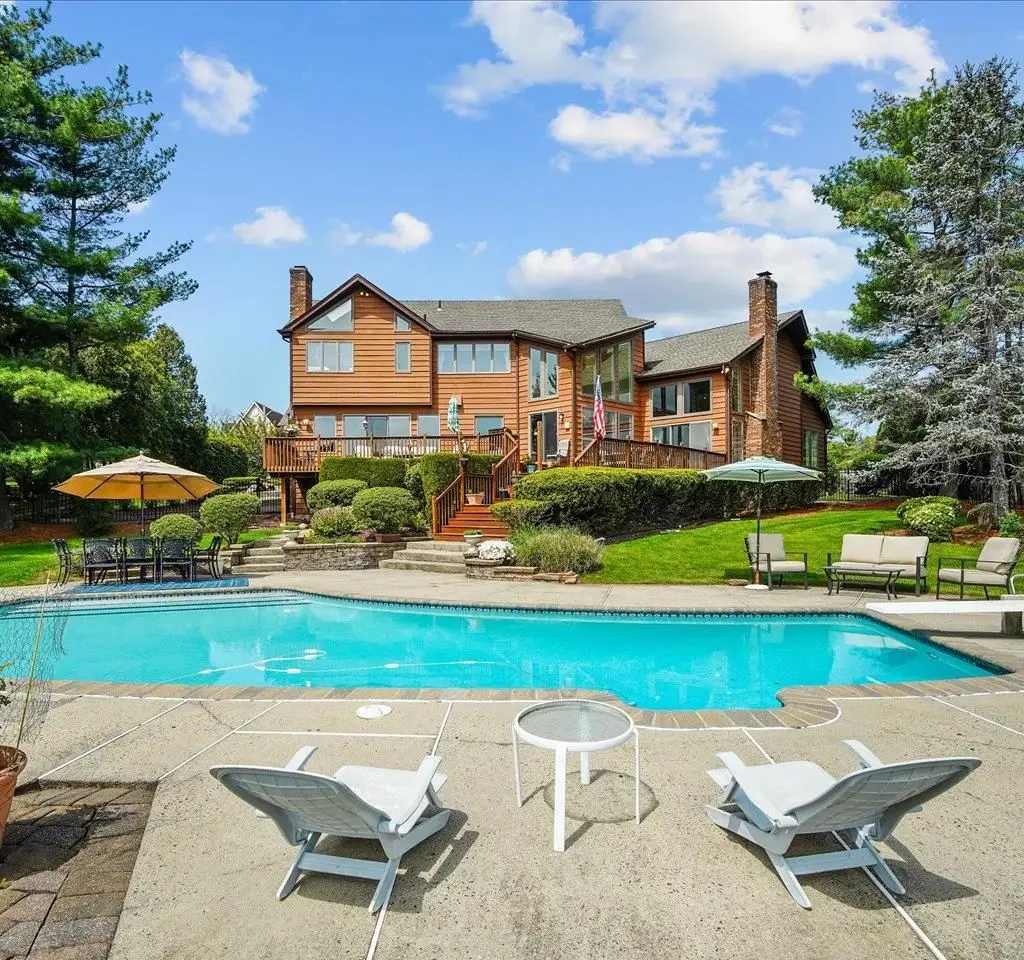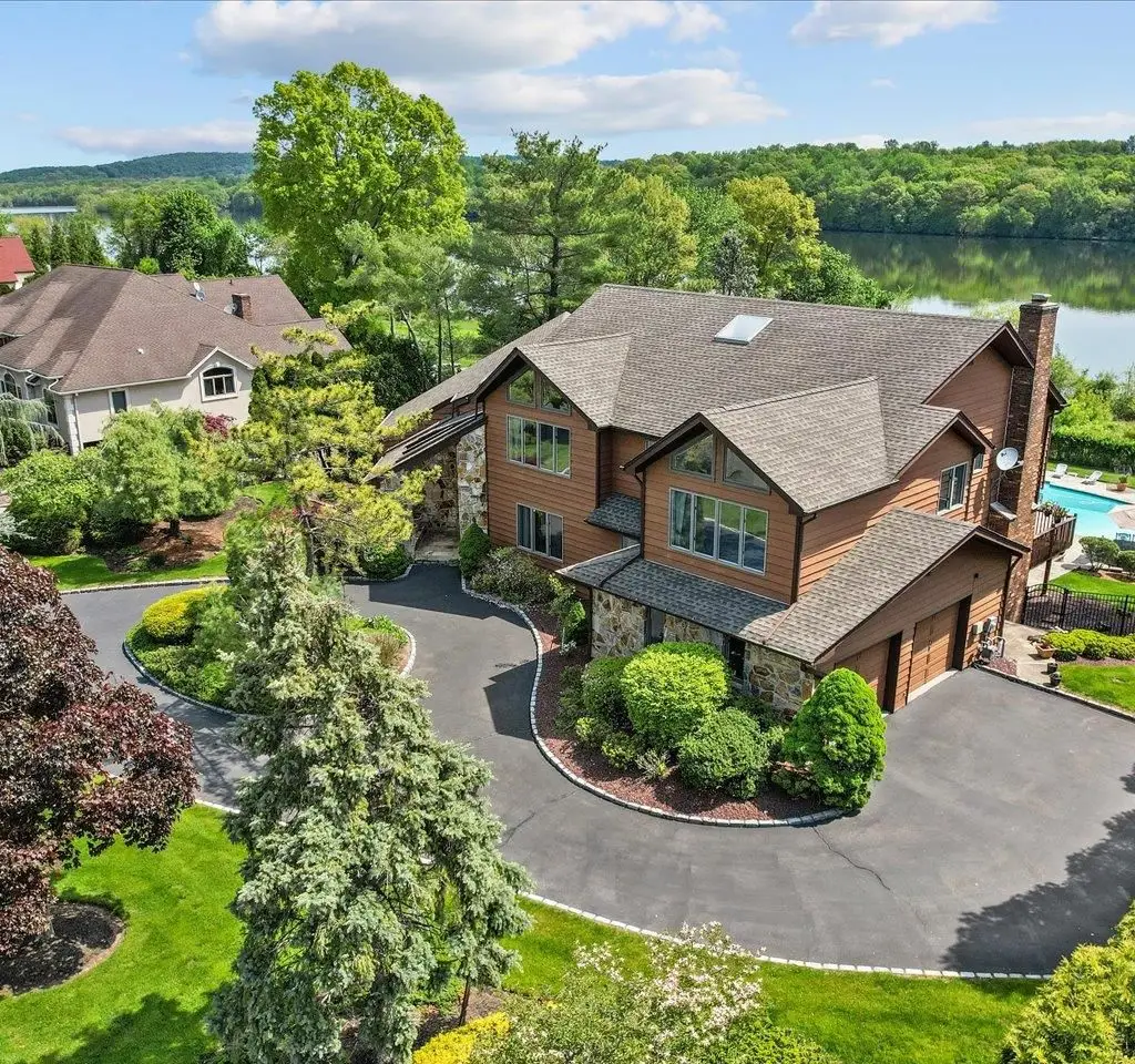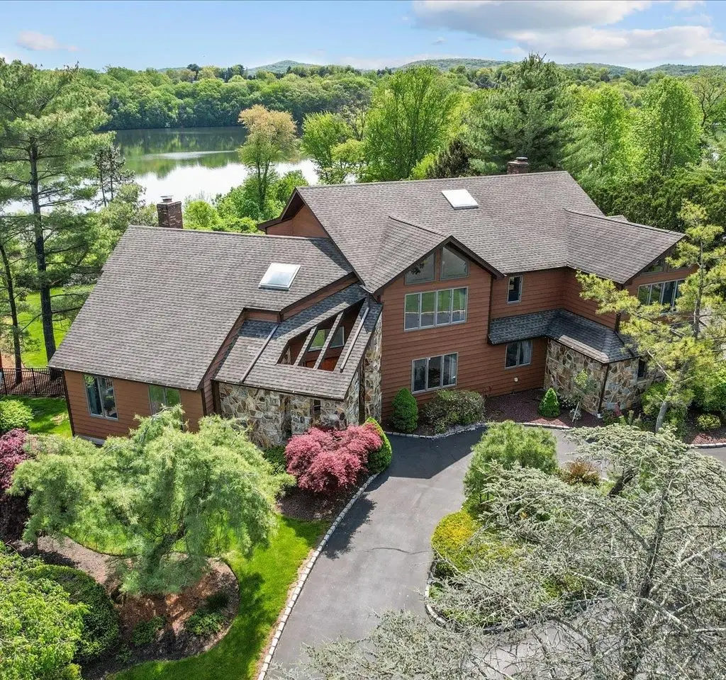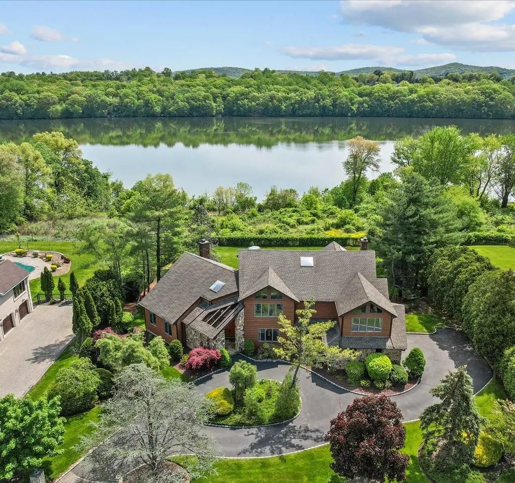 From a renowned local builder, in the exclusive private cul-de-sac of Fieldstone Court, this contemporary colonial overlooks the serene Lake Deforest. Boasting 5 bedrooms, 5 baths, an open design, spacious patio & in-ground pool, this home sits on .69 of an acre of finely landscaped grounds, with lake views throughout the home year round. Step inside to a grand atrium that flows effortlessly into dual living rooms united by a wet bar perfect for hosting. The expansive dining room, is adorned with two sets of French doors. The spacious kitchen boasts a dine-in area, high-top bar, Culligan water purification system, garbage compactor, and a versatile island equipped with an additional sink, built-in grill top, and food processor-all opening to the generous porch and poolside retreat. Cozy up at one of the two fireplaces and enjoy this vacation style home. The basement includes another estimated 1800 sqft of space with walk out access to the patio and pool. Additionally, the garage is wired for EV charging! Ideal for commuters, the breathtaking views will make you forget you're just minutes away from New York City. New City features award winning schools, fine dining experiences, shopping, outdoor activities, local parks, and easy access to major highways for an easy commute to anywhere.