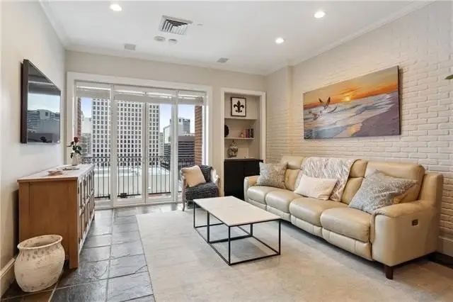 Experience elevated New Orleans city living in this stunning 10th-floor corner unit, boasting a private balcony with breathtaking views of the downtown skyline. Thoughtfully designed with custom cypress kitchen cabinetry, honed granite countertops and a sleek Sub-Zero refrigerator, this home exudes sophistication. The charm continues with painted brick accents, slate flooring and an abundance of natural light streaming through expansive windows in both bedrooms. The private primary suite features a spacious frameless glass shower and generous closet space. With an unbeatable location across from Lafayette Square, residents enjoy luxury amenities, including 24-hour security and concierge services, multiple elegant community spaces, a state-of-the-art gym, an indoor lap pool, two garage parking spaces, a temperature controlled storage unit, and a backup generator—all with the added benefit of low utility costs. A rare opportunity for luxury, comfort, and convenience in the heart of downtown New Orleans!