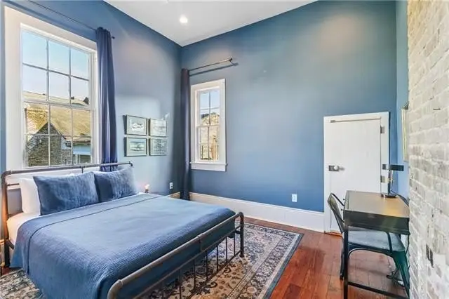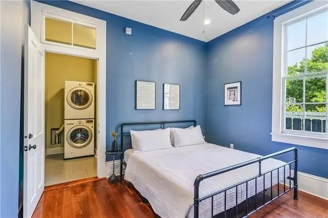 Welcome home to an elegant oasis in the Lower Garden District, steps to Magazine, Coliseum Square and St. Charles Avenue. Meticulous attention was given to both the indoor and outdoor living space. A warm porch with a swing and new custom aluminum shutters welcomes you into a home with 13' ceilings, allowing in ample natural light throughout. An expansive living space, with walls perfect for displaying your artwork, completed with a full bathroom, cook's kitchen with pantry and additional storage that overlooks the gorgeous galley porch. Brimming with charm, original hardwood floors, exposed brick, antique barn door to separate the kitchen from the living area, and vintage doors throughout. A luxurious primary bedroom, with en-suite bathroom, spacious walk-in closet, and a huge galley balcony with beautiful city views. New roof installed in 2022. Leased solar panels keep the utility bills affordable. The Endless Pool is ideal for both enjoyment and exercise. A thoughtfully designed brick patio is ideal for entertainment, Mardi Gras parties, and crawfish boils. The house can be sold fully furnished for those looking for a truly turnkey home. X flood zone, zoned HU-MU. Currently a double, but can be easily converted into a single home residence.