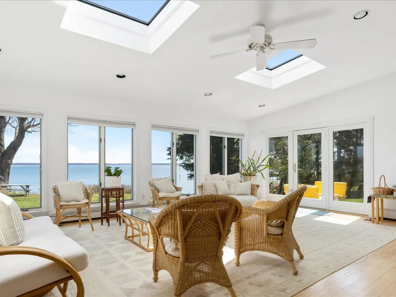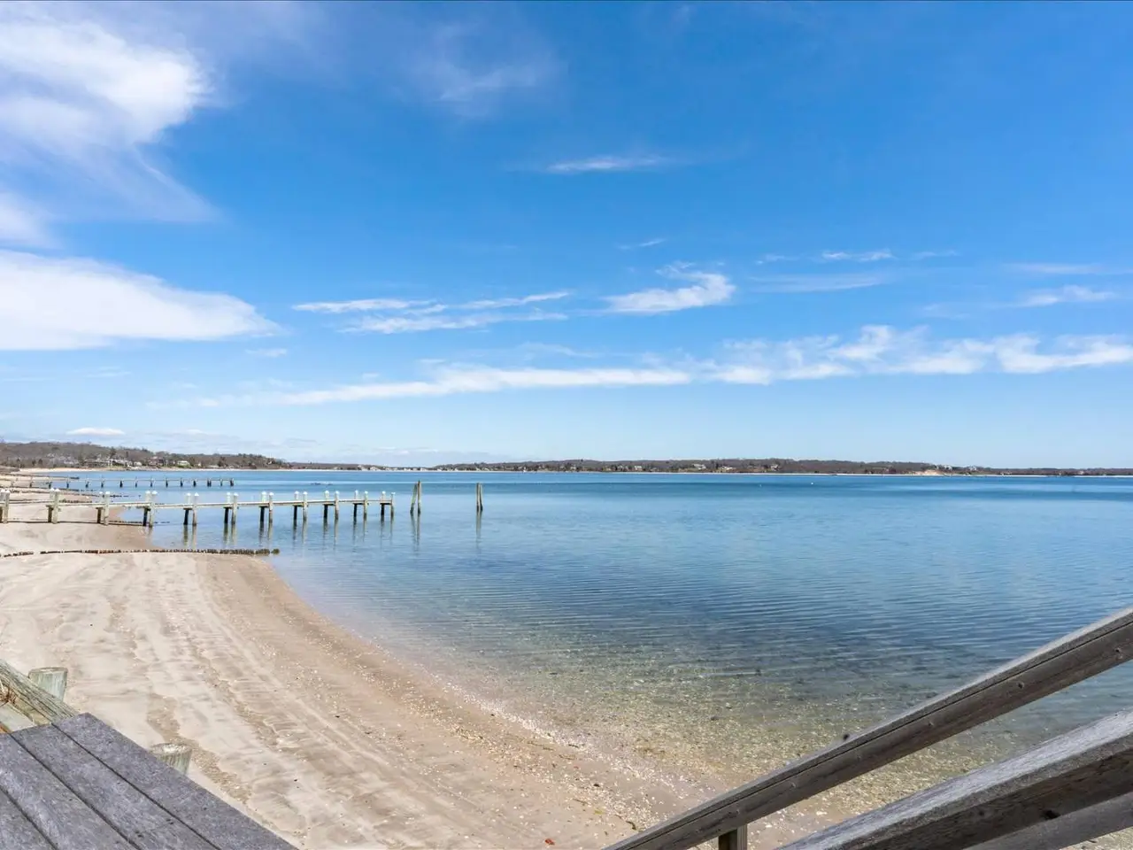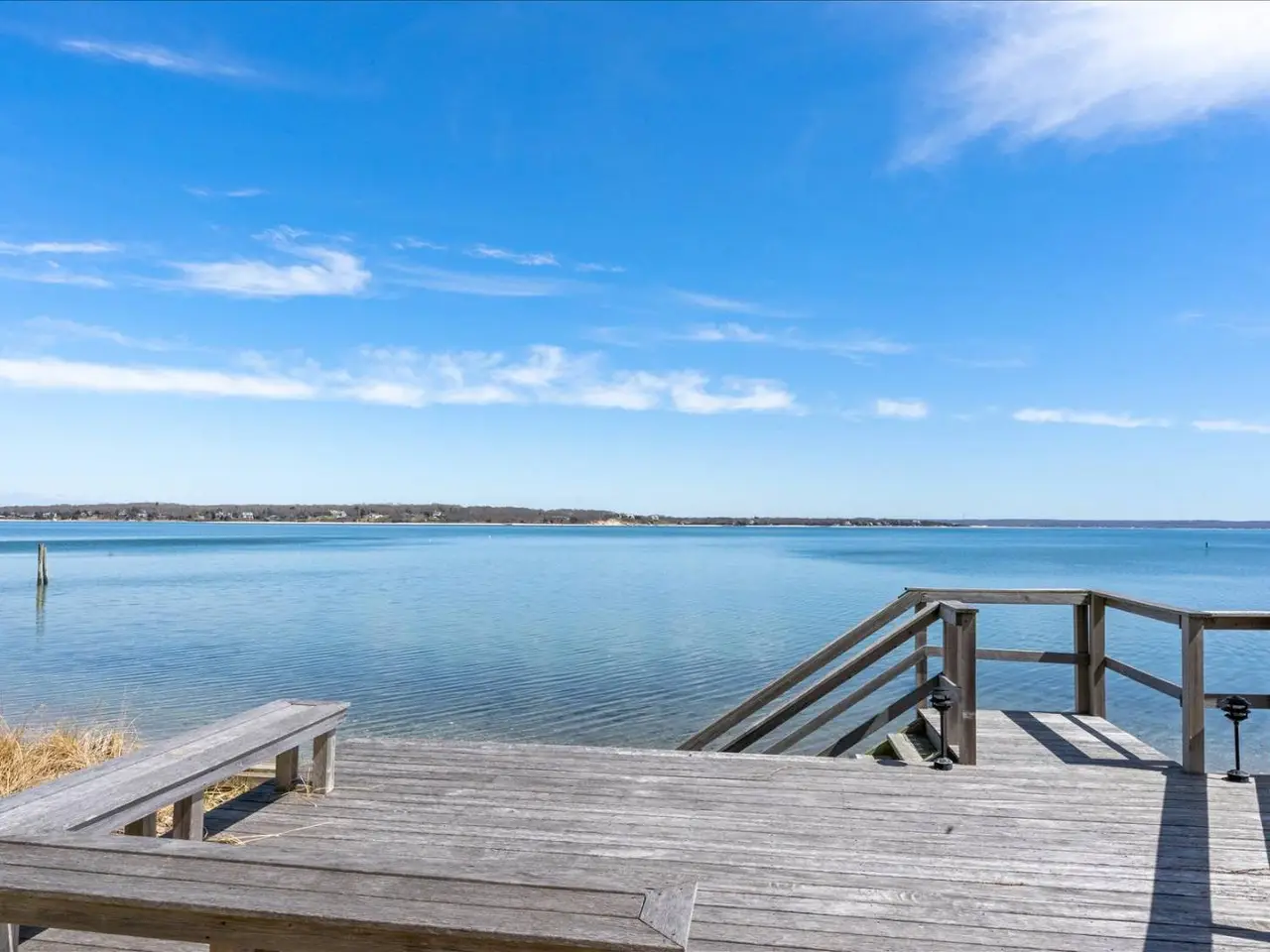 New Suffolk Bayfront - Available winter through April 28 2023, and Fall 2023. Stunning views across Cutchogue Harbor and Peconic Bay will be yours at this spacious beachfront home, whether from the airy, glassed-in great room, the brick patio, or from your beachside deck. Tucked away down a quiet drive, this home offers peace and privacy in historic New Suffolk. There are three bedrooms and two bathrooms upstairs, one bedroom and one bath downstairs, a sitting room with fireplace, full kitchen with breakfast bar, and water views from almost every room. A quintessential North Fork getaway. Listing ID #741545