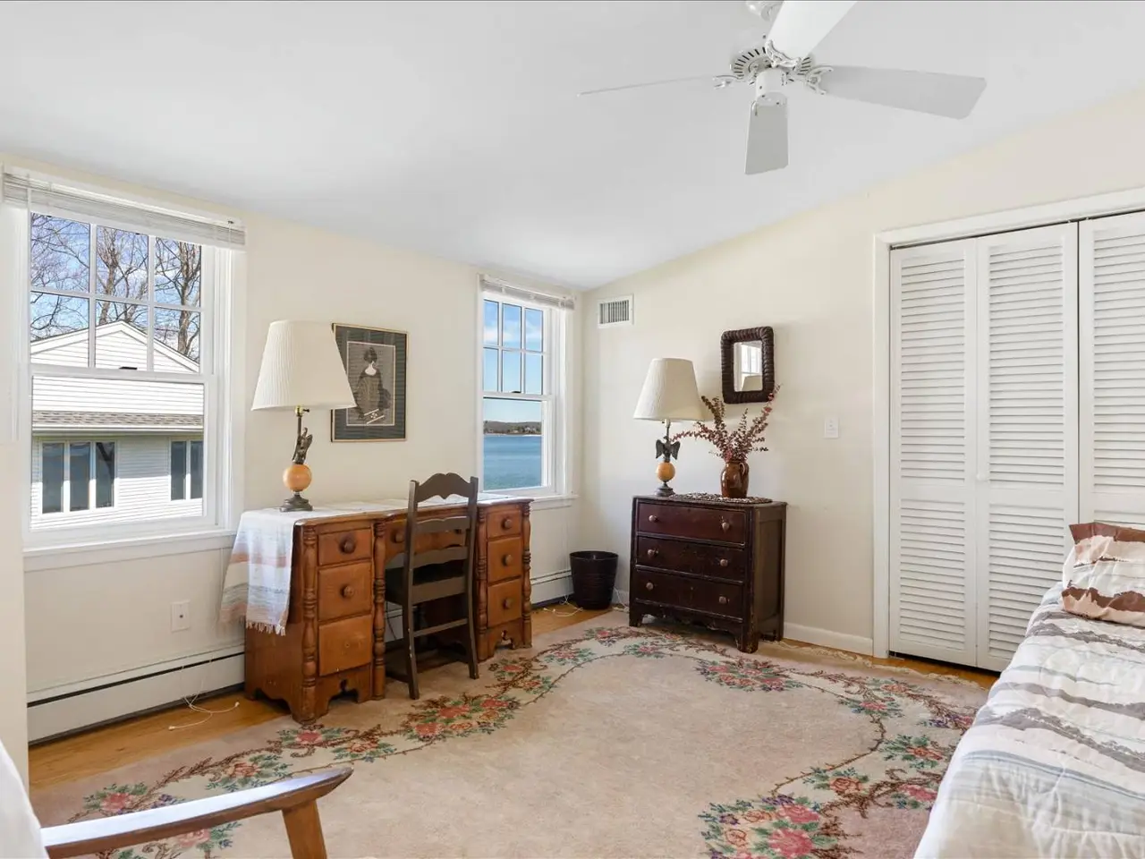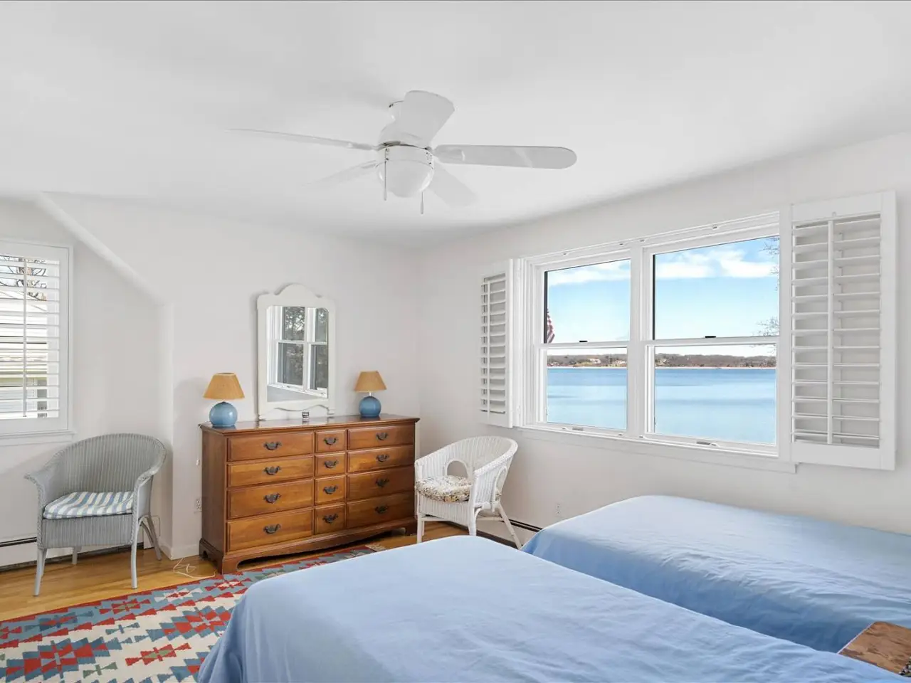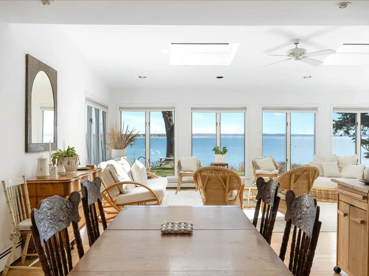 New Suffolk Bayfront - Available winter through April 28 2023, and Fall 2023. Stunning views across Cutchogue Harbor and Peconic Bay will be yours at this spacious beachfront home, whether from the airy, glassed-in great room, the brick patio, or from your beachside deck. Tucked away down a quiet drive, this home offers peace and privacy in historic New Suffolk. There are three bedrooms and two bathrooms upstairs, one bedroom and one bath downstairs, a sitting room with fireplace, full kitchen with breakfast bar, and water views from almost every room. A quintessential North Fork getaway. Listing ID #741545