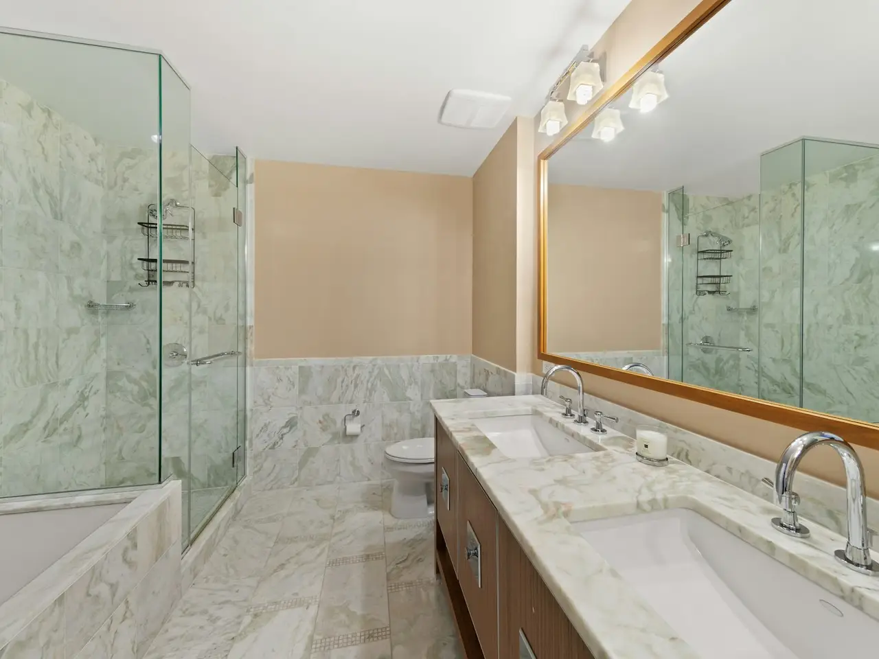 BRIGHT CORNER UNIT WITH RIVER VIEWS! Enjoy lovely sunsets and breathtaking Hudson River views from this beautifully appointed double corner two-bedroom, two-and-a-half bath home bathed in natural light. Facing west and north, this bright and airy apartment features soaring ceilings and dramatic floor-to-ceiling windows that flood the space with light, accentuating the rich Brazilian Cabreuva hardwood floors throughout. This unit is good for entertaining with a renovated open chef's kitchen, Viking appliances and Silestone quartz countertops in warm white. With ample closet space throughout, this residence combines elegance, comfort, and functionality in one of the Upper West Side's most desirable full-service buildings. The generous primary suite offers a tranquil retreat with a custom-designed walk-in-closet, an additional linen closet, and a luxurious en-suite bathroom. Outfitted with marble floors and polished Bianco Verde marble countertops, the spa-like bath features double sinks, a soaking tub, and a separate glass-enclosed stall shower. The second bedroom is equally impressive, with river views, a stylish closet, and a private en-suite bathroom. A chic designer powder room includes a new washer/dryer for ultimate convenience. A monthly reserve contribution of $97.42 and a capital assessment of $250.08 is until June 2027. This full-service condominium offers 24-hour doorman and concierge services, in addition, live-in super, top-of-the-line fitness center, newly renovated resident's lounge with terrace, renovated billiards room, newly renovated media room and playroom. There is a bike room and attached garage. This home is moments from the 1,2,3 subway lines, multiple bus lines, and offers convenient access to the Lincoln Center's cultural, dining and shopping destinations.