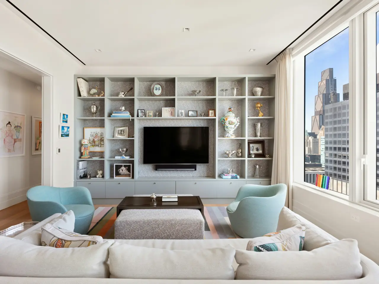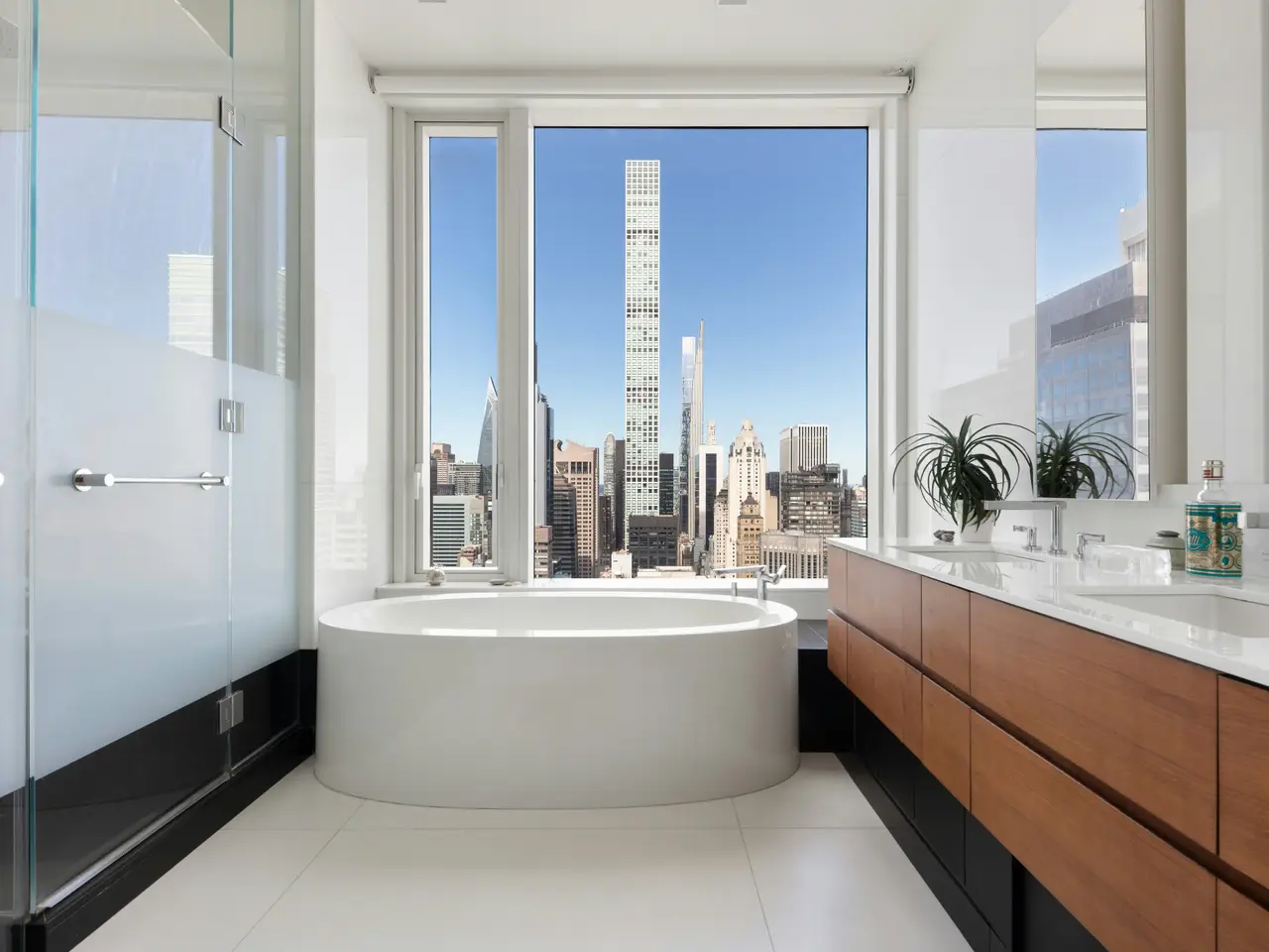 Sculpted by Skidmore, Owings & Merrill with interiors by Daniel Romualdez, 252 East 57th Street was conceived to deliver an exceptional, thoroughly curated way of living. Residence 55A rises to that promise. Framed by the tower's graceful glass curtain wall, this corner 2-bedroom, 2.5-bath home spans approximately 2,621 SF with an 85 SF balcony, capturing sweeping north and west views of the Manhattan skyline, Central Park, and the East River. With only three residences per floor, arrival is discreet and resolutely private. A 30-foot, double-exposure living/dining room wraps the northwest corner beneath 10'6" ceilings, creating a luminous backdrop for daily life and entertaining. The windowed, west-facing eat-in kitchen, custom by Daniel Romualdez and Eggersmann, is appointed with white HanStone glass quartz counters and backsplash, horizontal-grain walnut cabinetry, and a full Miele suite, anchored by a 33" Kohler Stages sink. Adjacent, a glass-lined entertainment room with bar and bespoke built-ins extends the home's gracious entertaining sequence. The primary suite is both secluded and expansive, offering a large walk-in closet and a windowed en-suite bath clad in polished white Nanoglass with radiant-heat floors, a walnut vanity with white glass top, a custom 6-foot soaking tub, glass-enclosed shower, and a glass-enclosed Toto water closet. The corner second bedroom enjoys open city vistas and its own en-suite bath. A gracious gallery, " white oak floors, Central Air, vented Asko washer/dryer, and THG/Dornbracht fittings underscore the home's material rigor and comfort. Residents arrive through a marble-clad, attended 57th-Street lobby or the gated 56th-Street porte cochère with automated parking available (limited; pricing on request). Double-height, glass-wrapped amenities include a 75' pool and spa with hydrotherapy circuit, full fitness (Pilates/spin/yoga), lounges, library, screening and billiards rooms, furnished guest suites, a 70' south terrace, dining/breakfast rooms with catering kitchen, conference room, children's playroom, dog spa, and bike room. Private storage included.