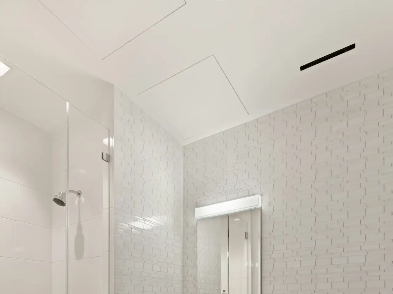 Windowed en-suite bath with polished white Nanoglass and walnut vanity