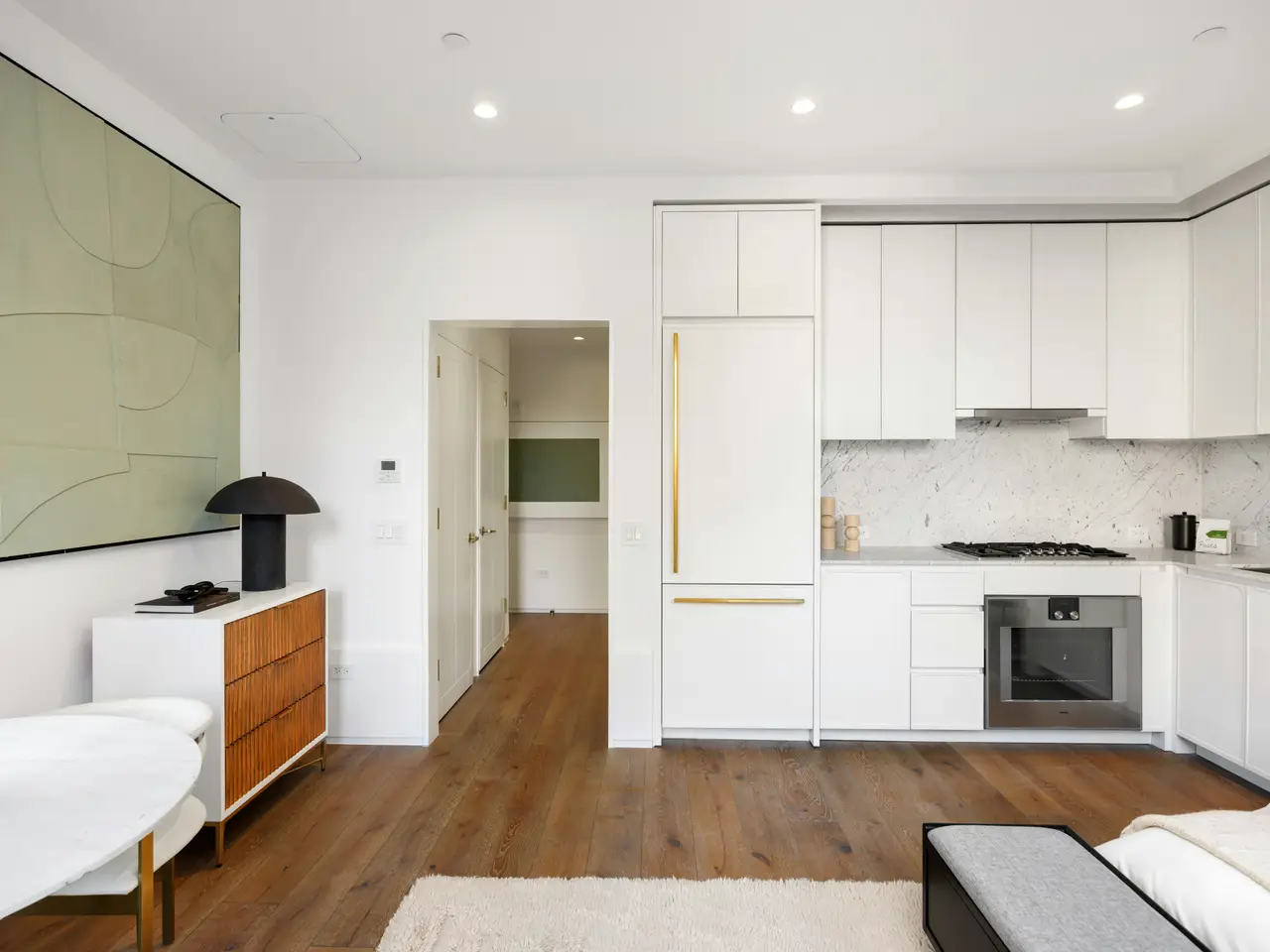 The last sponsor unit with a terrace! This 597 square foot corner studio boasts dramatic 10-foot ceilings, and a 123 square foot private terrace facing North over tree-lined 88th Street. The kitchen was meticulously designed by Molteni & C Dada for DDG, featuring custom white lacquered cabinetry, honed statuary marble slab countertops and backsplash with brass inlays, Fantini fixtures in natural brass, and a full suite of Gaggenau and Bosch appliances. The bathroom features silver travertine slabs, mosaic tile accented floors, oak cabinetry with undermount Duravit sinks and honed Bianco Grigio marble countertop, cove lighting complemented by Fantini fixtures in natural brass, and radiant heated flooring. There are 7.5 inch wide Austrian white oak floors throughout, a formal elliptical entry gallery with coved ceilings, custom wainscoting with baseboard reveals, solid wood interior over 8 foot doors and coved plaster ceilings. The apartment has central air conditioning, and a washer/dryer. 180 East 88th Street is an intimate luxury condominium in the coveted Carnegie Hill neighborhood on the Upper East Side. There are EIGHT above ground floors of amenities including a basketball court and soccer pitch, fitness & yoga studio, residents' lounge with catering kitchen, game room and children's playroom. Storage, bike racks and wine storage within a wine tasting room are available for purchase. There is a full time doorman and concierge, as well as a resident manager. The complete offering terms are in an Offering Plan available from the Sponsor. File No. CD15-0154. Sponsor: 180 East 88th Street Realty LLC, 375 Hudson Street, 12th Floor, New York, NY 10014. Equal Housing Opportunity.