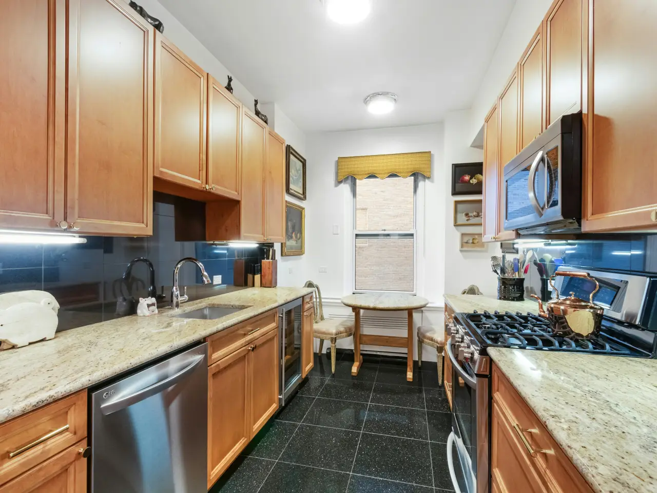Off a semi-private landing, an elegant welcoming gallery connects the living room, dining room, and bedroom hallway. The gracious living room has two impressive oversized windows overlooking Park Avenue. A beautiful wood-burning fireplace with marble mantel serves as the central focal point of the room. High beamed-ceilings, hardwood floors, and prewar details complete this wonderful space. Across the gallery a generous dining room with handsome built-ins and lovely details is ideal for entertaining. The spacious windowed eat-in kitchen has full LG appliances and an ample pantry with washer/dryer and plentiful storage. Beyond the kitchen is a staff room with an en suite windowed bath. Two large bedrooms are off a private hall. The primary is spacious with double windows offering lovely Park Avenue views. A generous dressing area leads to an oversized en suite bath with a tub, separate walk-in shower and sink. The second bedroom is also sizable with great proportions. It has a windowed en suite bath. The apartment has hardwood floors, prewar details, high beamed-ceilings, through-the-wall air conditioning, tremendous closets and storage, and is in very good condition. 975 Park Avenue, built in 1929 is a medium-sized established cooperative with 66 apartments on 16 floors. The building has a 24 hour attended entrance, gym, bike room, private storage, a resident manager and friendly staff. The building is managed by Douglas Elliman Property Management. There is a 2% flip tax.