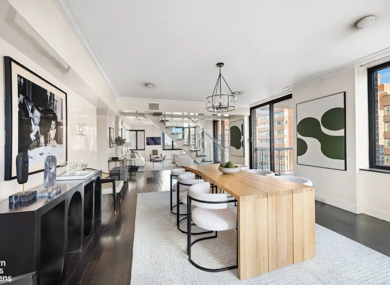 WOW DUPLEX RENTAL ON EAST END AVENUE This expansive 4,107 gross square foot, 12-room duplex offers a rare opportunity to rent one of the most unique homes on the Upper East Side. Featuring 4 bedrooms plus a staff room, 5.5 bathrooms, 2 home offices, 5 balconies, and all 4 exposures, this residence was thoughtfully combined from four apartments to create a layout with abundant storage, grand entertaining spaces, and privacy. Enter through a semi-private vestibule into the impressive 40-foot-wide double living and dining room, anchored by an elegant glass and wood staircase. From the moment you step inside, three exposures and two balconies overlooking East End Avenue fill the home with light. Dark wood floors, crown and base moldings, and oversized windows enhance the residence throughout. The sunny corner eat-in kitchen is fully outfitted with top-of-the-line appliances, including two Wolf ovens, a Wolf six-burner range, Bosch dishwasher, Marvel wine cooler, large Sub-Zero refrigerator, and an additional Sub-Zero mini fridge. A walk-in pantry, ample cabinetry, and space for a large table or island make it ideal for any cook. A powder room and small staff room with private bath complete this level. Upstairs, floor-to-ceiling windows welcome sunlight into a den or media room with open views north toward Carl Schurz Park and east toward the East River. The luxurious primary suite includes a balcony, curved corner windows with southern and eastern exposures, a dressing room, oversized walk-in closets, and a spa-like bathroom with double vanities, a walk-in shower, and a wall of windows. An additional home office is also located within the suite. Three secondary bedrooms, each with en-suite baths, are tucked away along a private hallway. A large laundry room with oversized washer/dryer, a kitchenette, and convenient elevator access are also on this level. Additional features include through-wall air conditioning with thermostatic controls and extensive closet space. 52 East End Avenue is a full-service luxury condominium with a 24-hour doorman/concierge, live-in resident manager, fitness center, central laundry, and bicycle storage. Located just two blocks from Carl Schurz Park and the East River Promenade, with easy access to the Second Avenue Subway, crosstown buses, and the FDR Drive. Pets welcome. Fees: First month's rent: $20,000 One month security deposit: $20,000 Credit check: $150 (per applicant) Move-in deposit (refundable): $1,000 Move-in fee: $300 Initiation fee: $120 Digital submission fee: $65